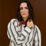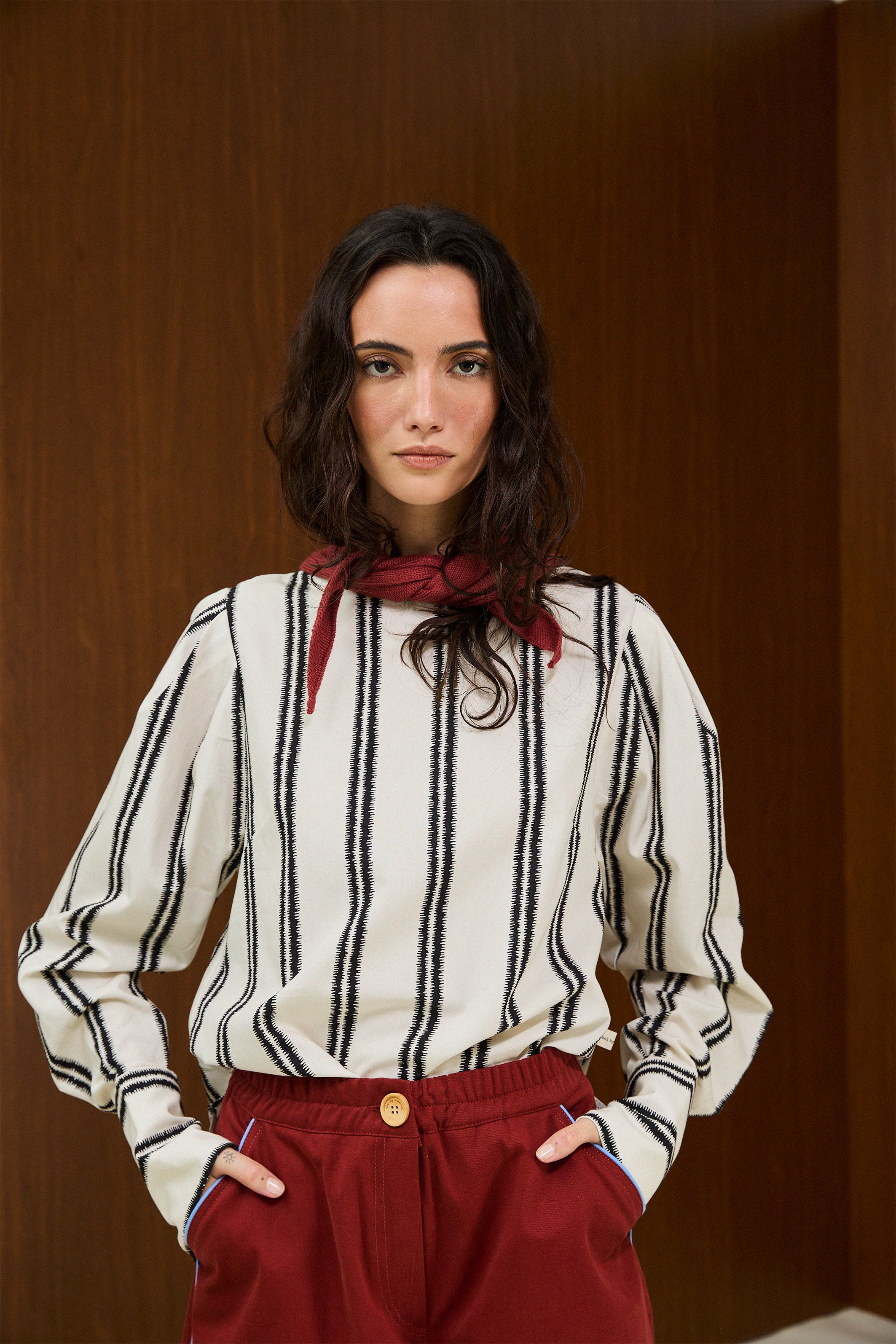 Long-sleeve blouse with vertical black stripes on a cream base. High-low hem with shorter front and longer back. Full button closure at the back.