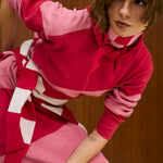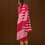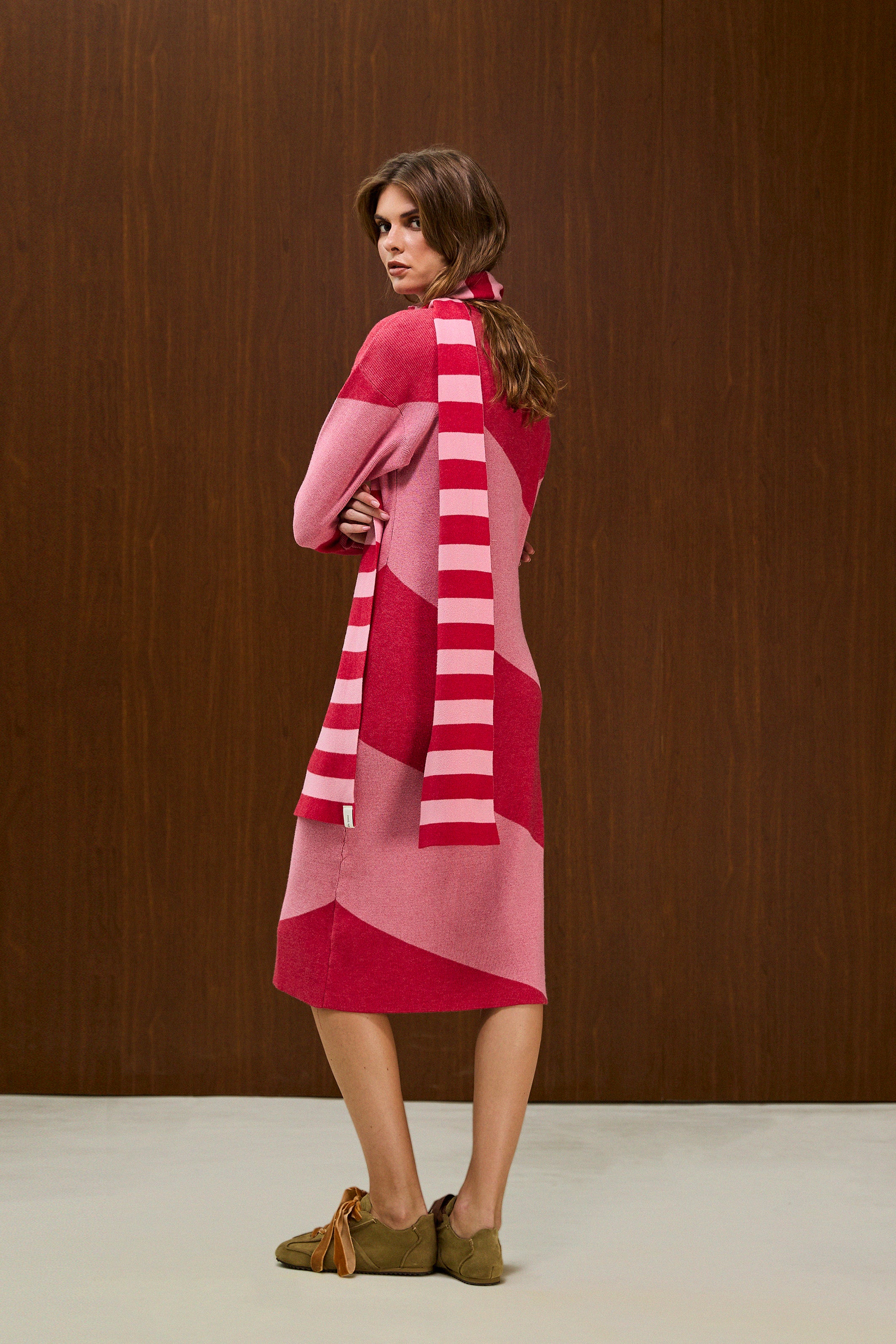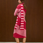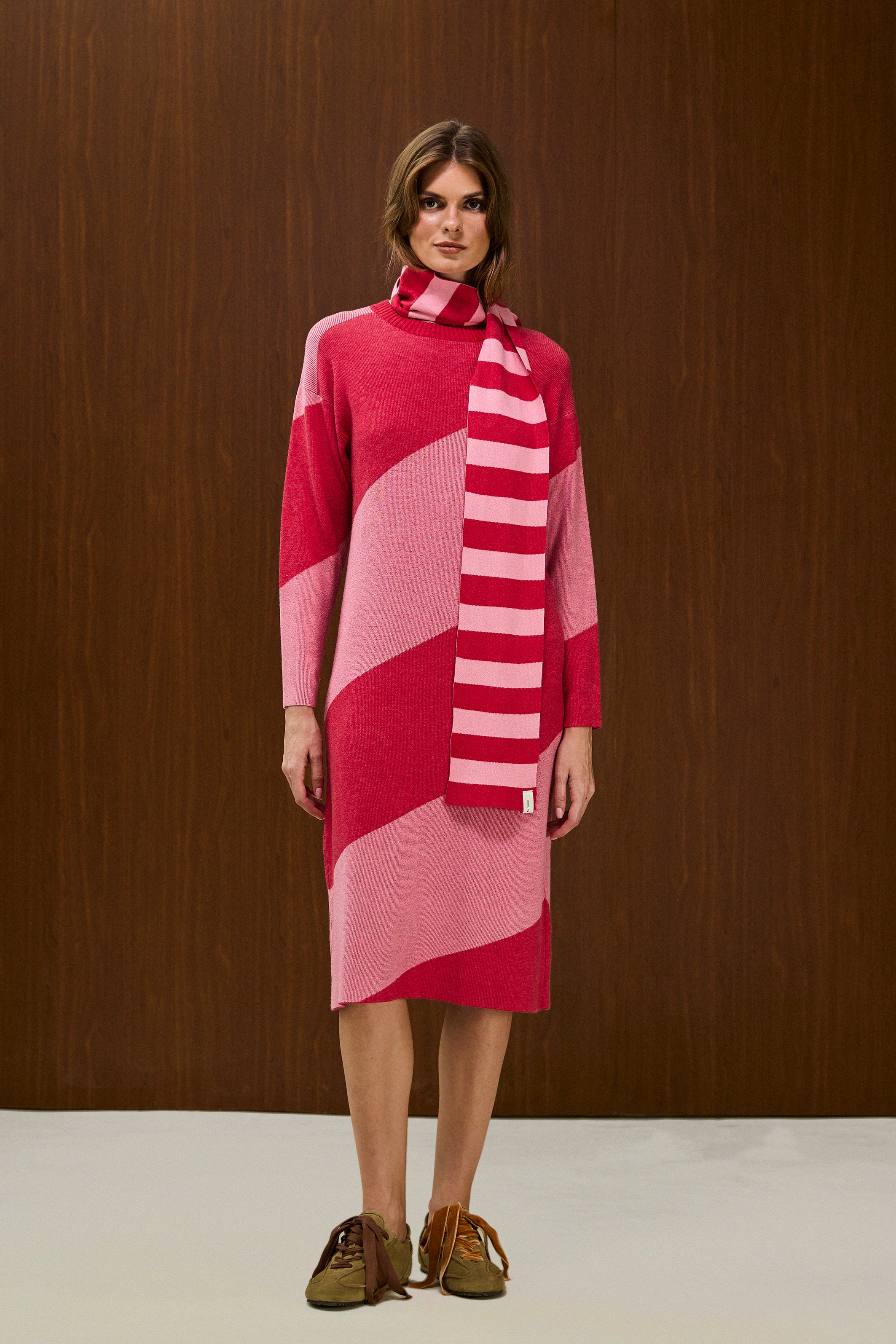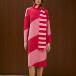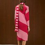 Knit dress with diagonal wide stripes features a crew neckline, long sleeves, and a straight silhouette.