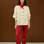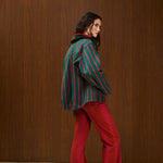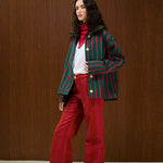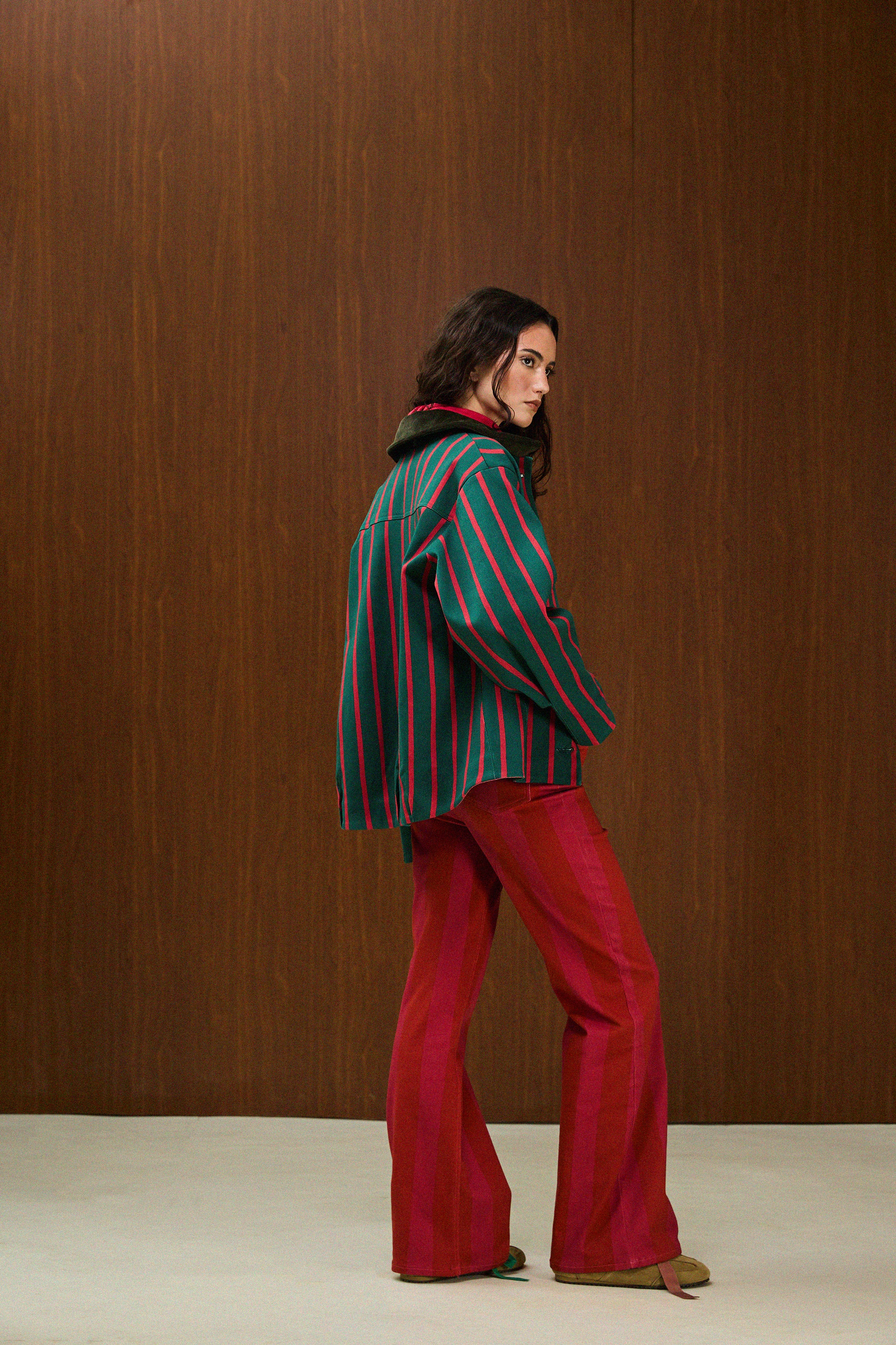 High-waist trousers in bold red and pink vertical stripes. Wide-leg cut with a straight silhouette. Features a front wooden button and zip closure, and classic five-pocket design.
