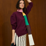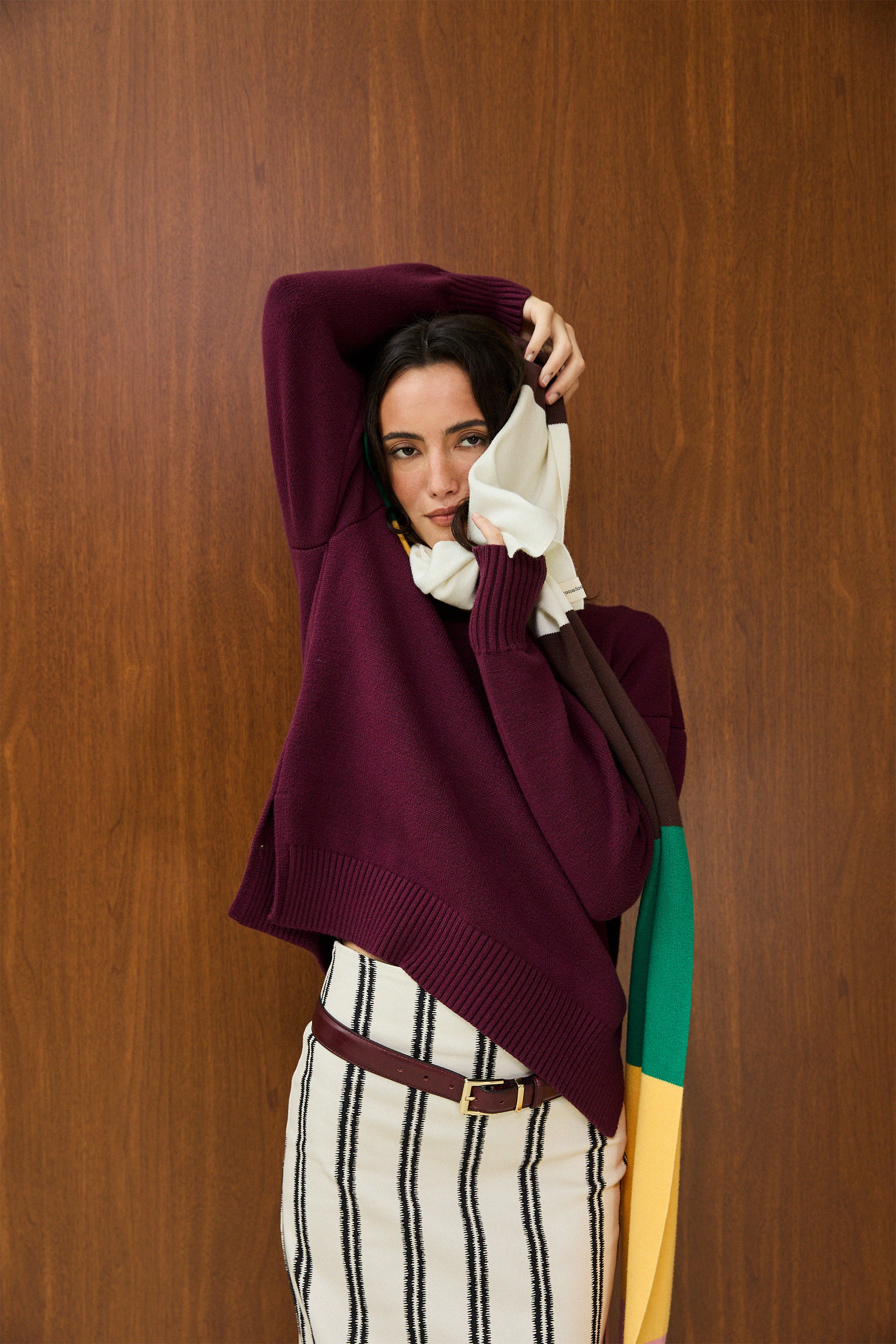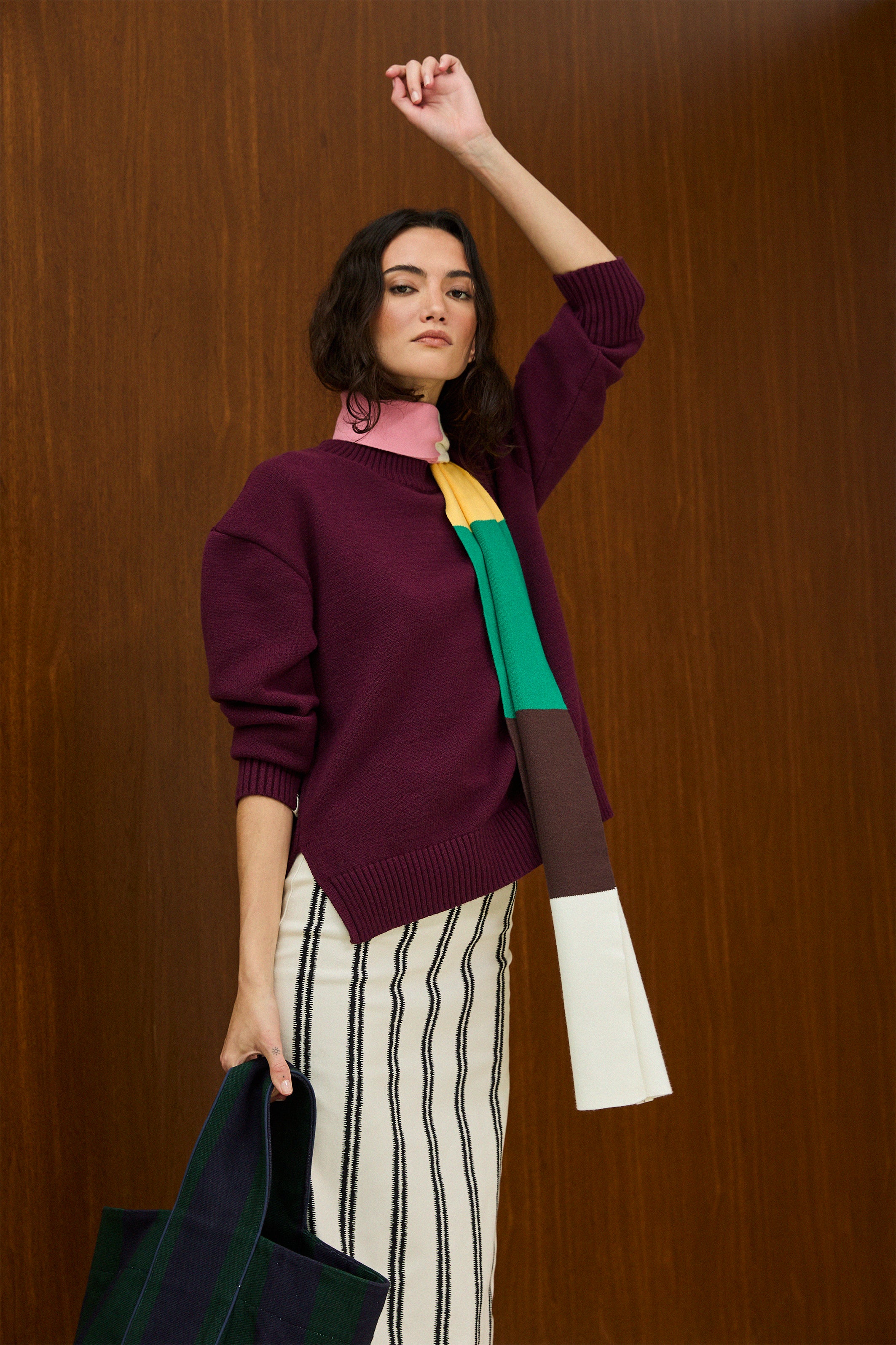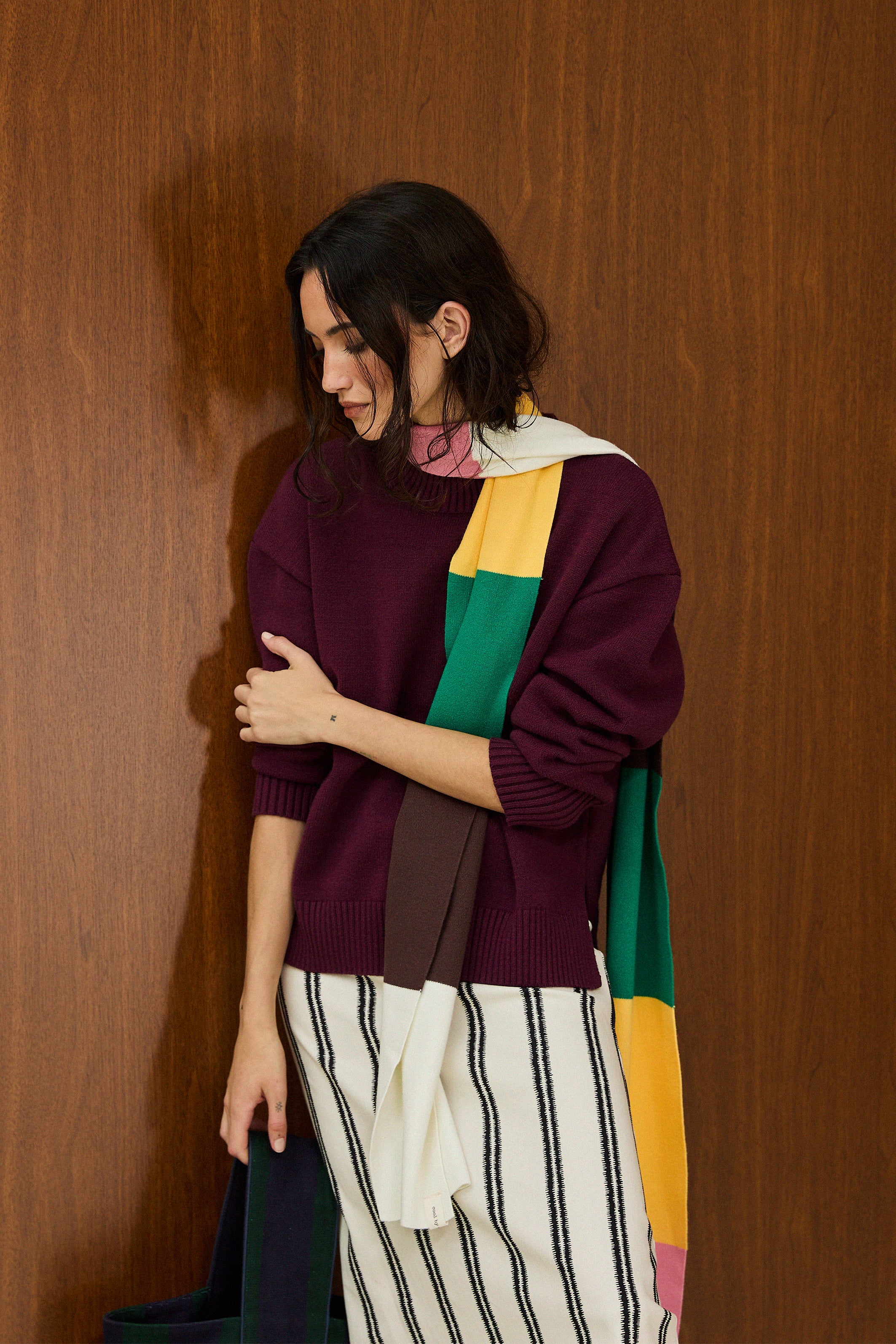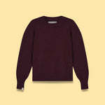 Crew-neck knit sweater with long sleeves, ribbed neckline, cuffs, and hem.