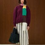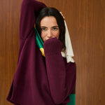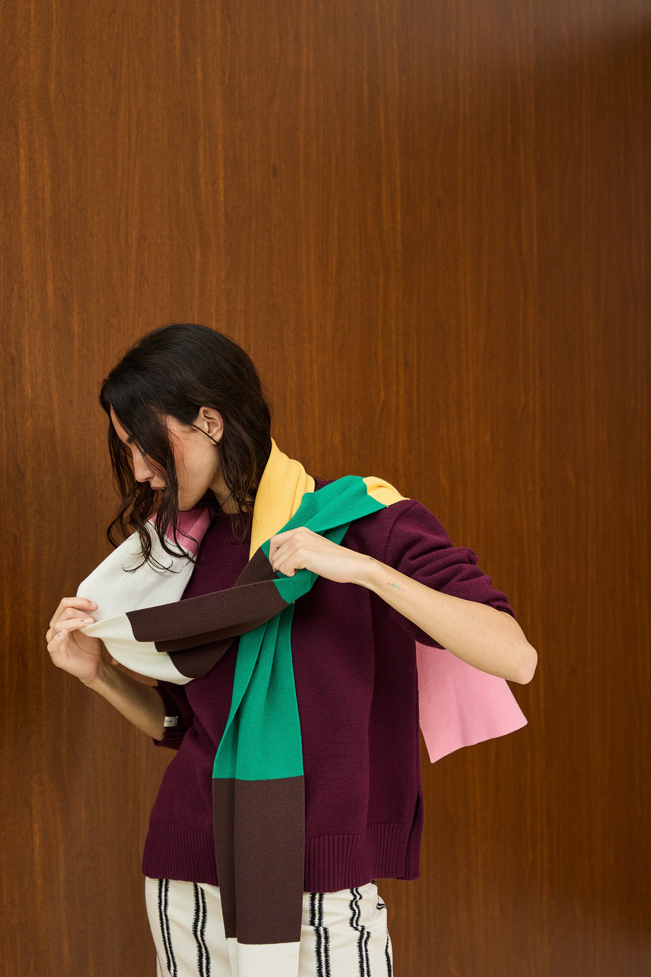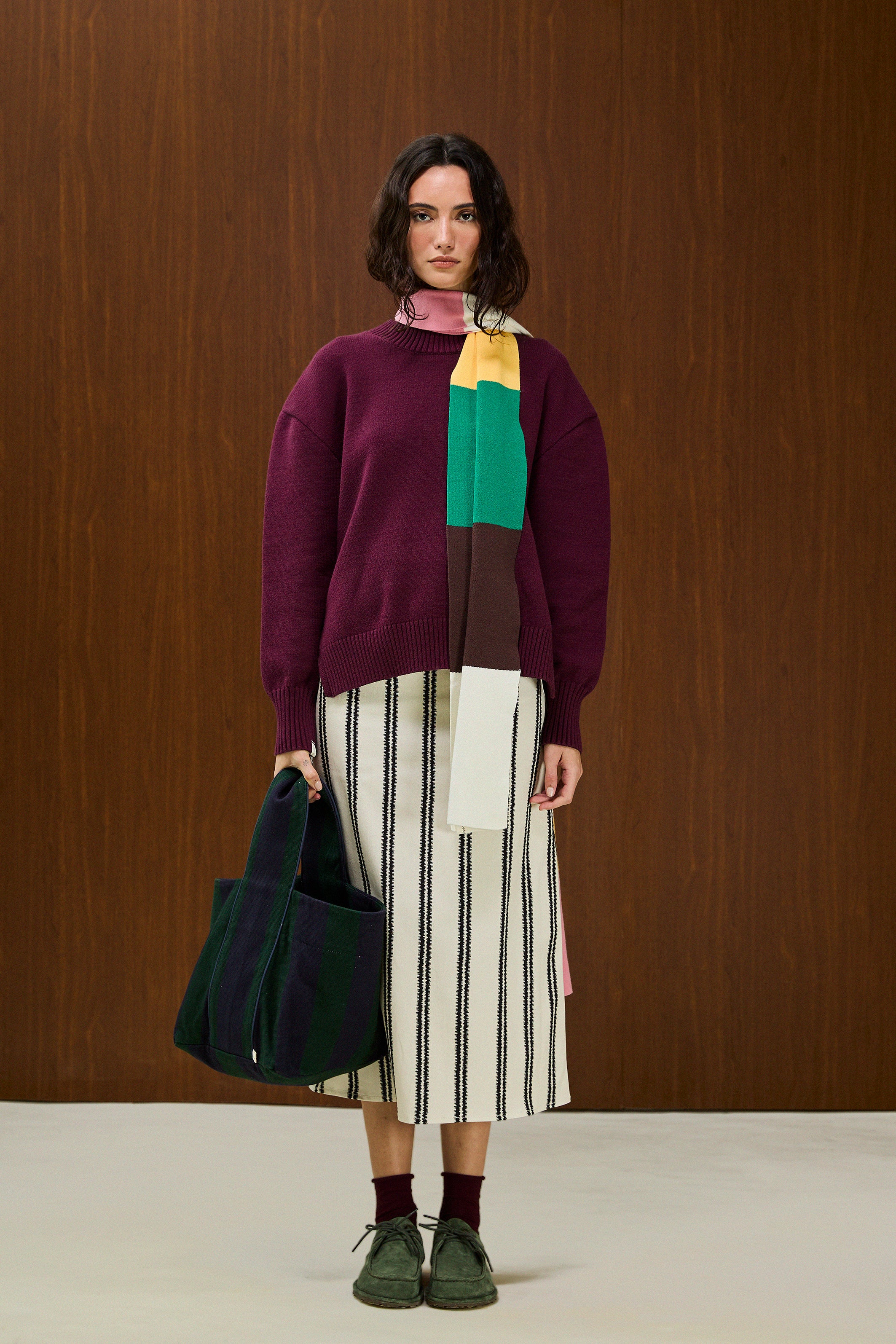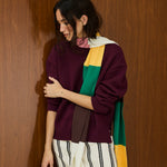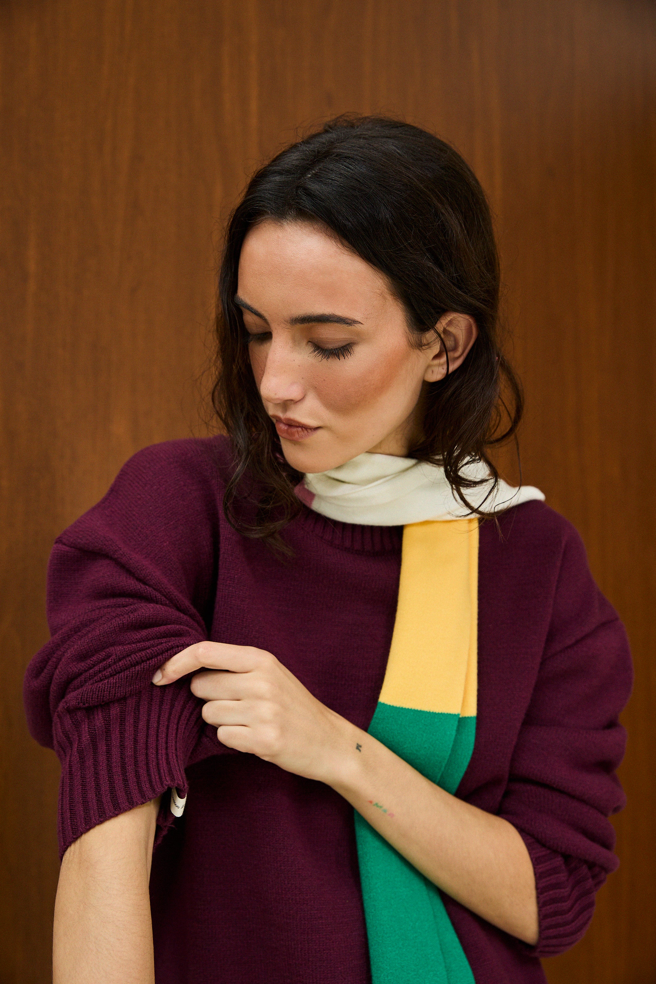 Crew-neck knit sweater with long sleeves, ribbed neckline, cuffs, and hem.