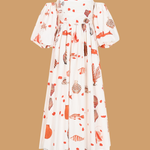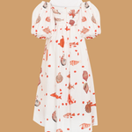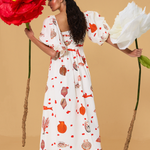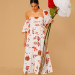 100% cotton. Long dress with low balloon sleeves, open shoulders, and an A-line flared skirt. The model is wearing a size XS.