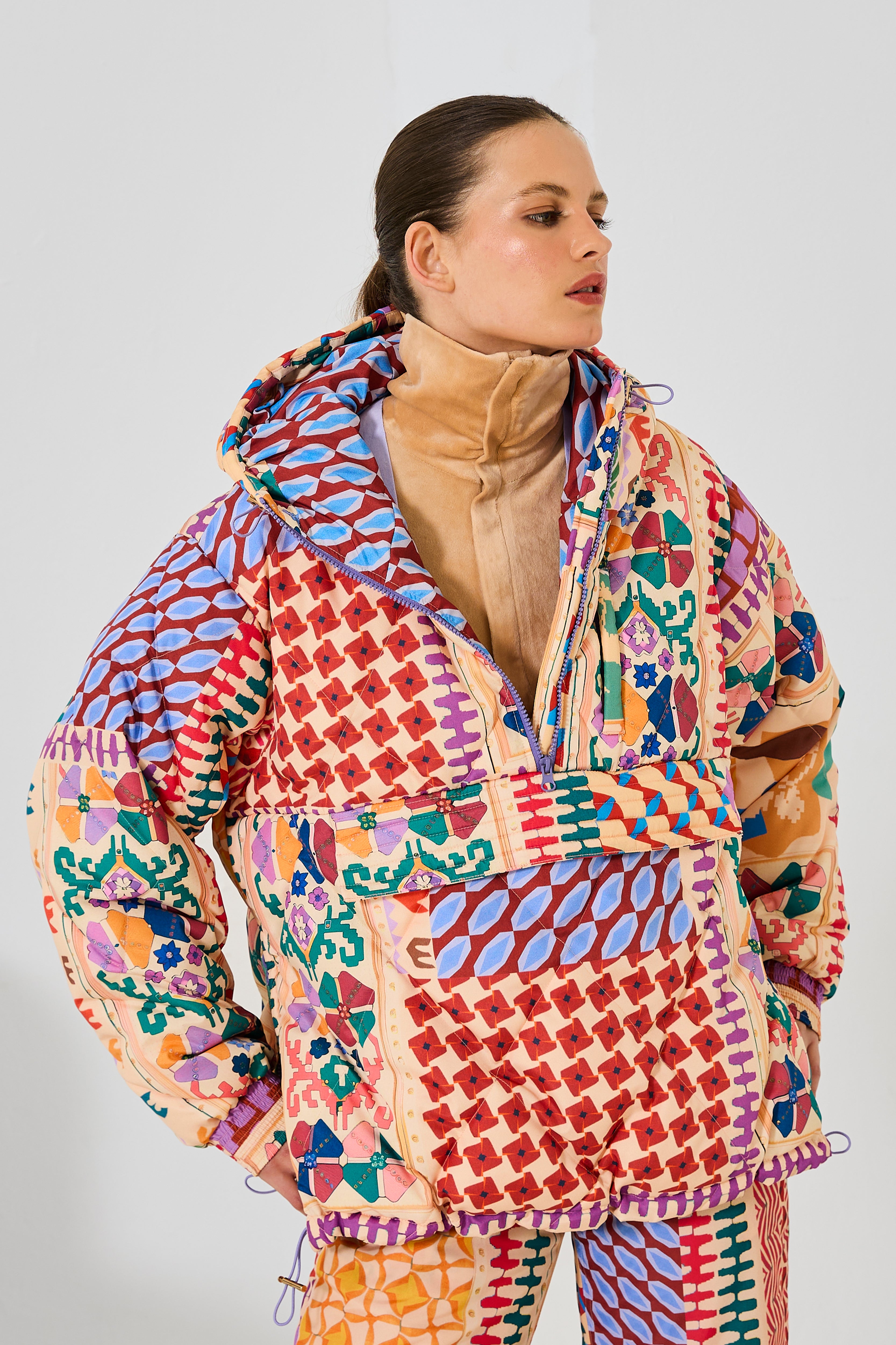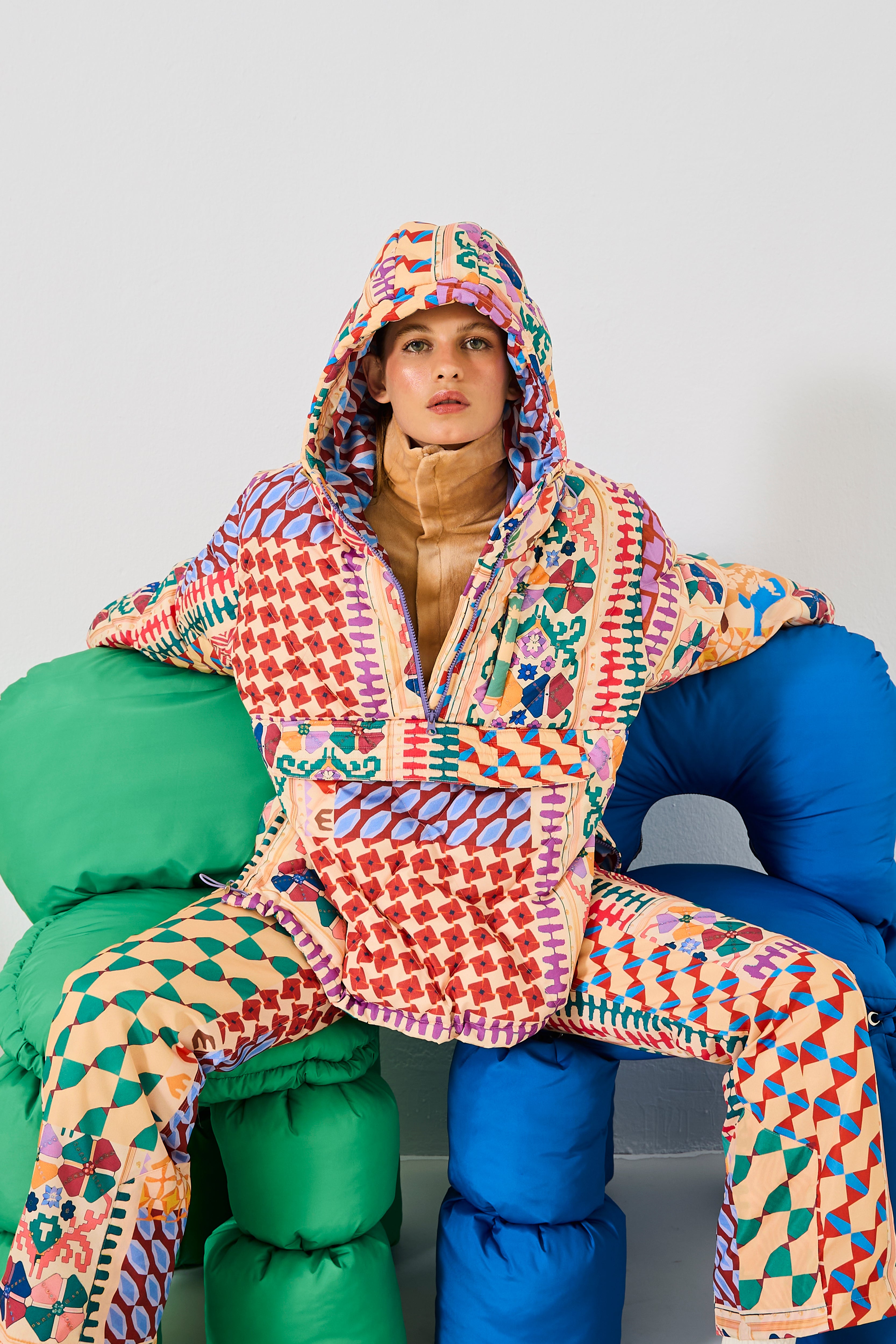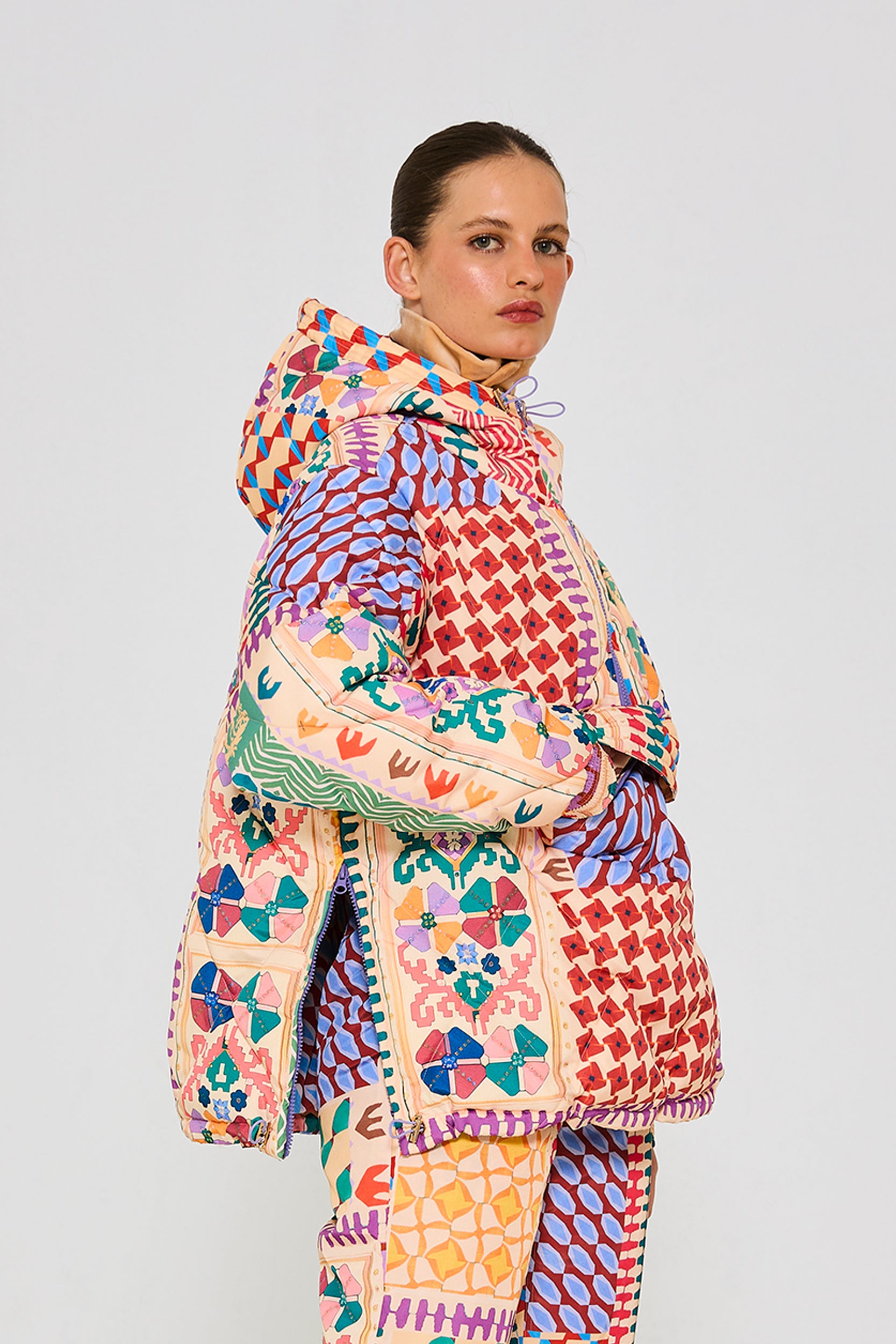 Kanguru cepli, yanları ve ön yakası fermuarlı, kapüşonlu, etek ucu ayarlanabilir lastikli, şehir içi ve kayakta kullanılabilen, rüzgar geçirmez ve su itici kumaş özellikli puffer mont. Modelin üzerindeki 1 bedendir.