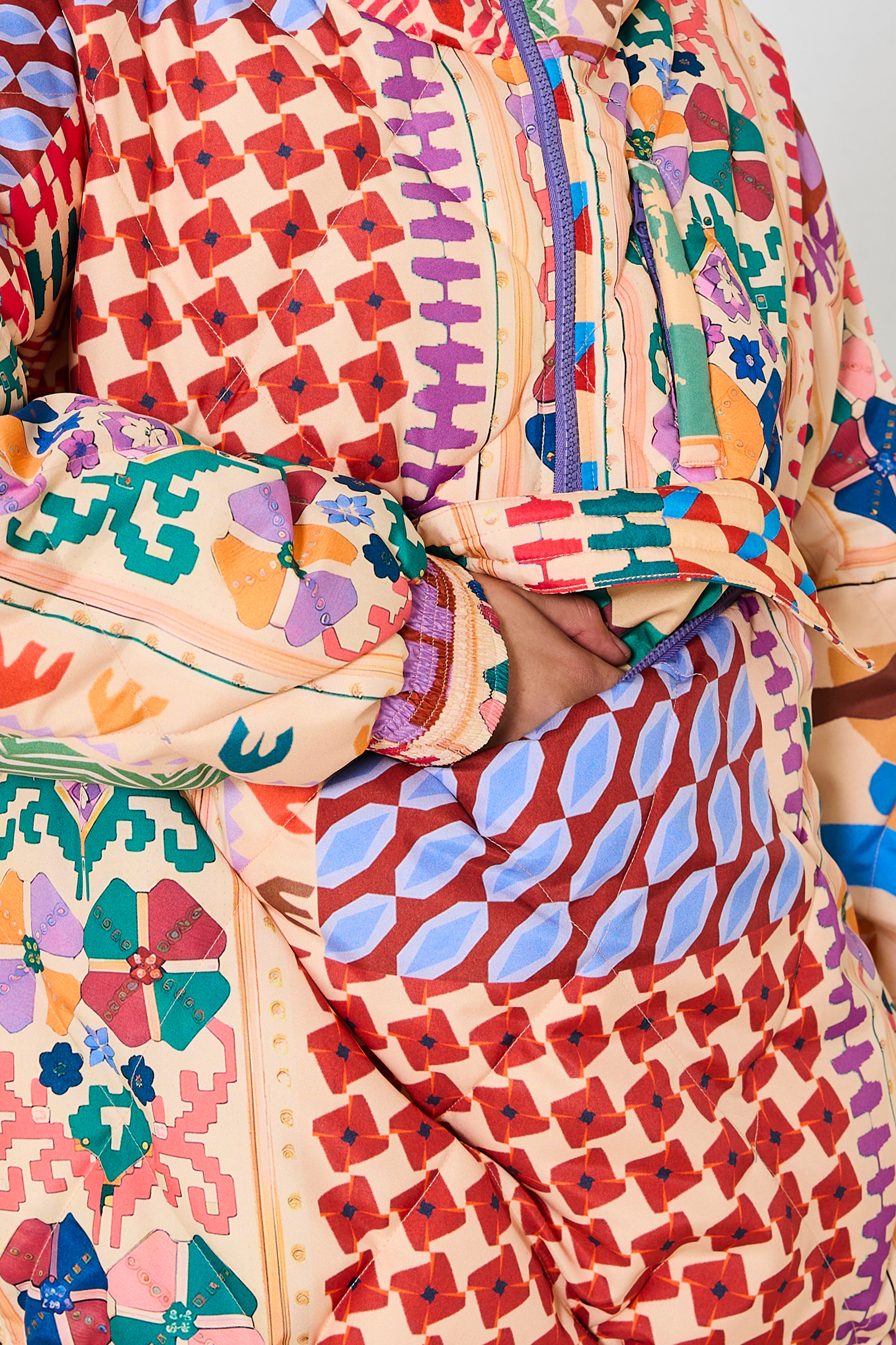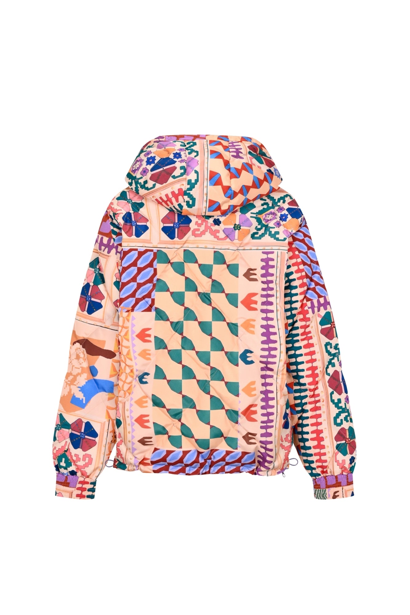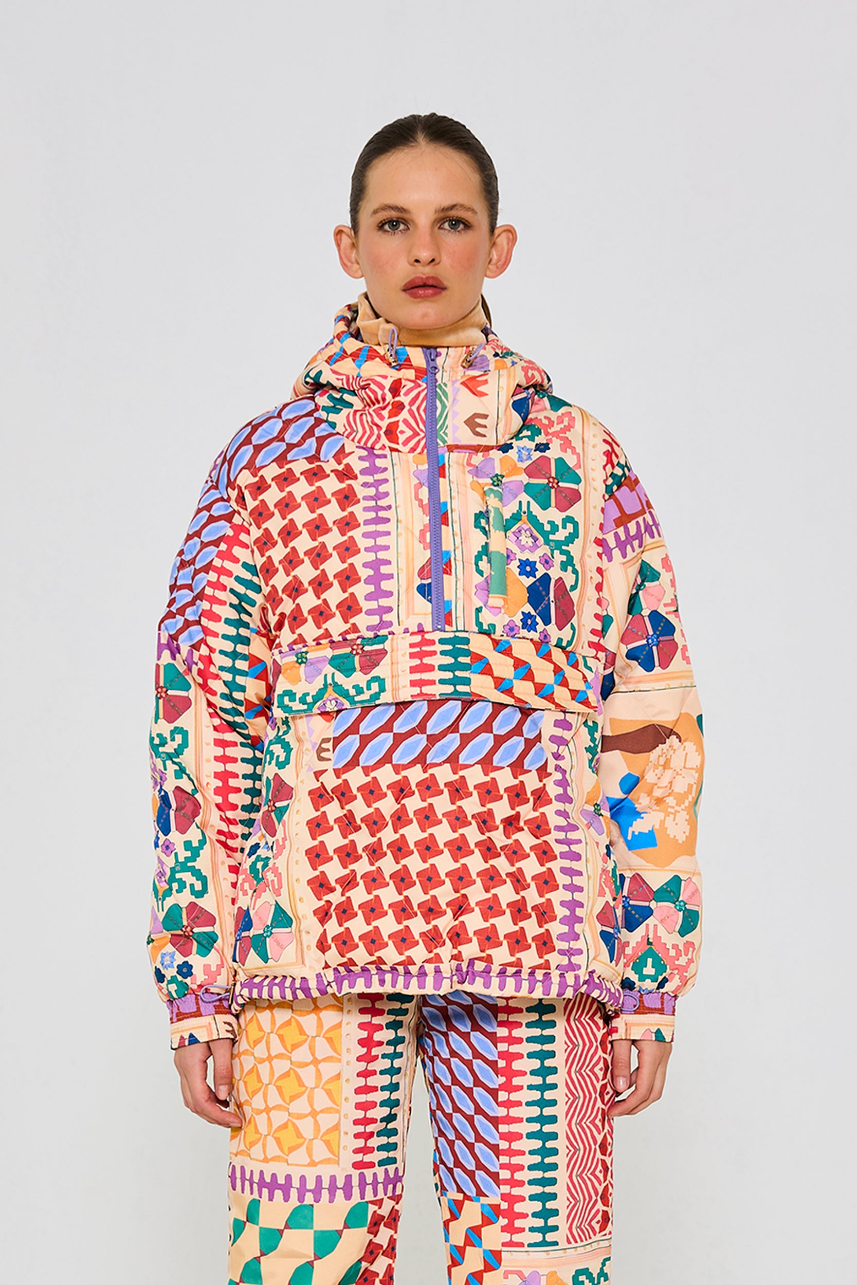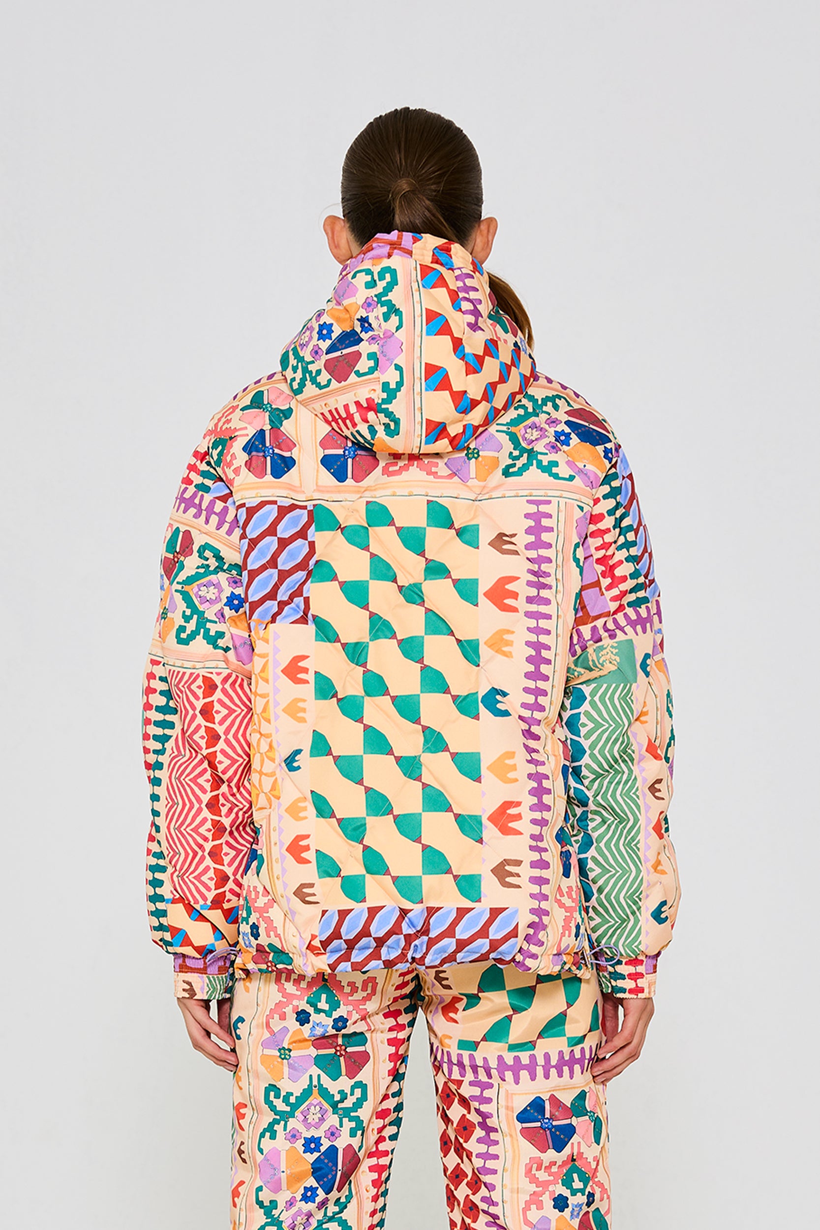 Kanguru cepli, yanları ve ön yakası fermuarlı, kapüşonlu, etek ucu ayarlanabilir lastikli, şehir içi ve kayakta kullanılabilen, rüzgar geçirmez ve su itici kumaş özellikli puffer mont. Modelin üzerindeki 1 bedendir.