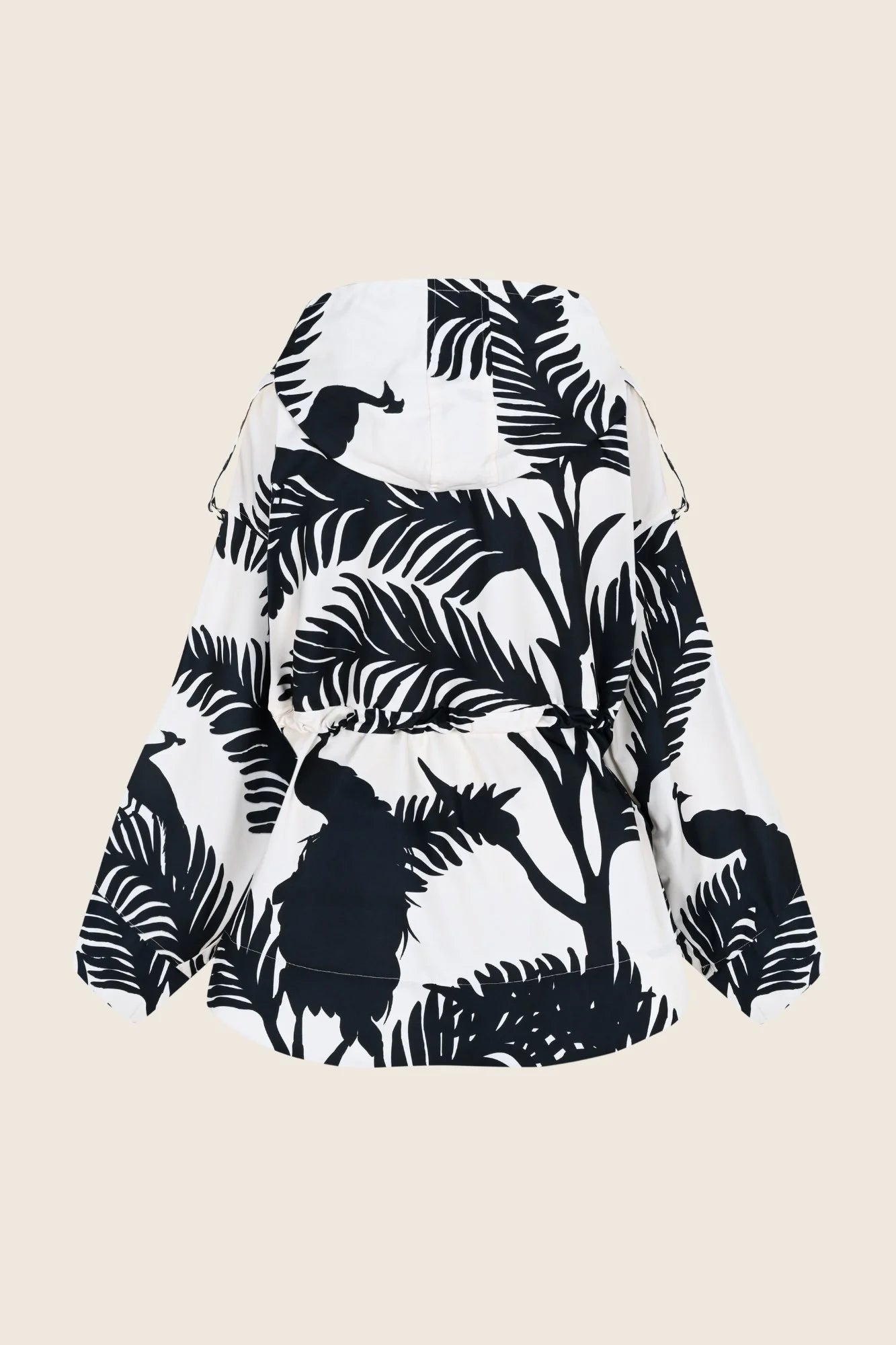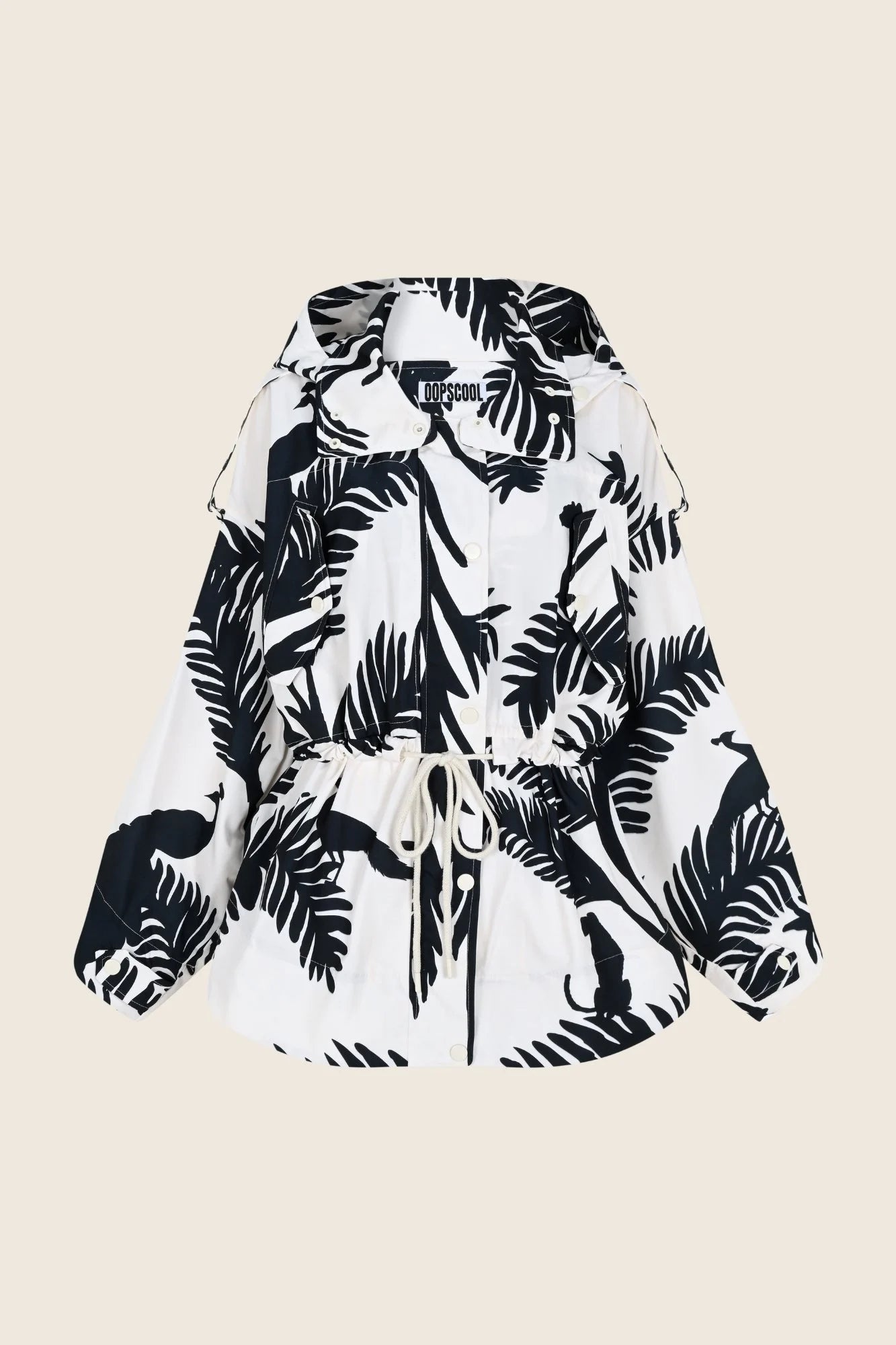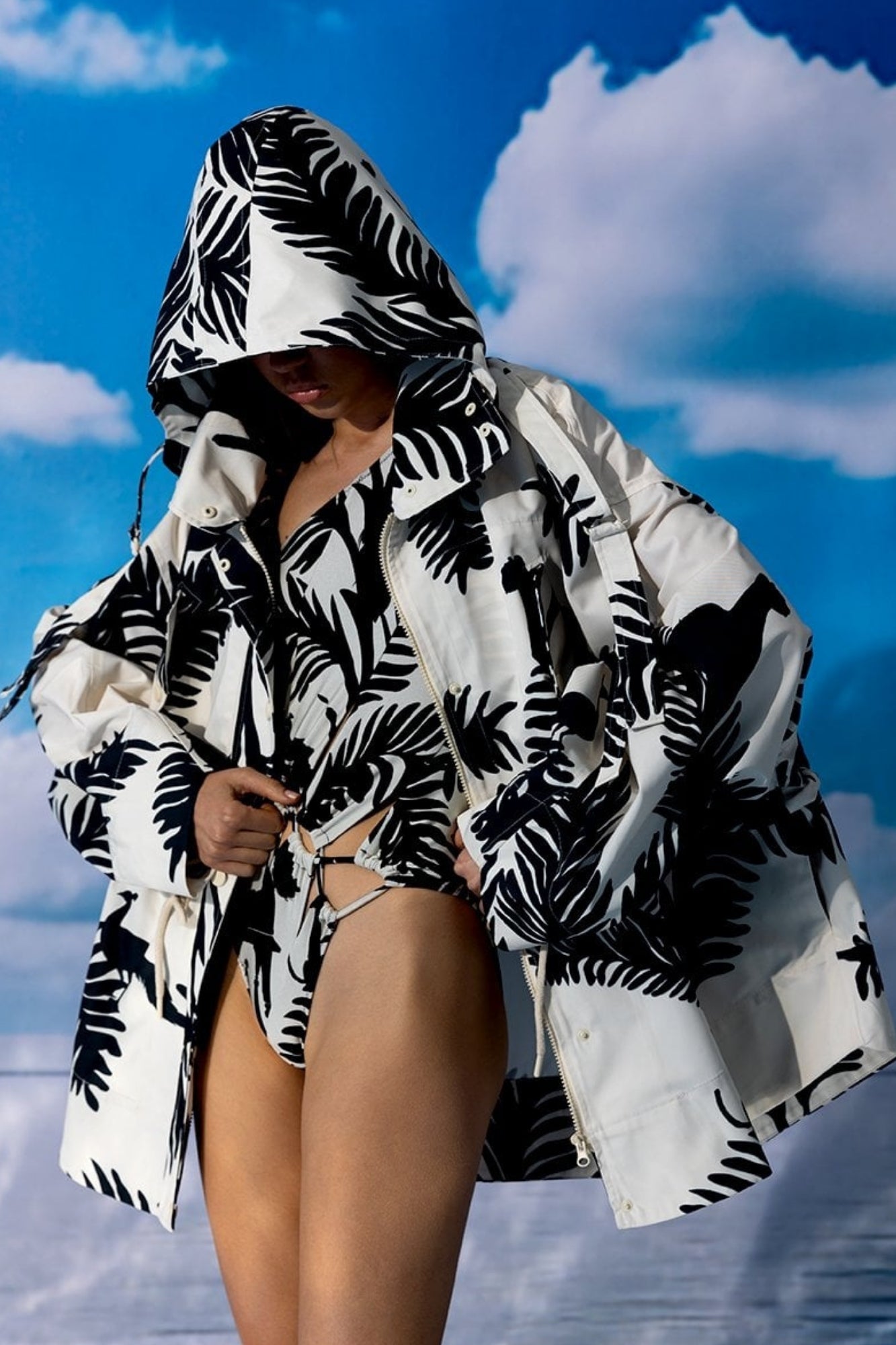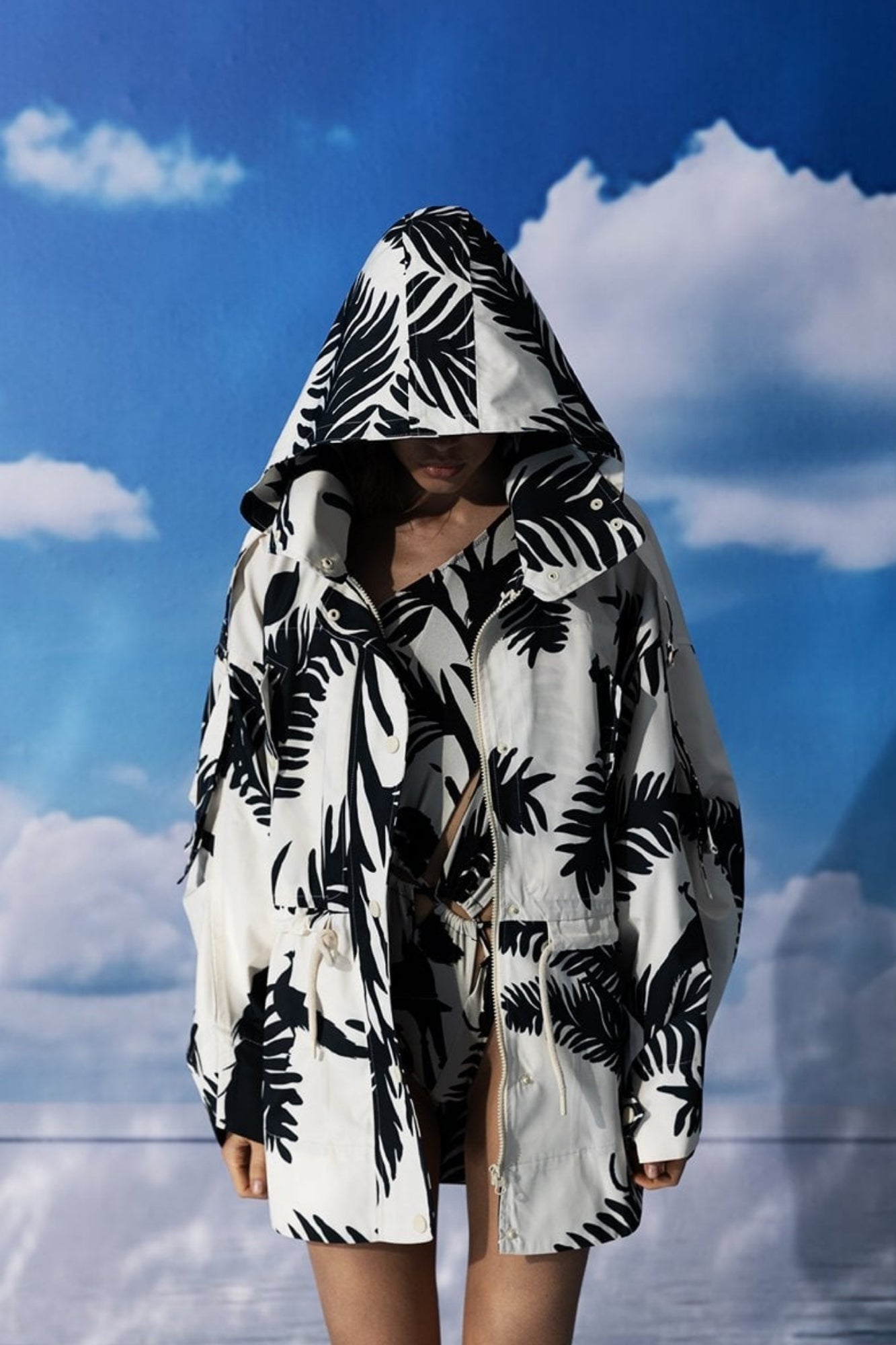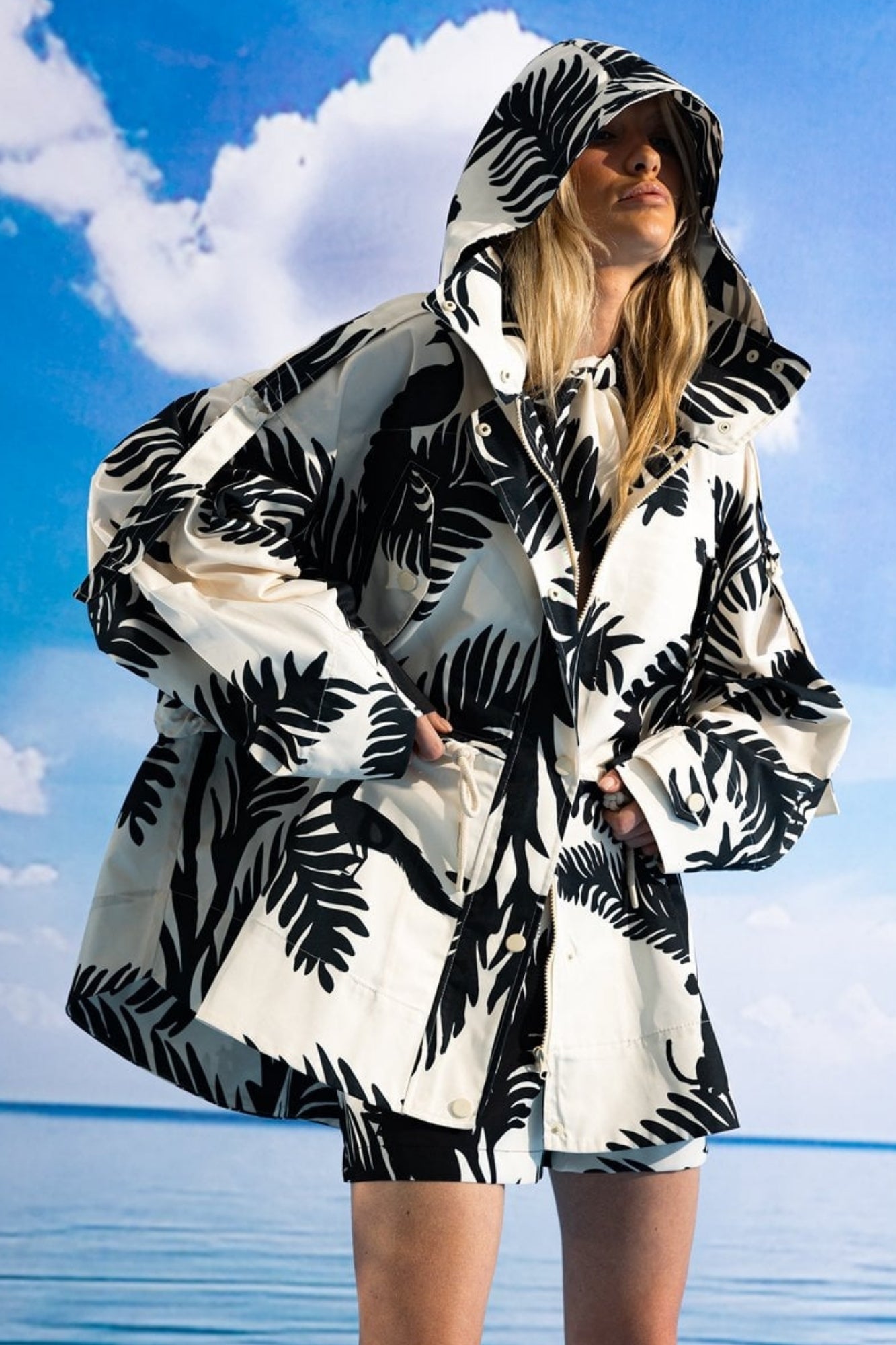 Kapüşon yakalı, önü fermuarlı, uzun kollu, beli bağcık bağlama detaylı, oversize yağmurluk ceket.