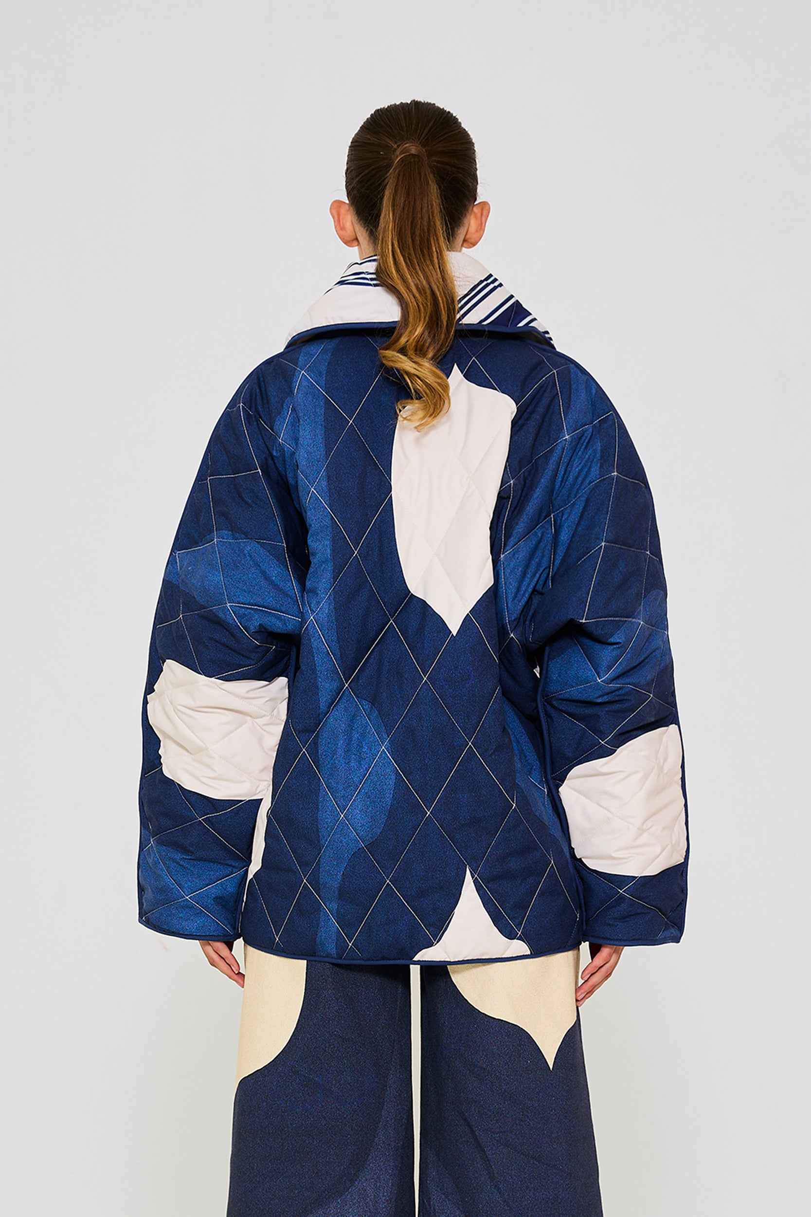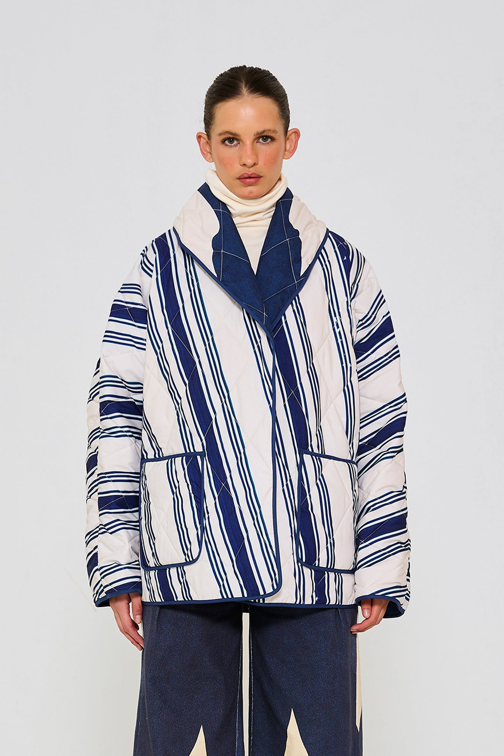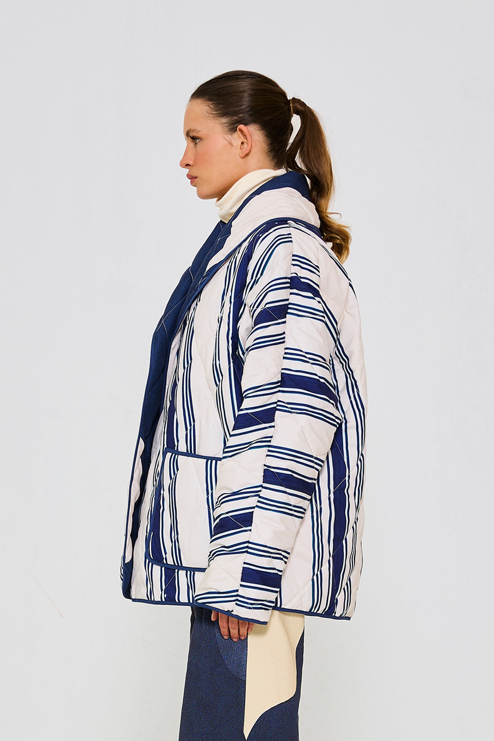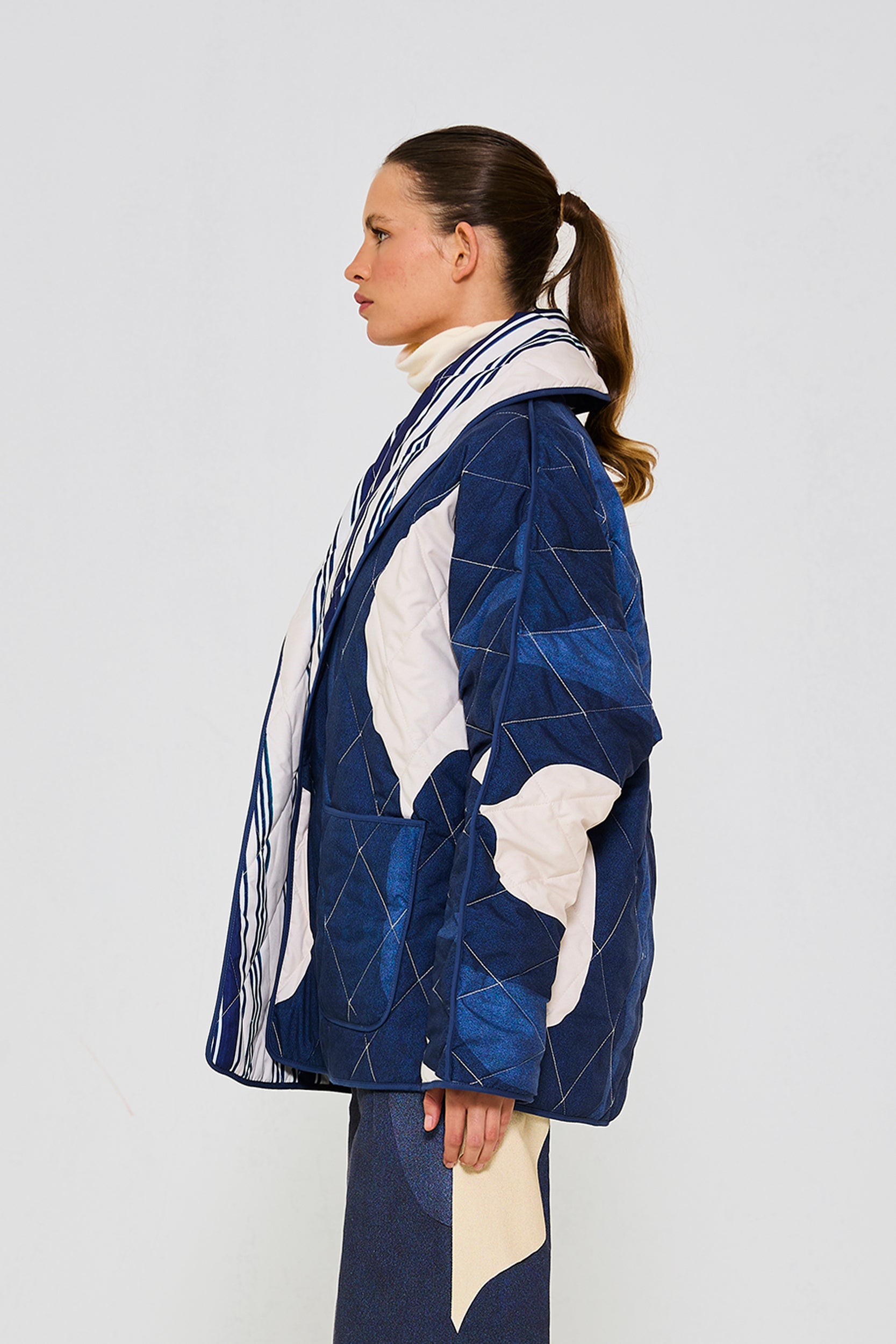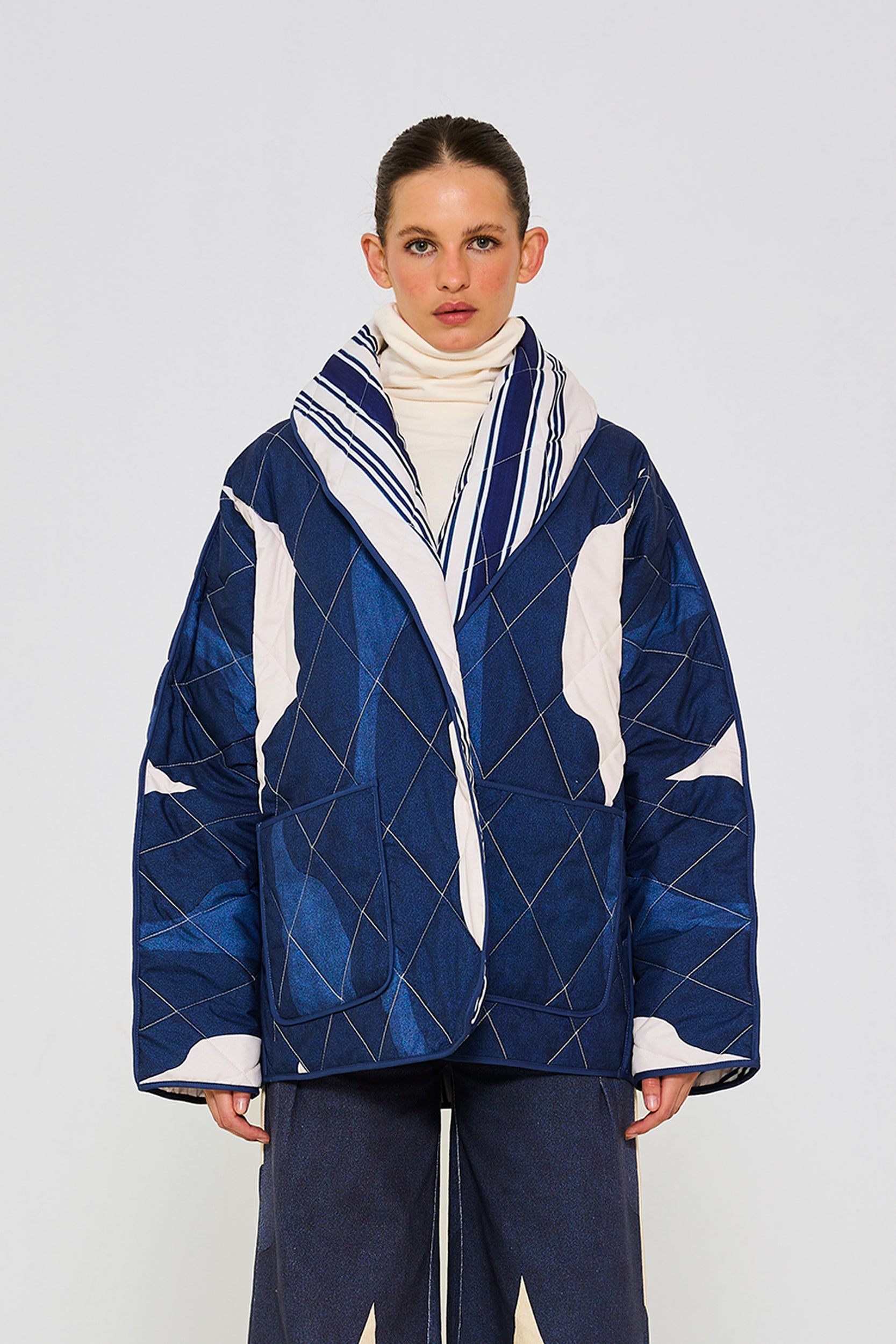 Çift taraflı giyilebilen, iki yüzünde de cepleri olan ,şal yaka ,biye detaylı puffer ceket.