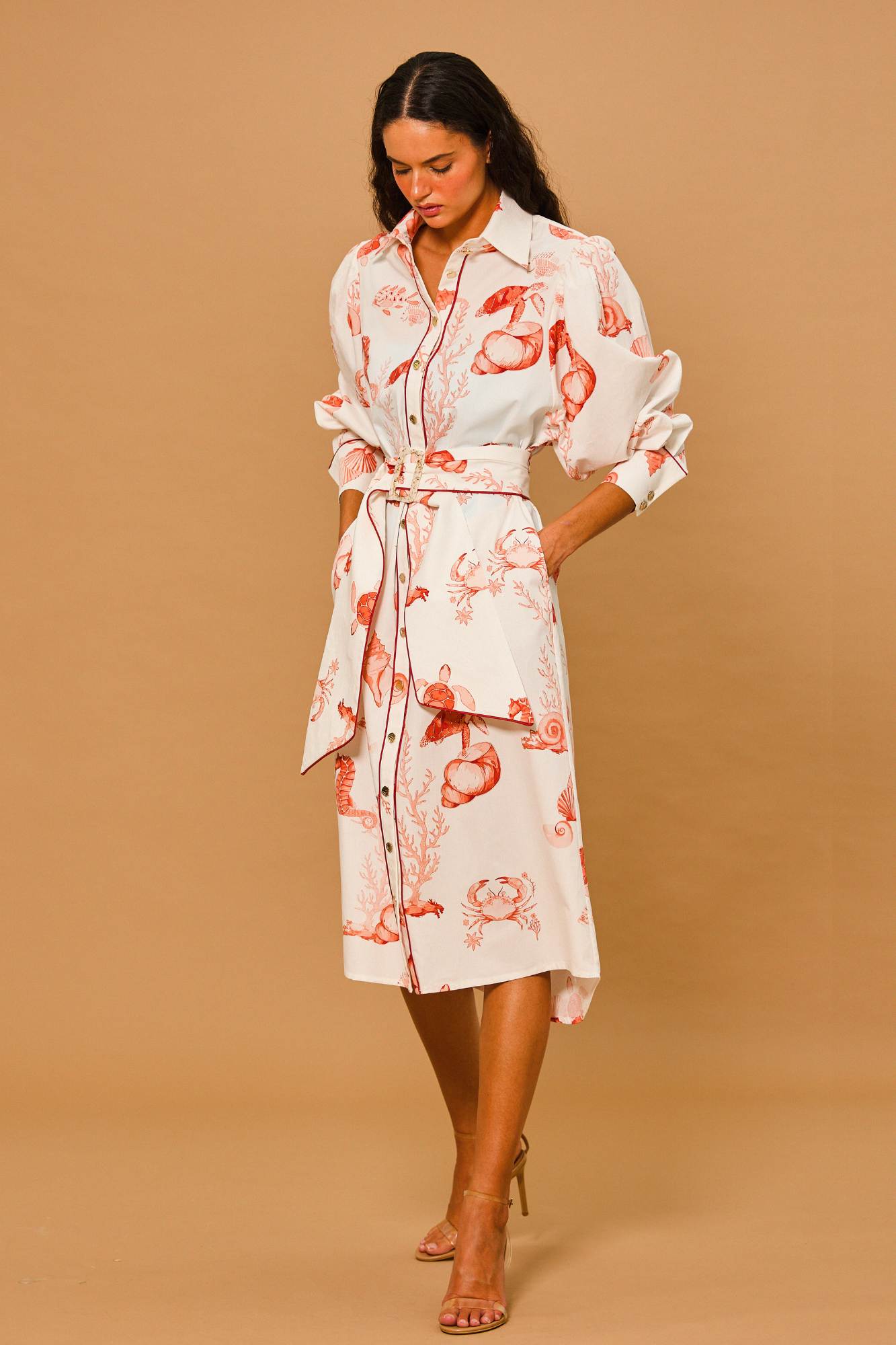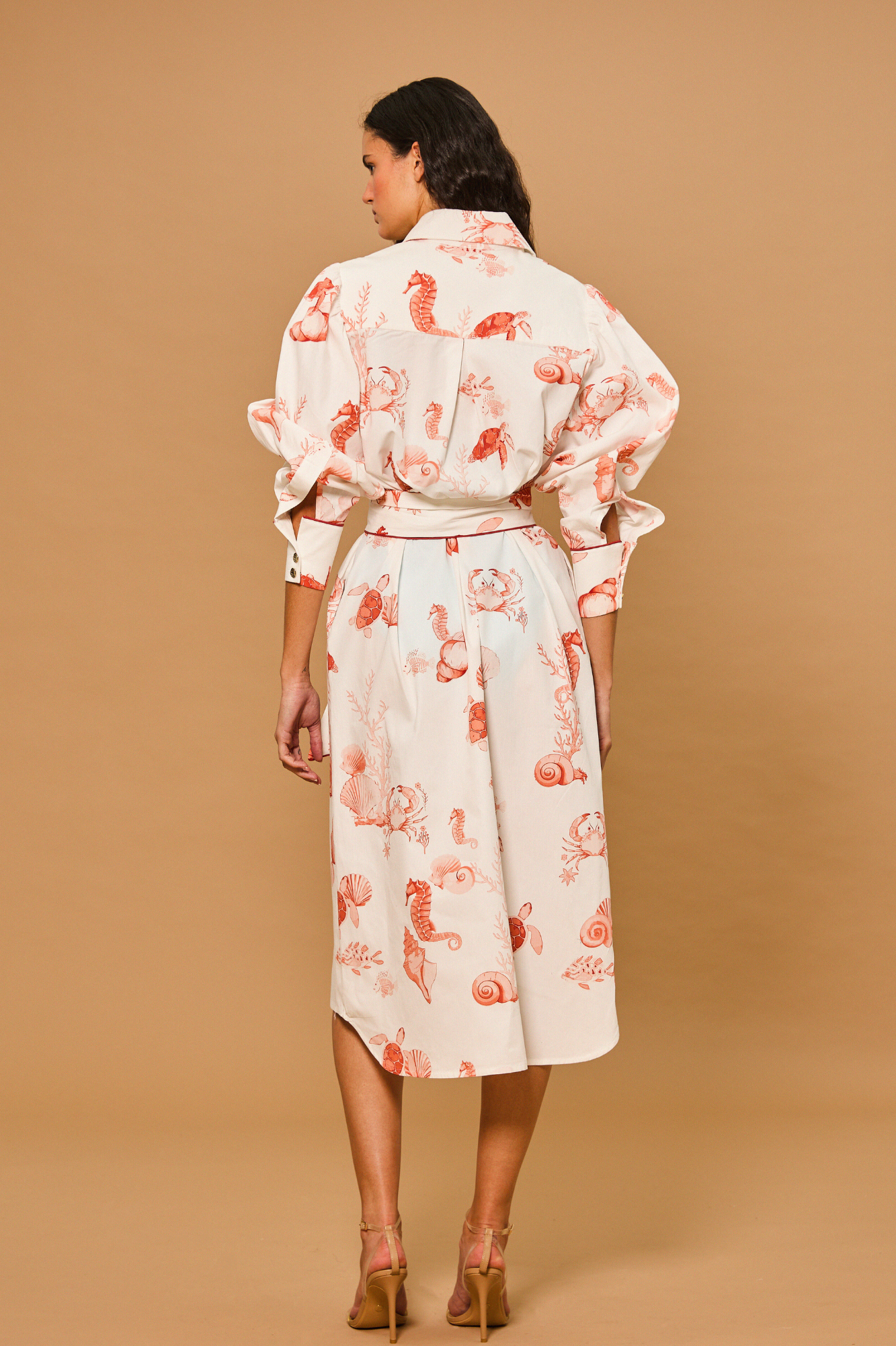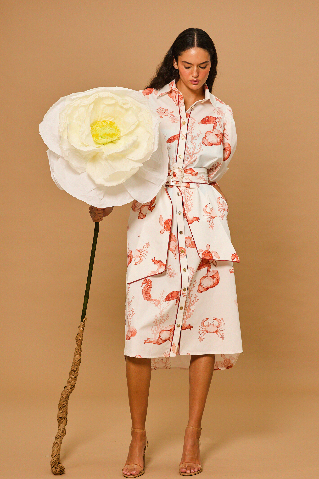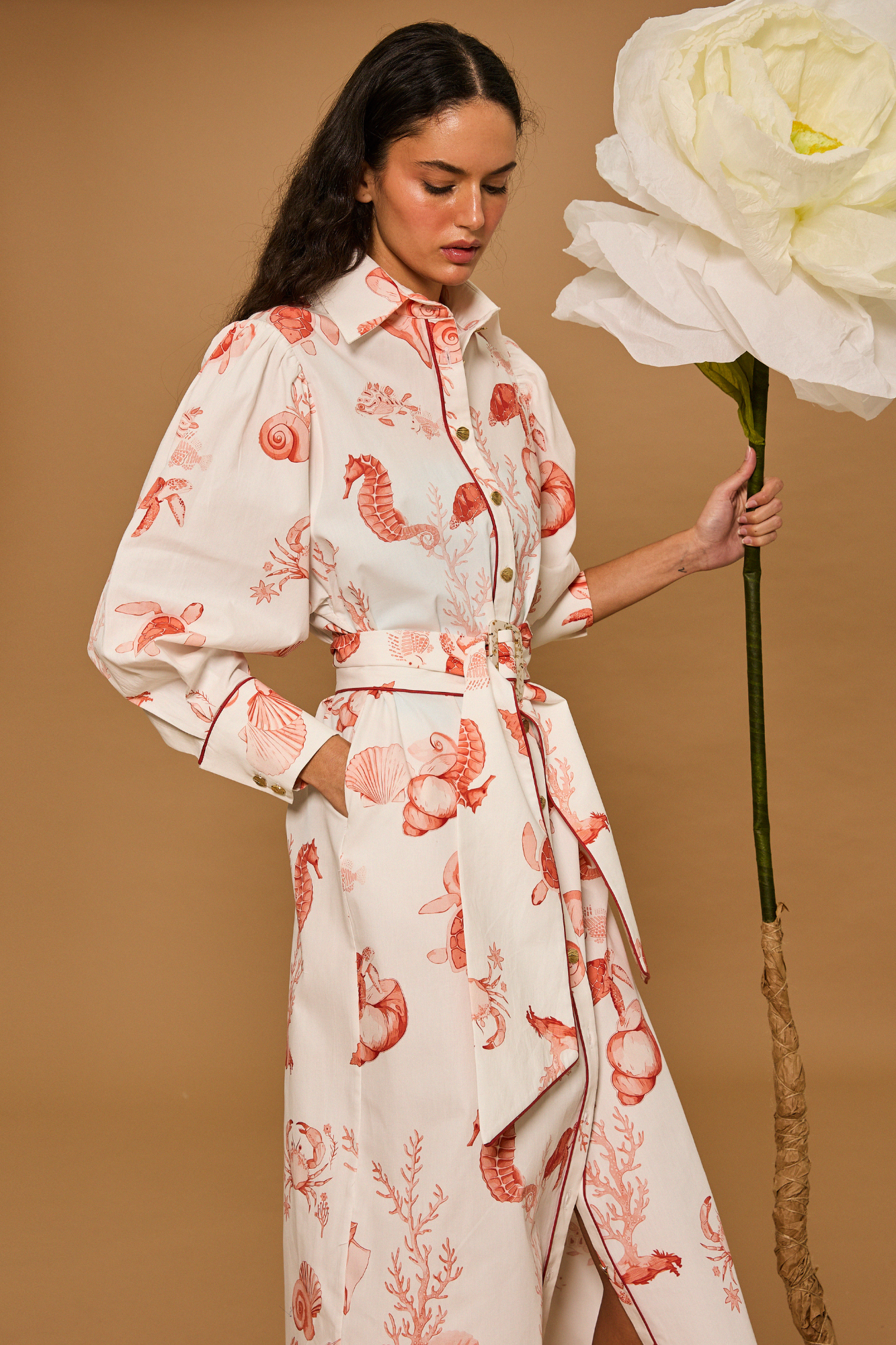100% cotton. Collared, wide-sleeved, piped, front buttoned, belted, loose-fitting shirt dress. The model is wearing size XS.
