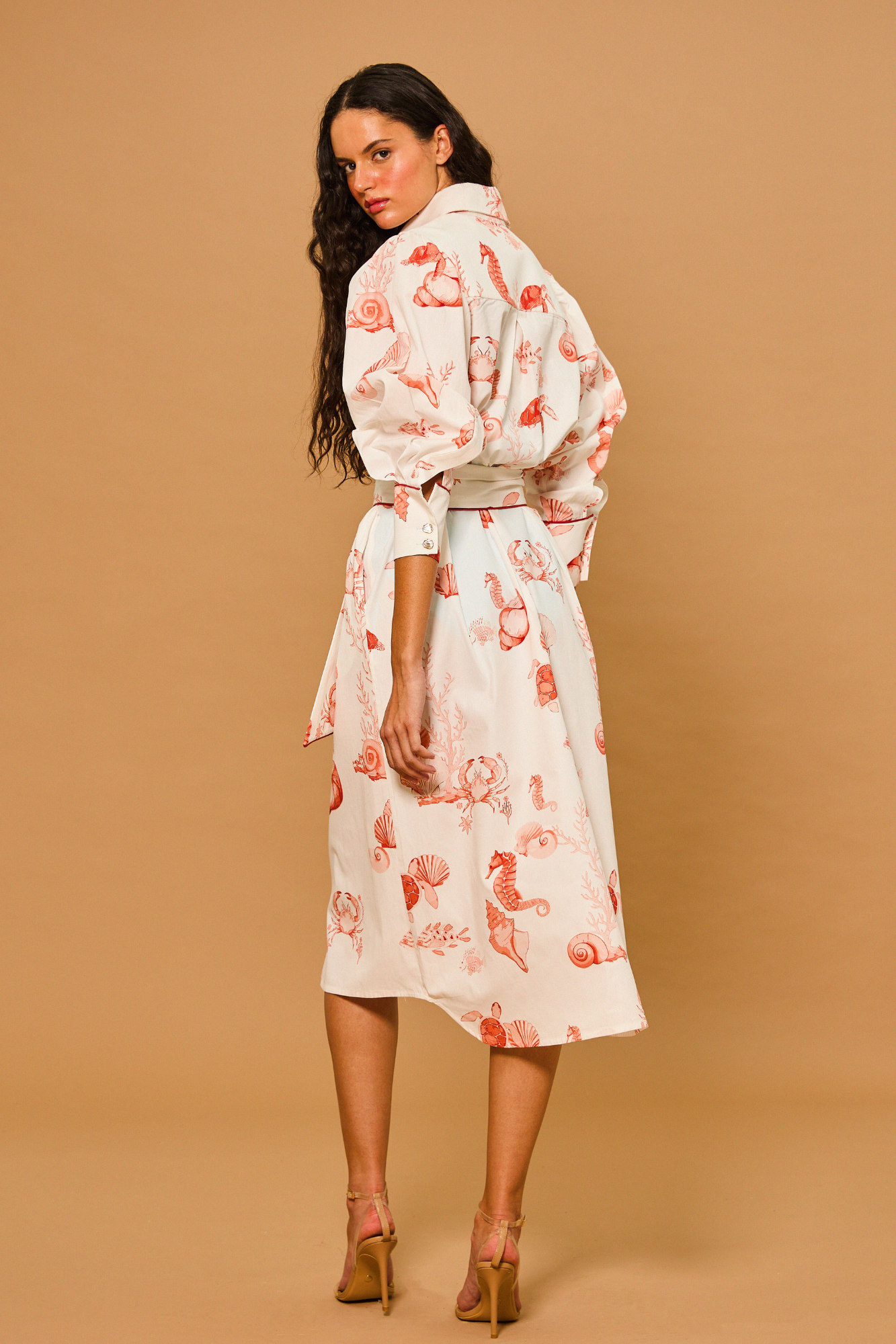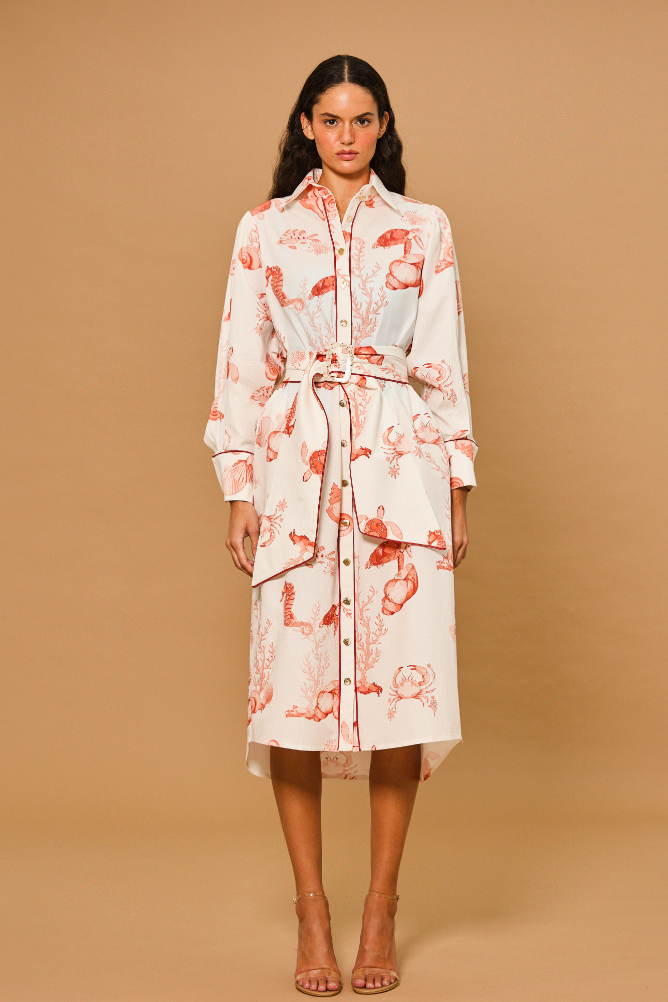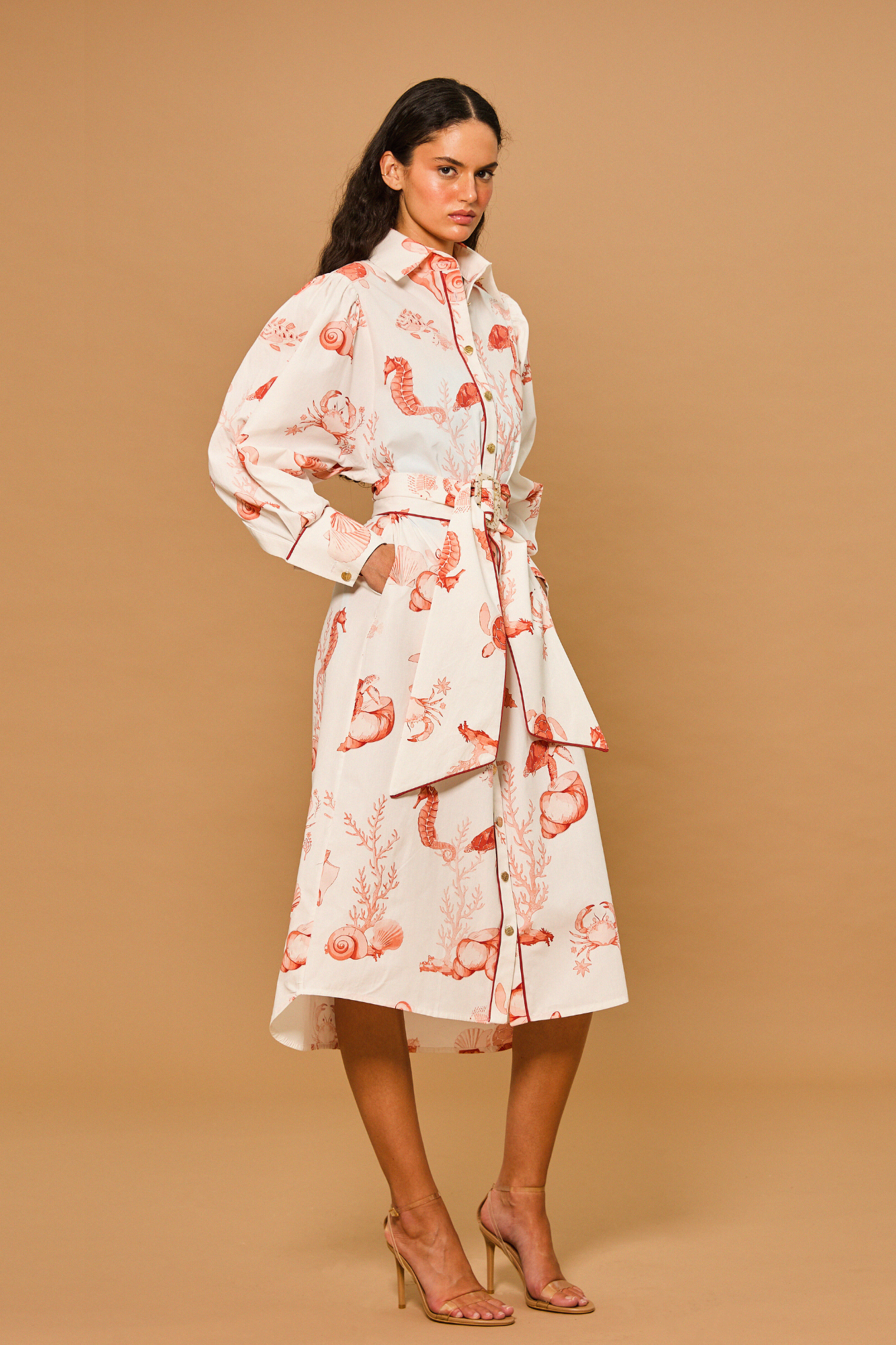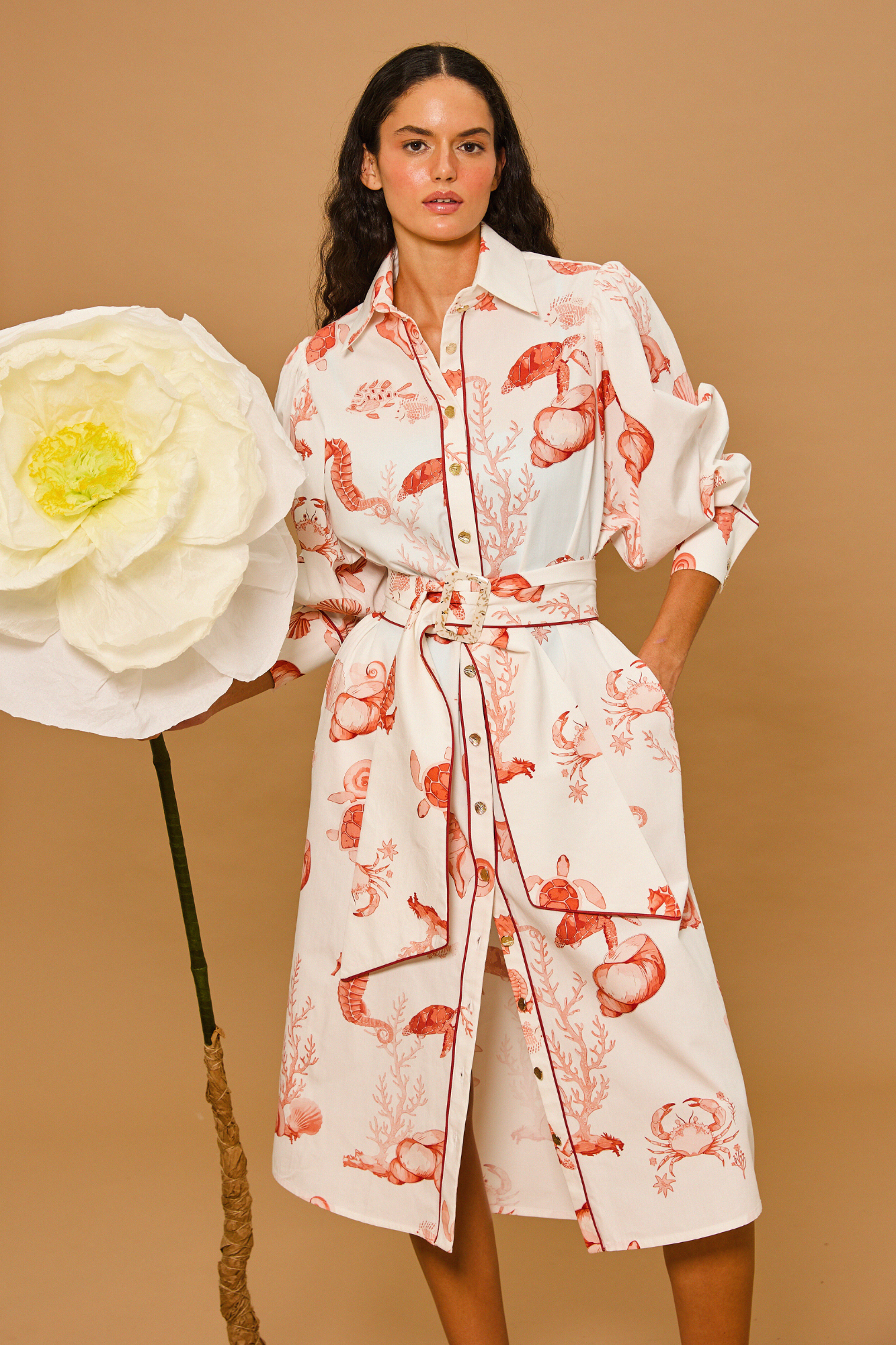 100% cotton. Collared, wide-sleeved, piped, front buttoned, belted, loose-fitting shirt dress. The model is wearing size XS.