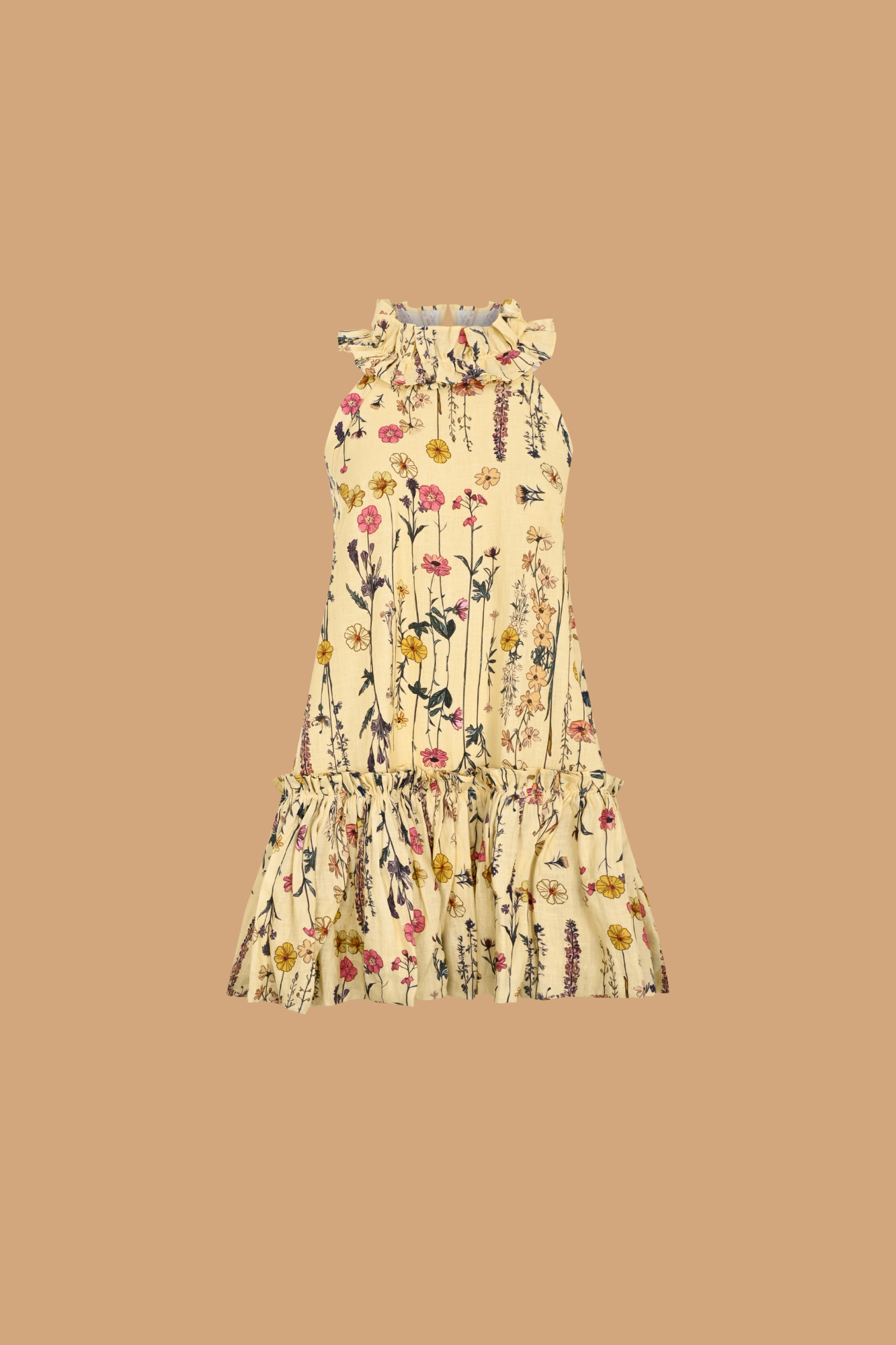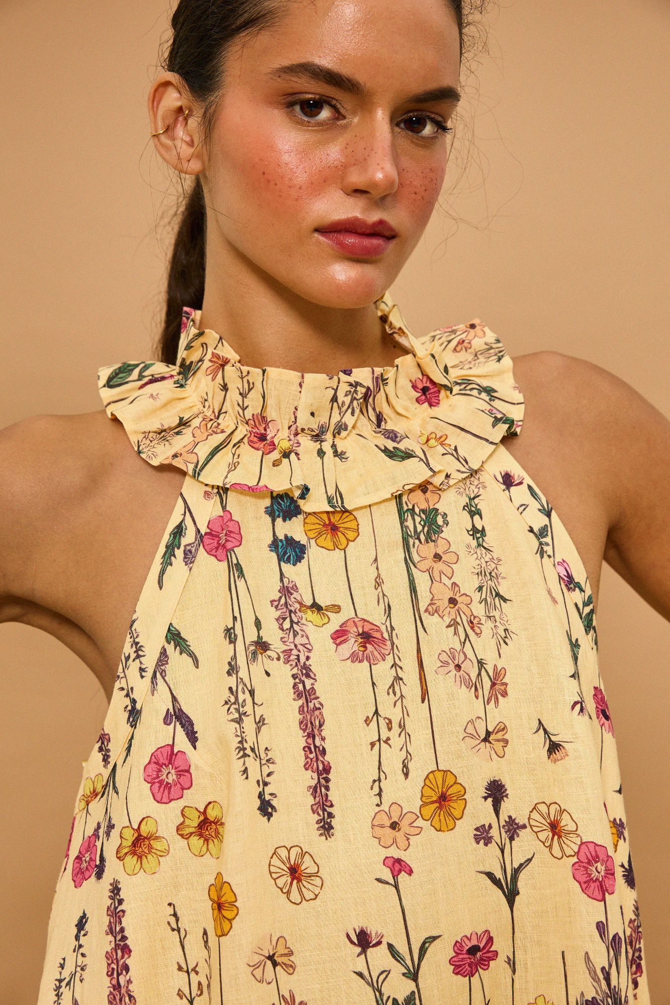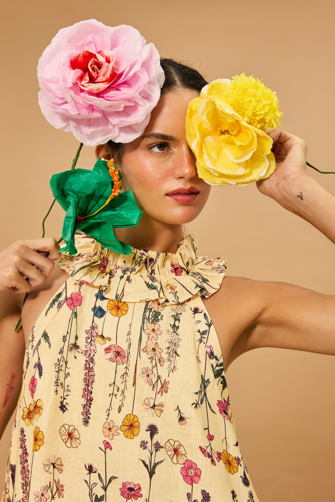 100% linen. Sleeveless, ruffled collar, ruffle details, wide skirt, short dress. The model is wearing a size XS.