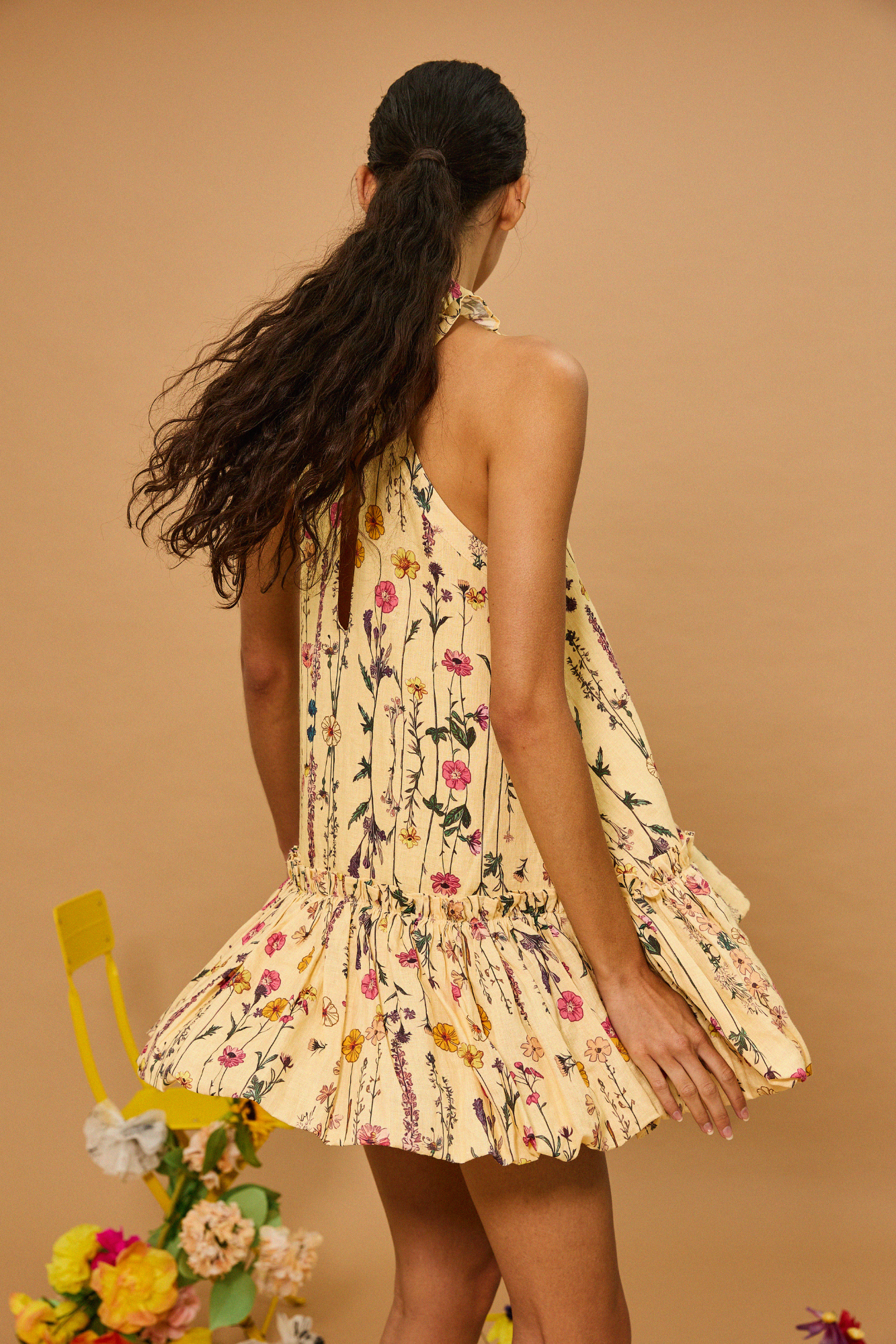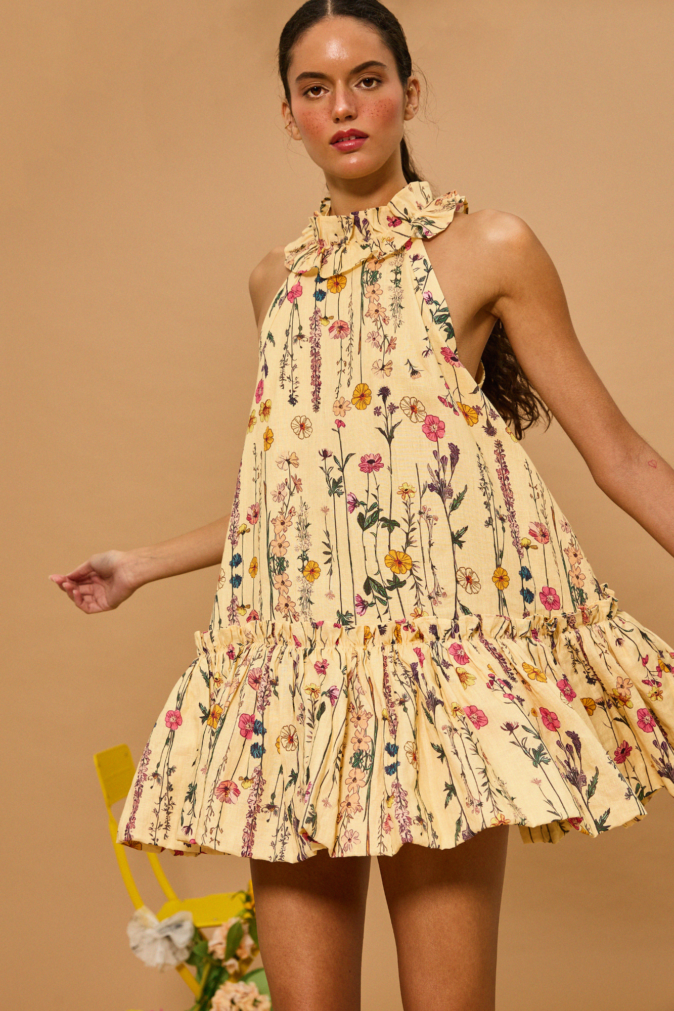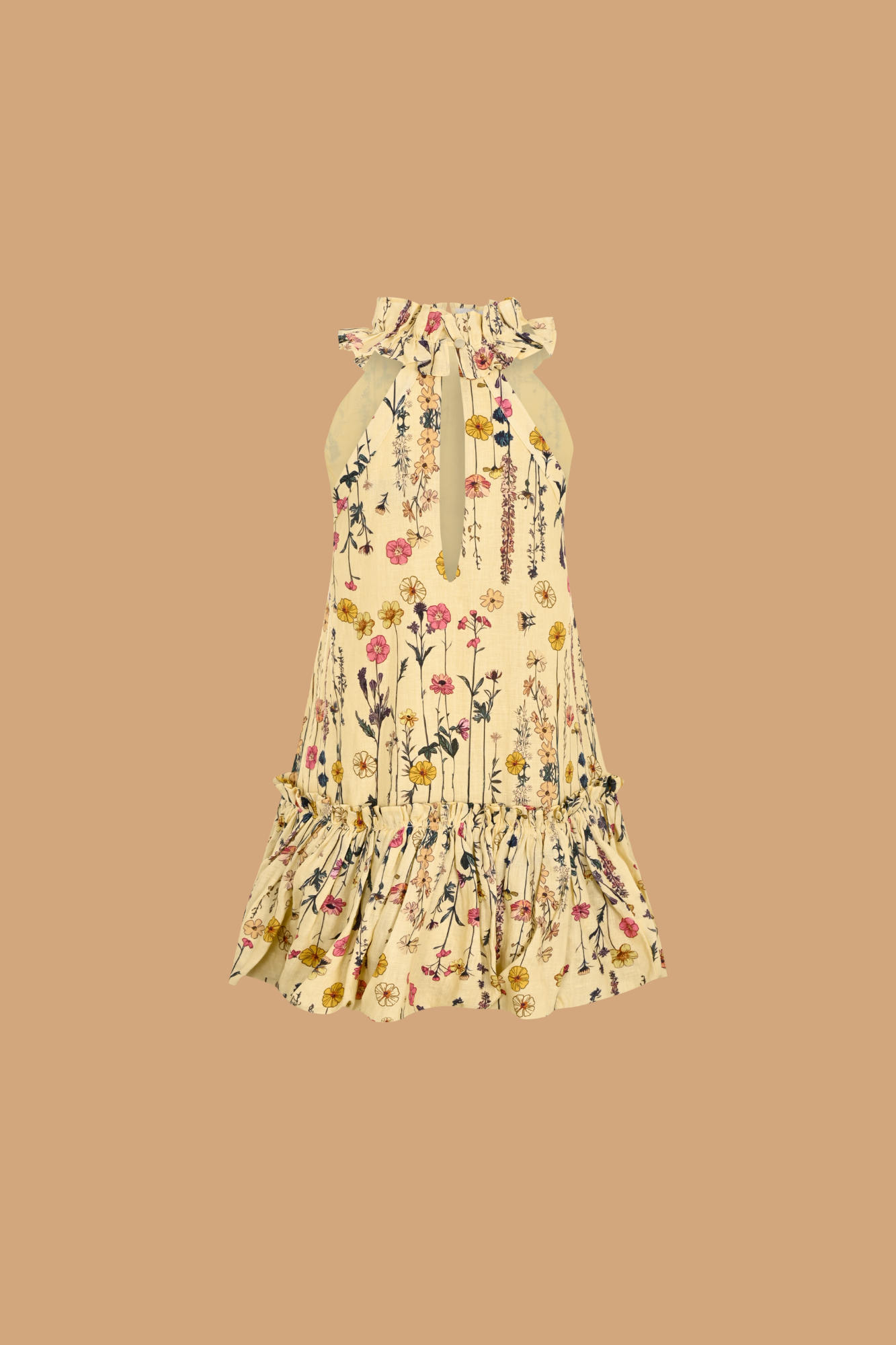 100% linen. Sleeveless, ruffled collar, ruffle details, wide skirt, short dress. The model is wearing a size XS.