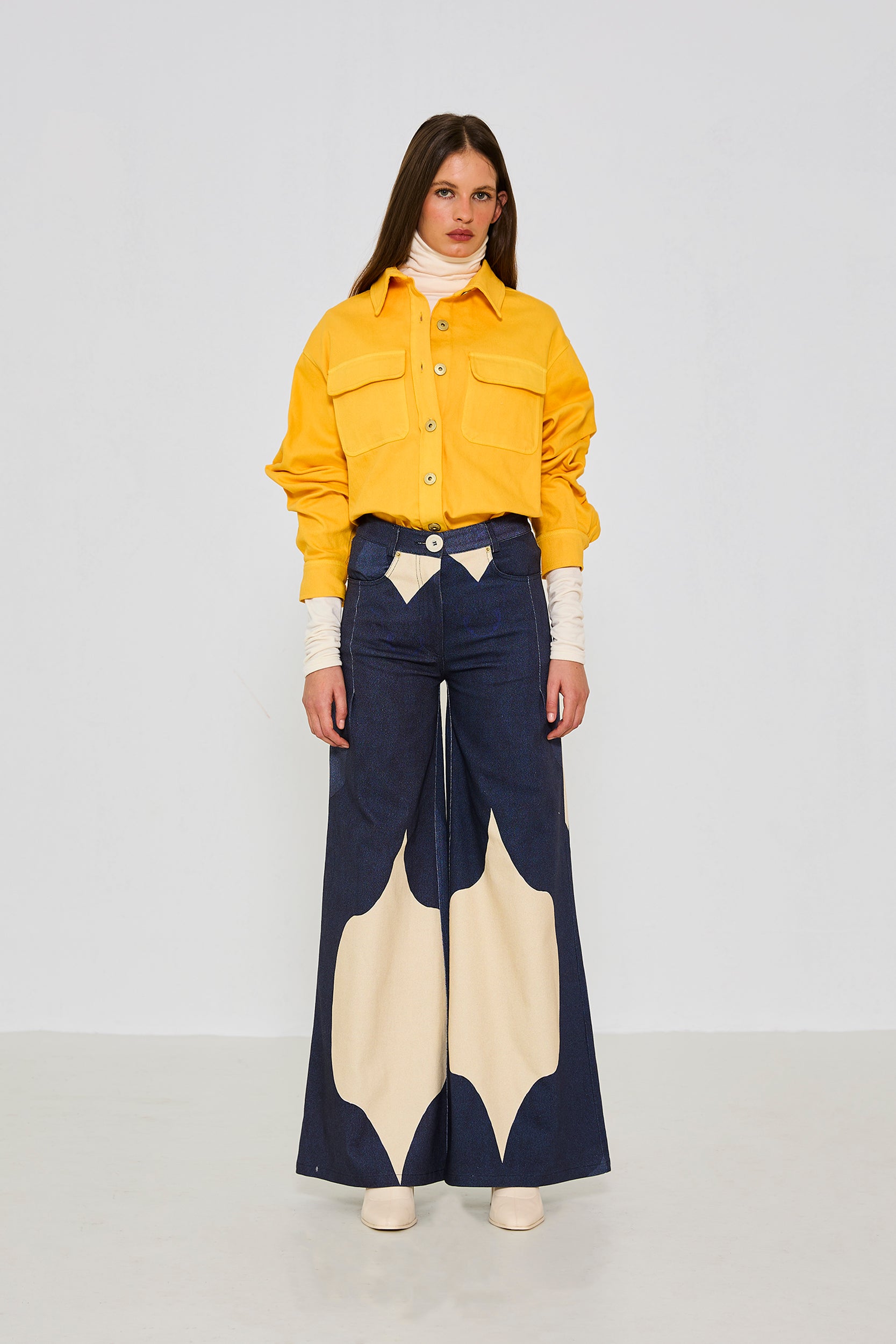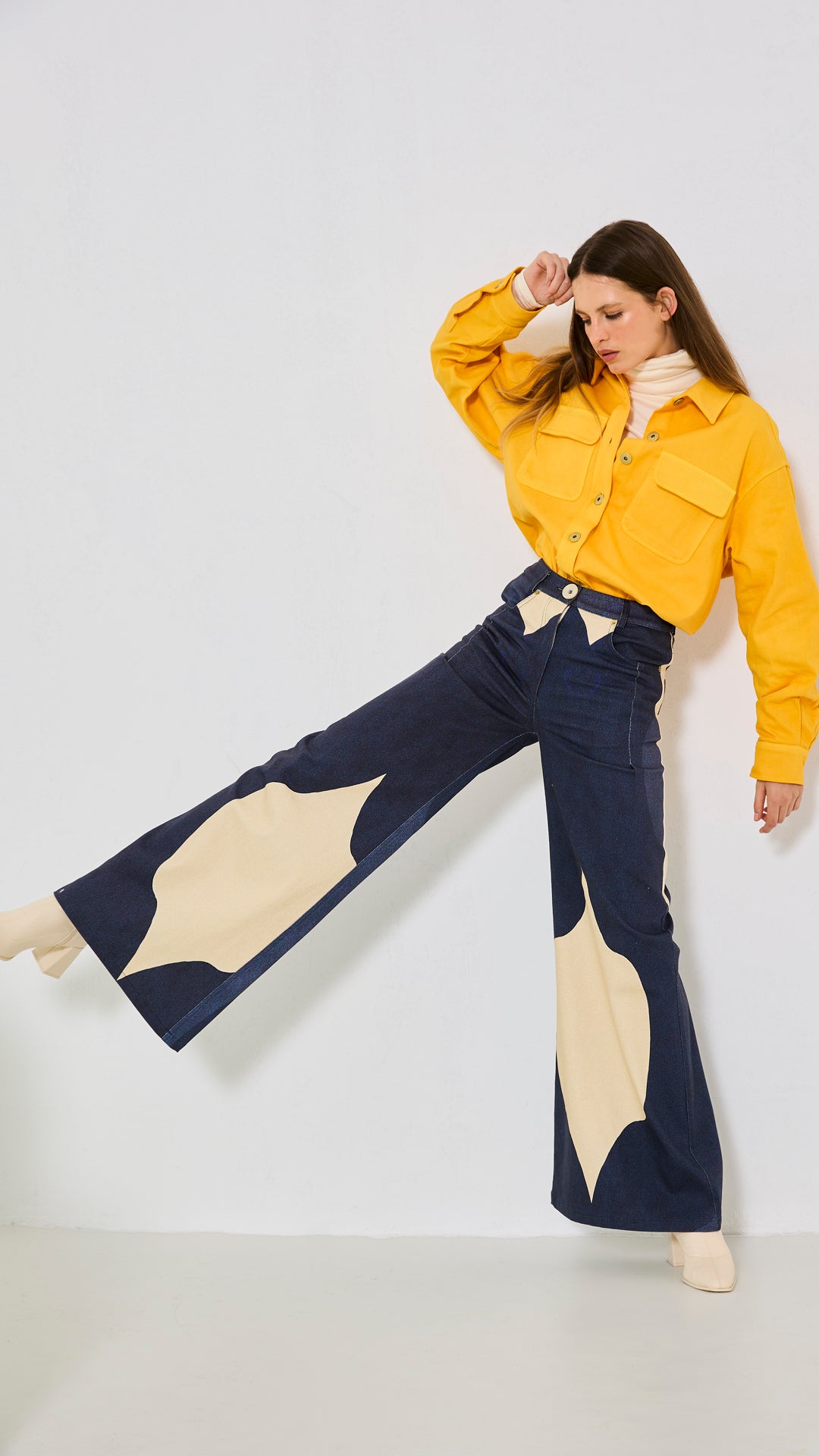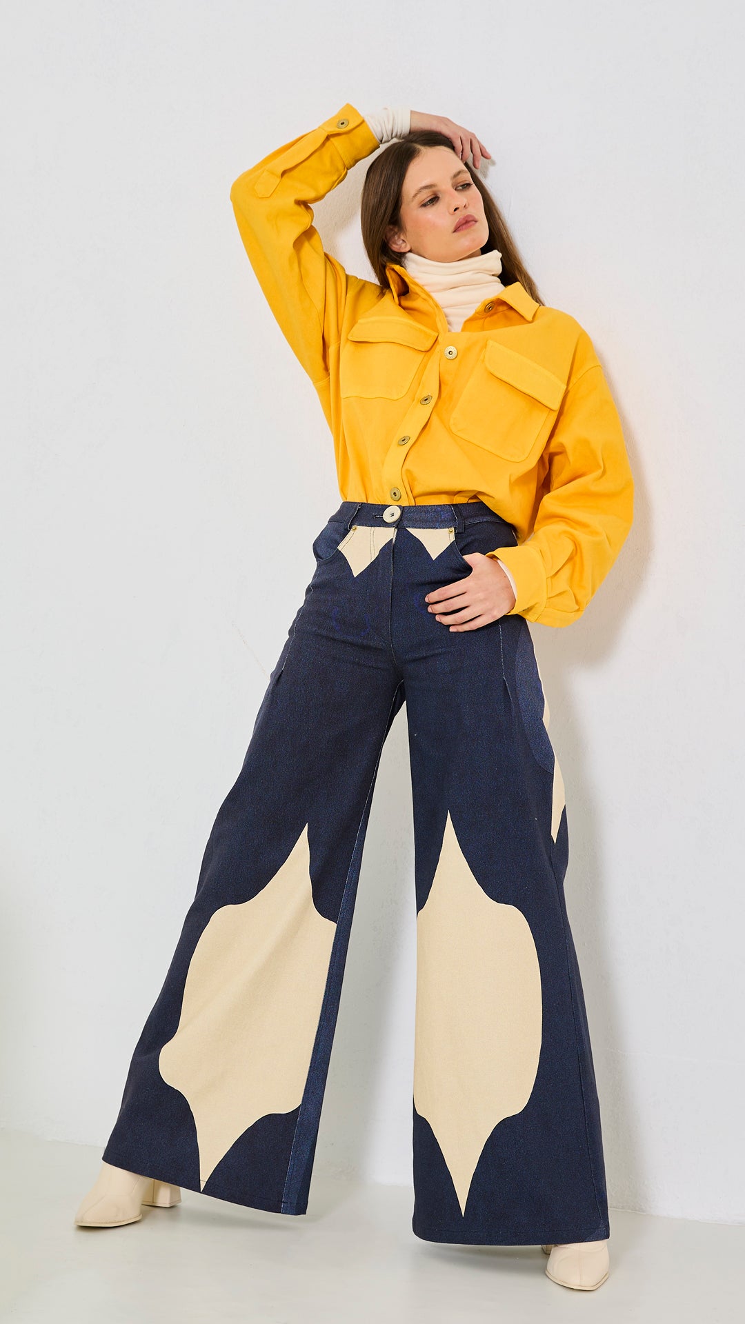 %97 Pamuk, %3 Elastan, bol paça, kalın kumaş gabardin pantolon. Modelin üzerindeki S bedendir.