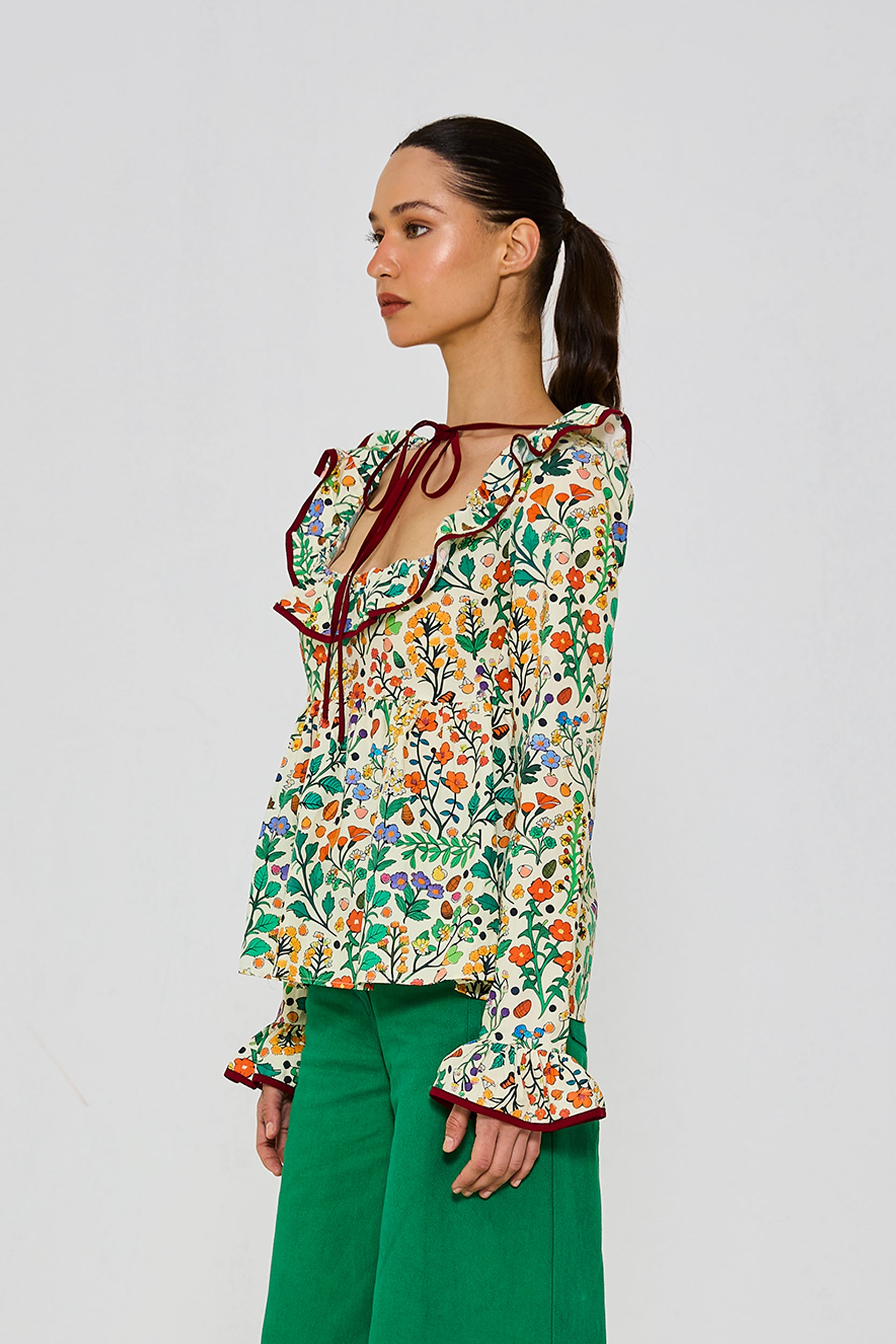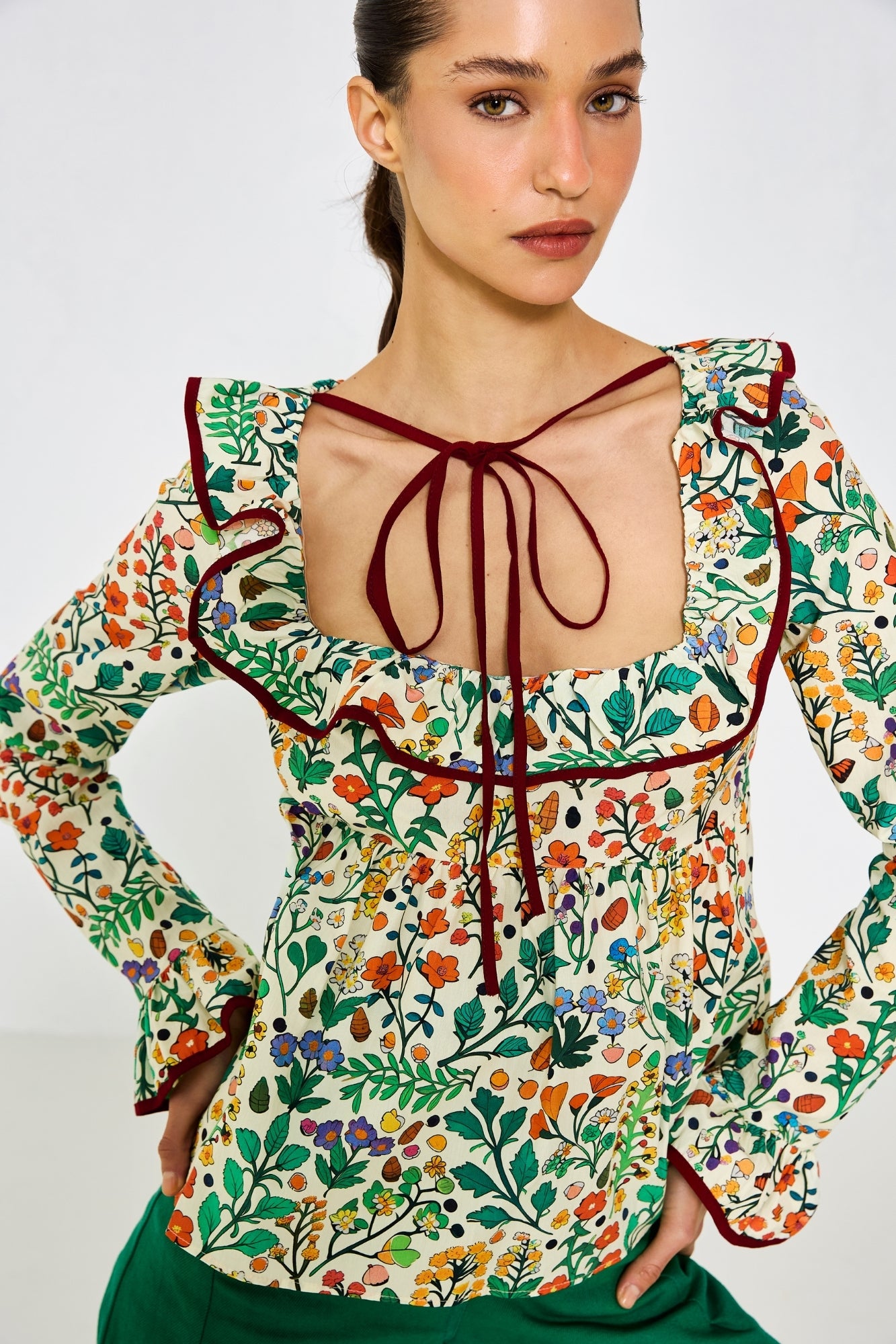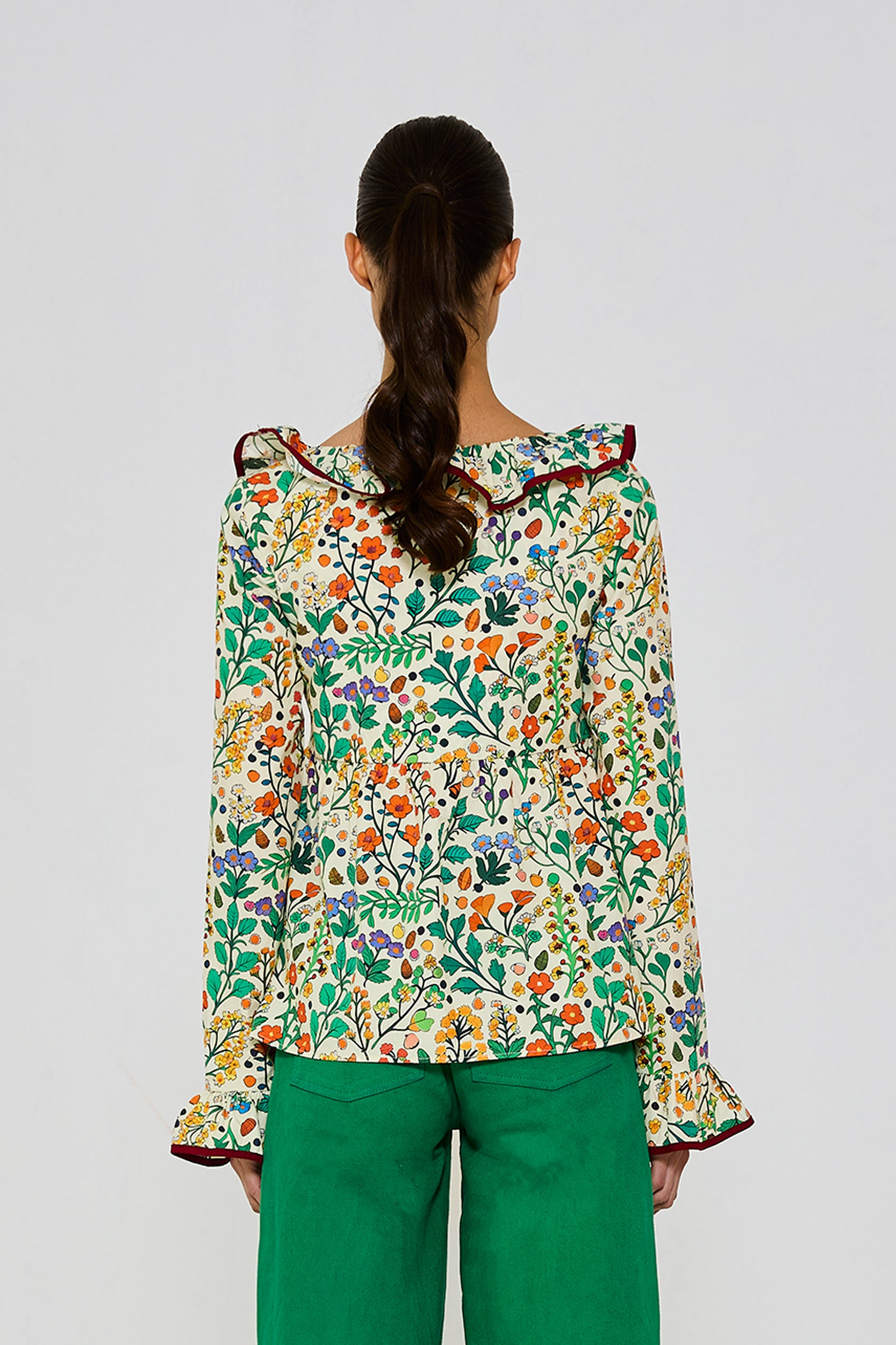 %100 Pamuk, kol ucu ve yaka ucu fırfırlı ,kol ucu lastikli ,biye detaylı bluz. Modelin üzerindeki S bedendir.