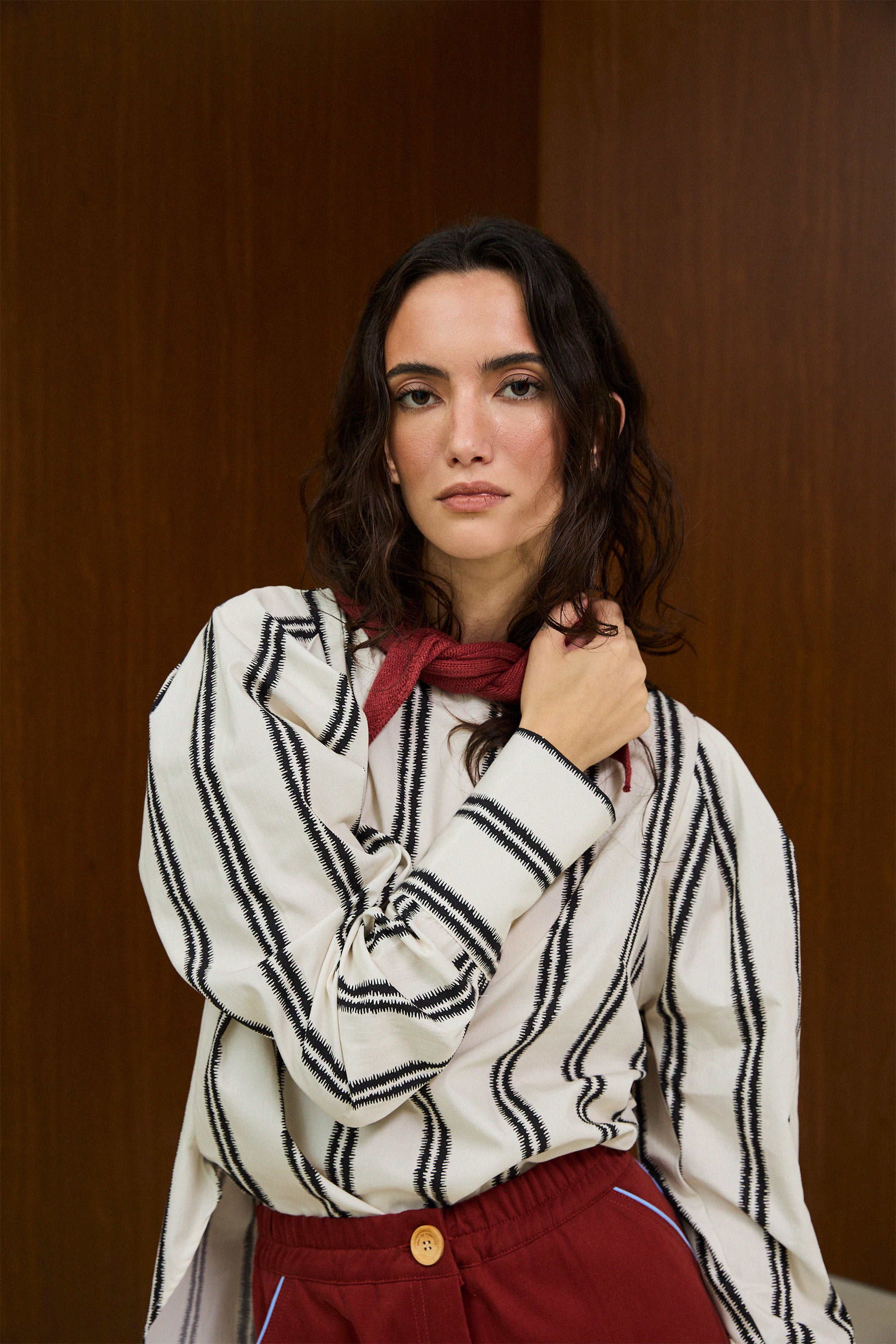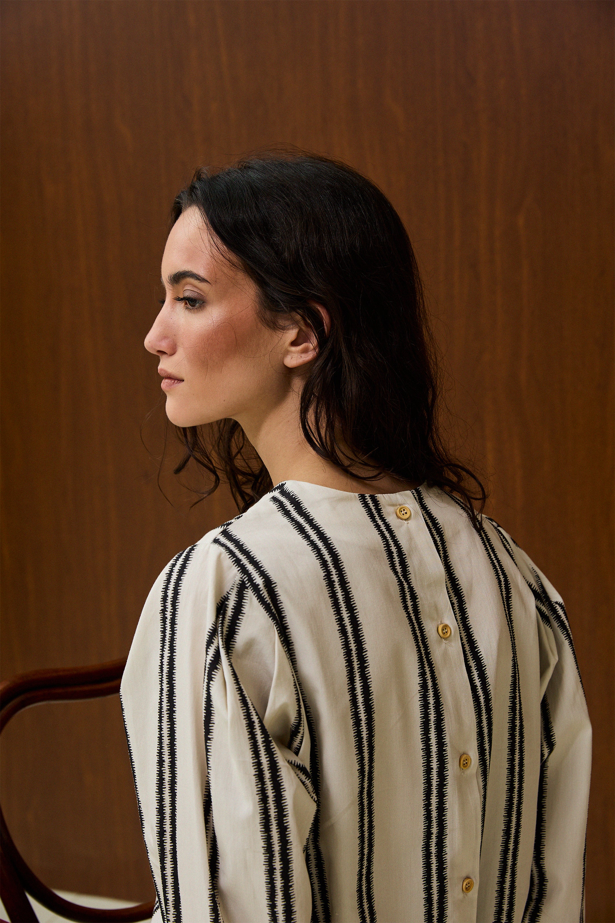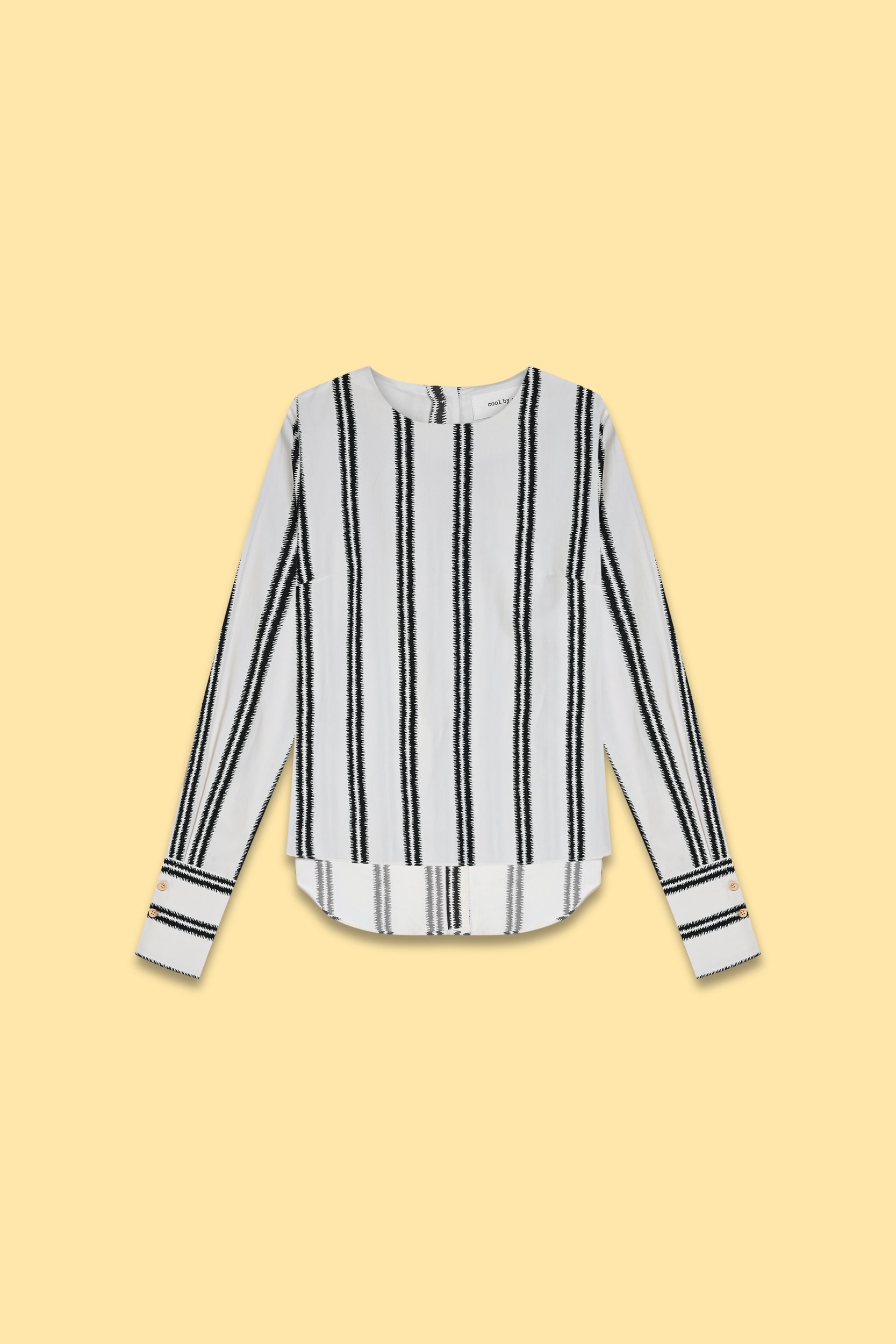Long-sleeve blouse with vertical black stripes on a cream base. High-low hem with shorter front and longer back. Full button closure at the back.