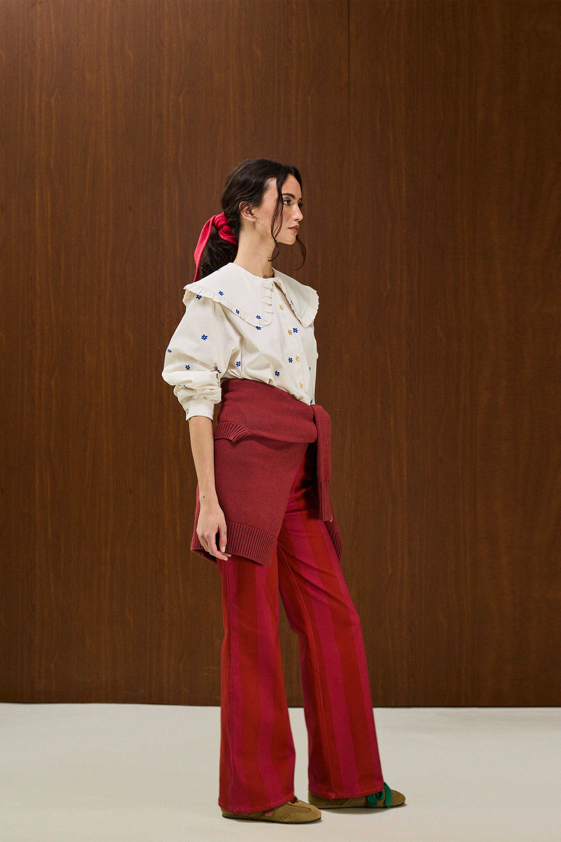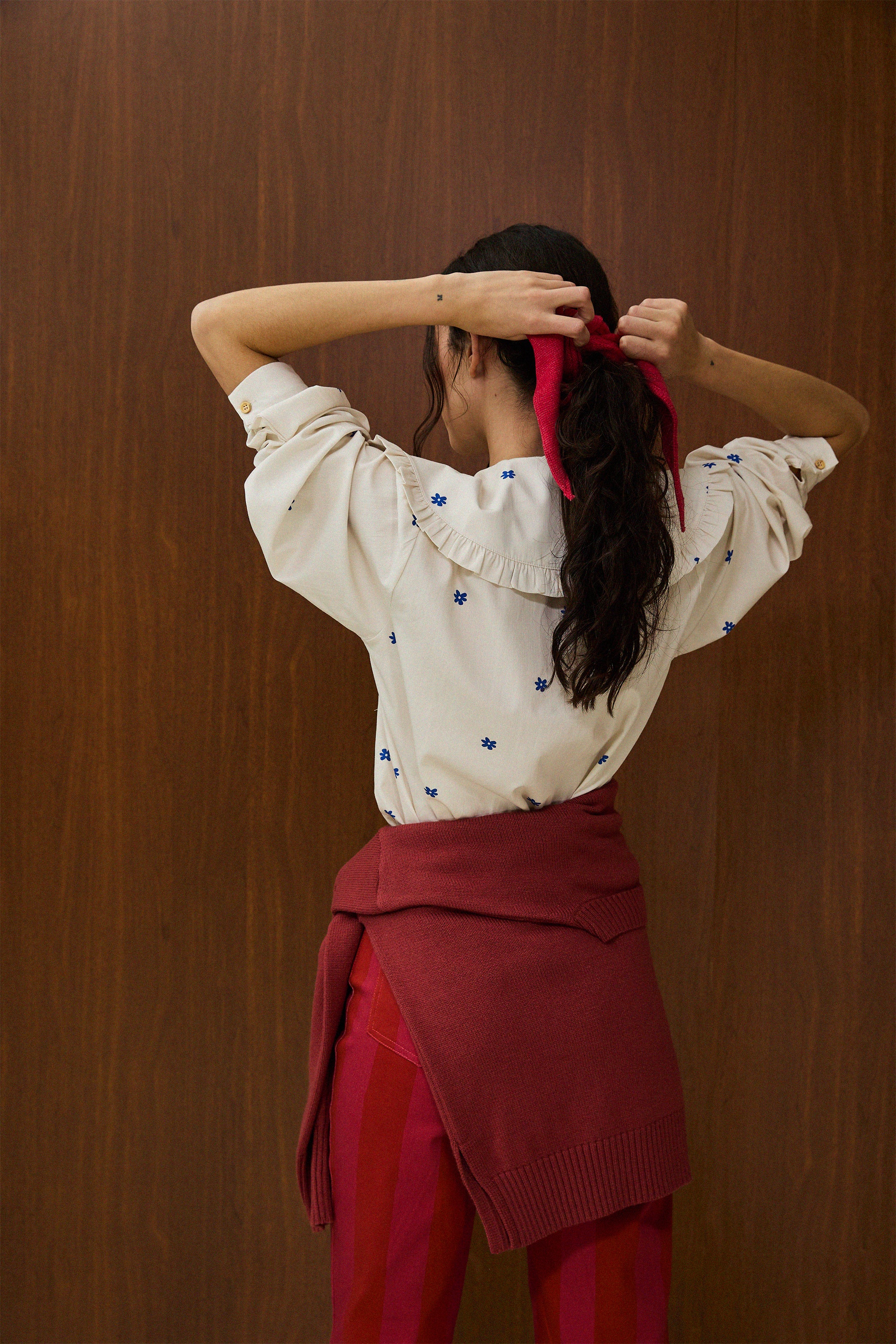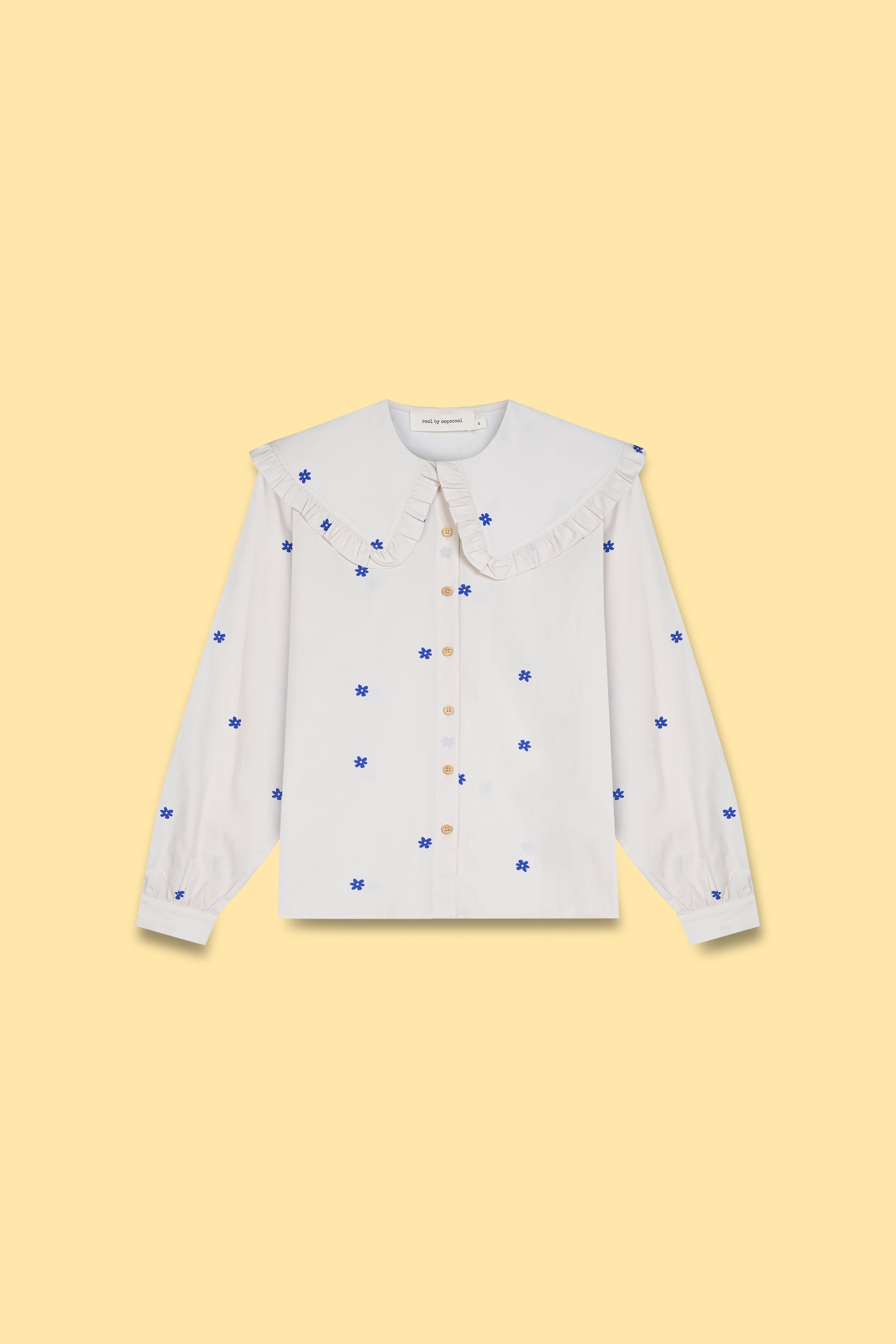 Shirt with a wide, ruffled collar, wooden button down front, and cuffs.