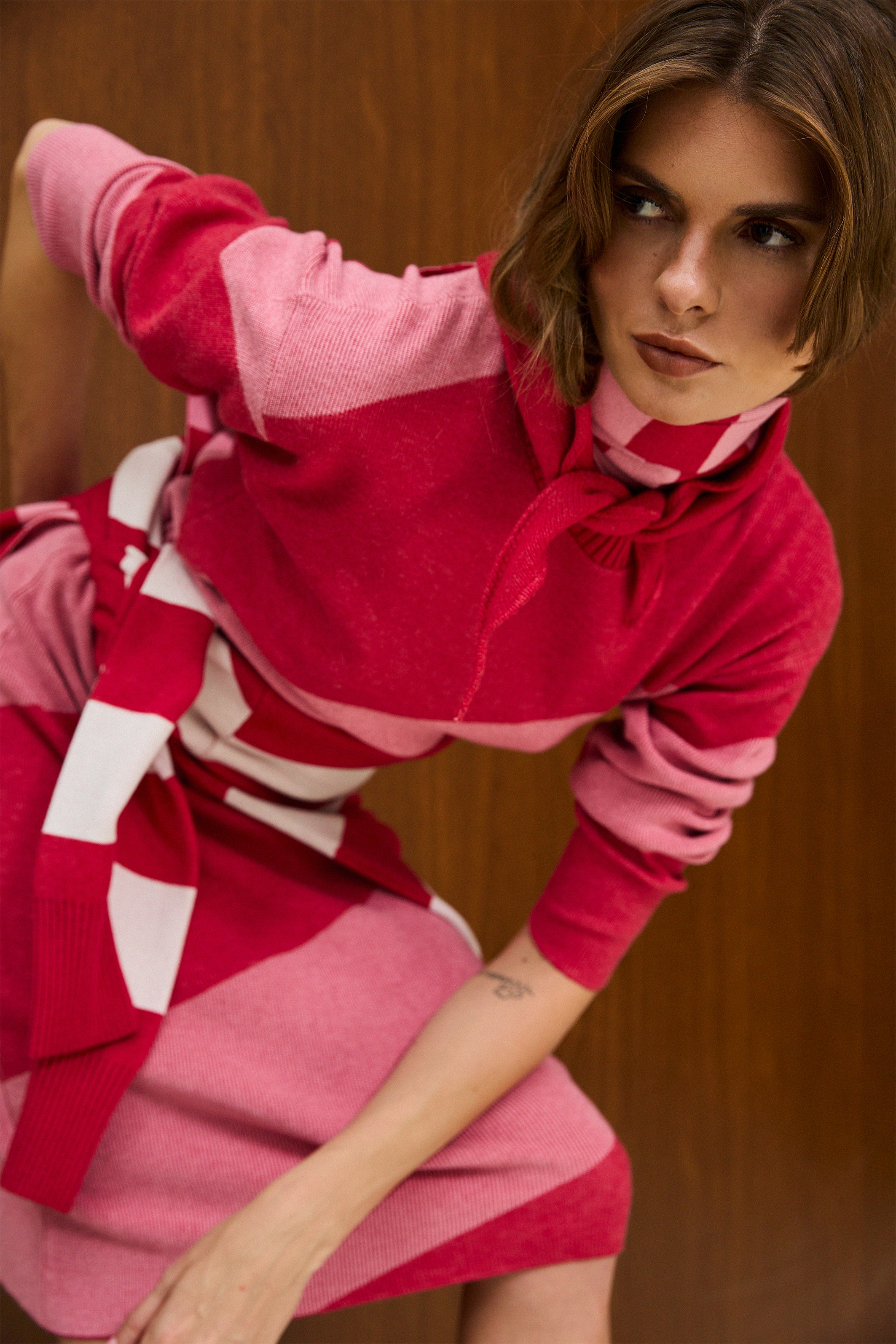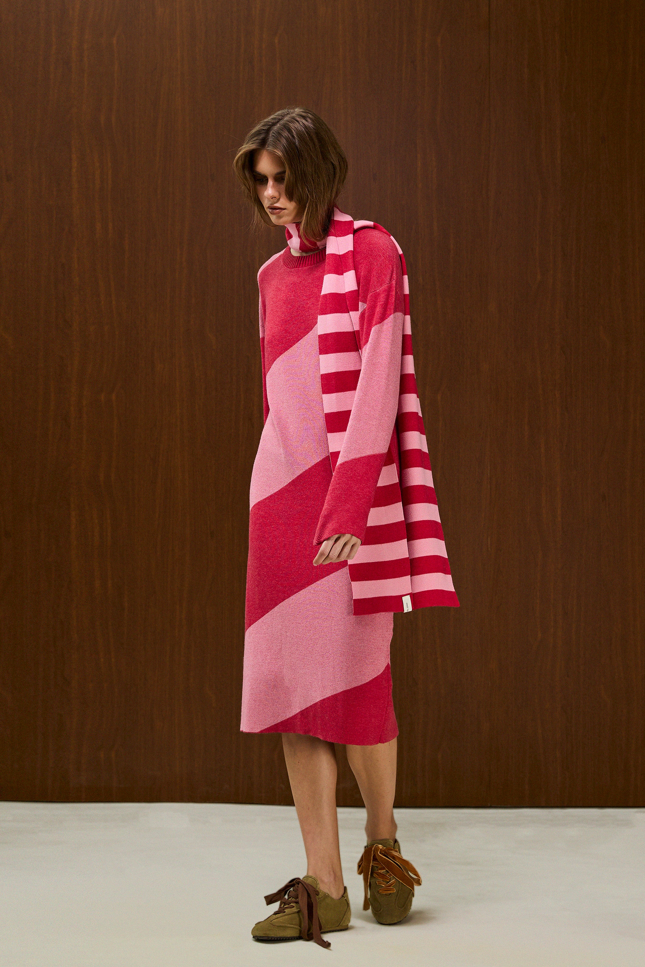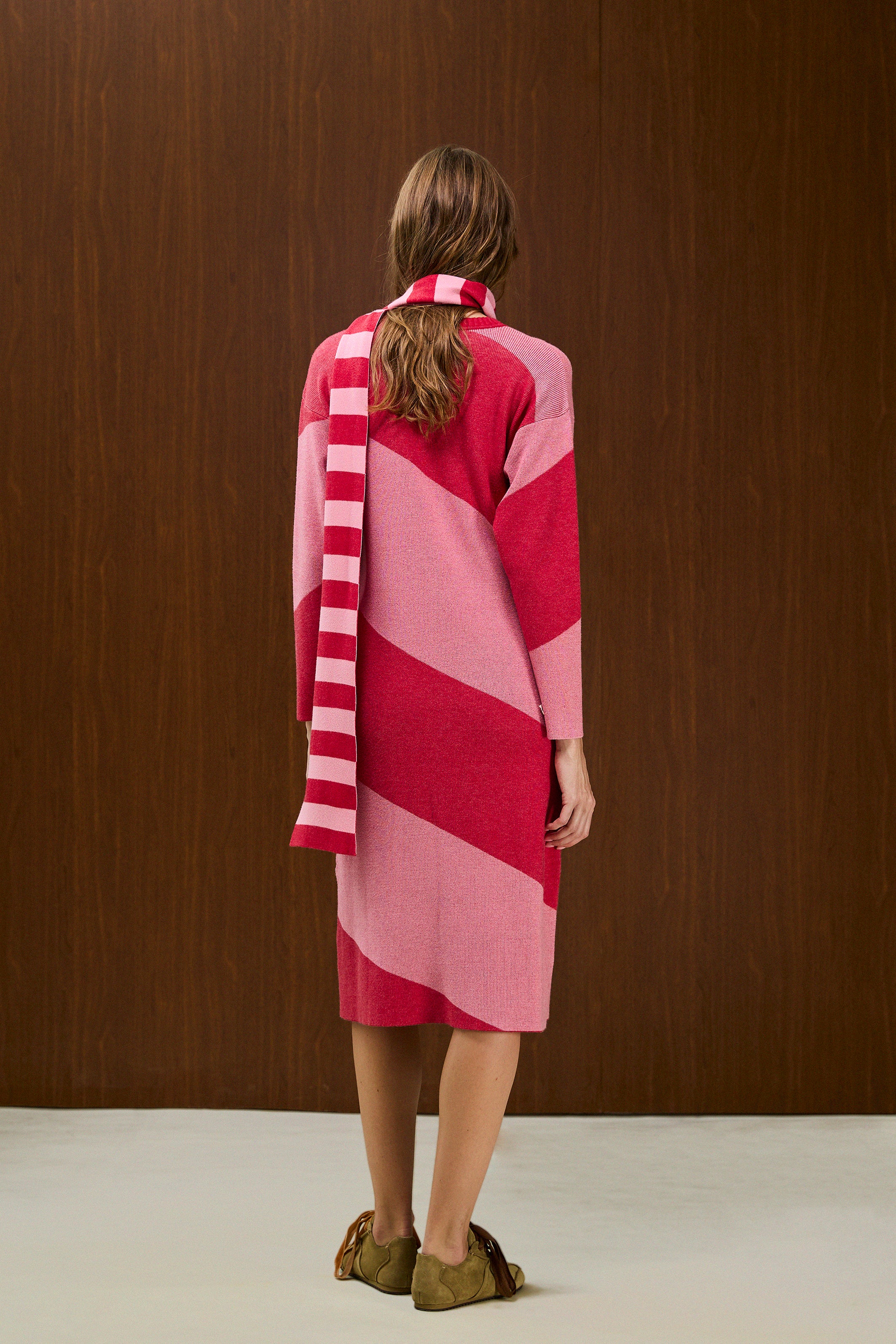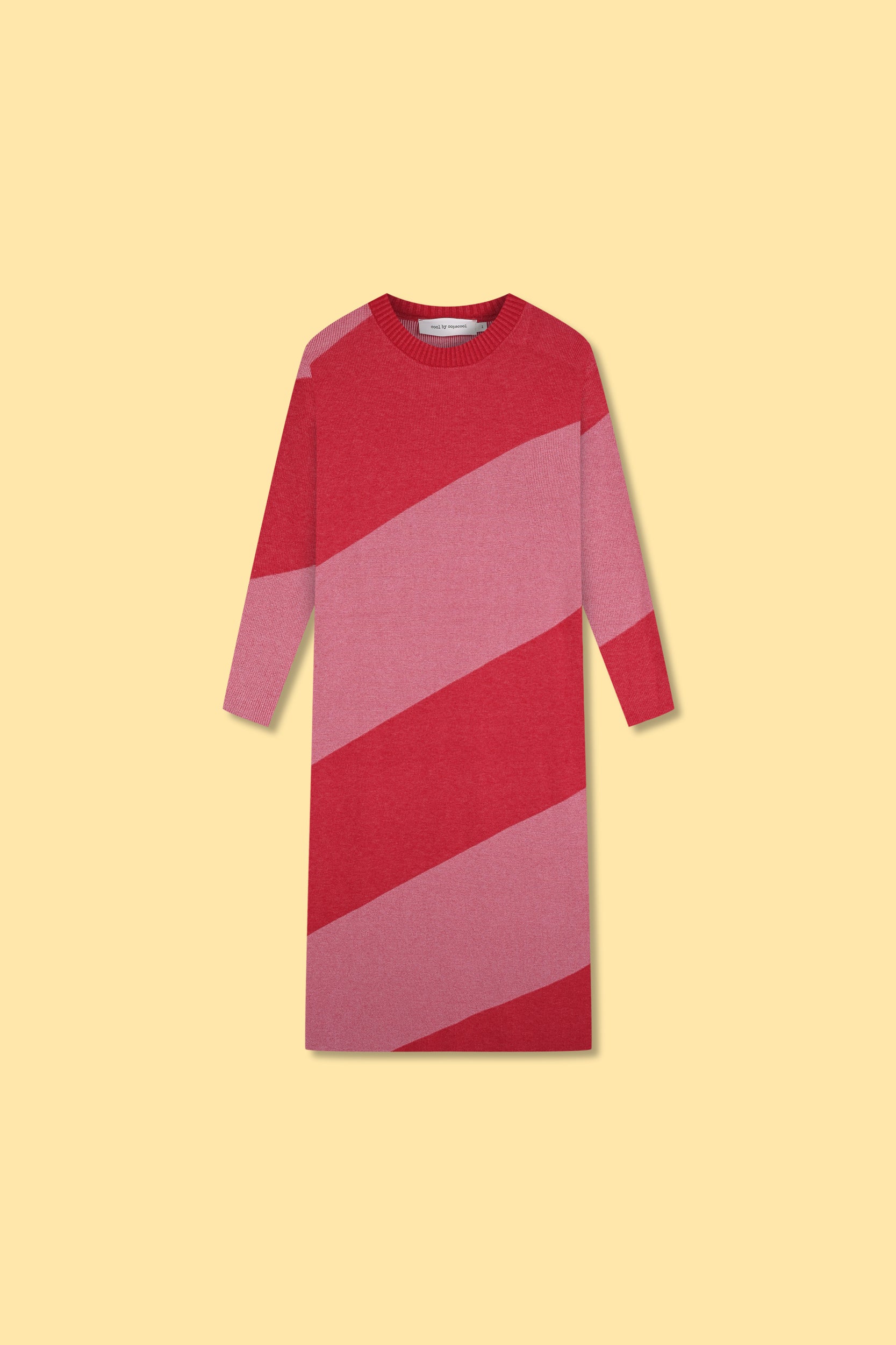 Knit dress with diagonal wide stripes features a crew neckline, long sleeves, and a straight silhouette.