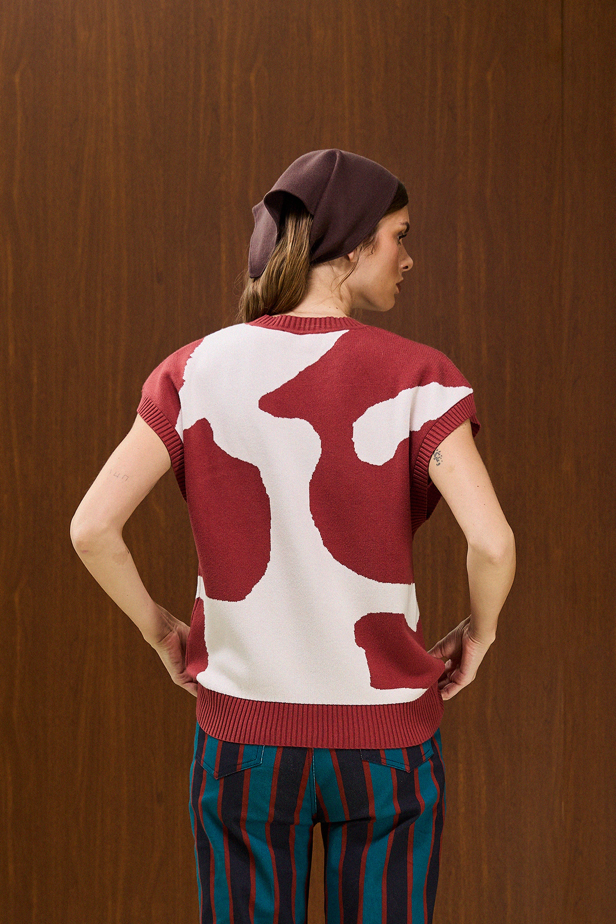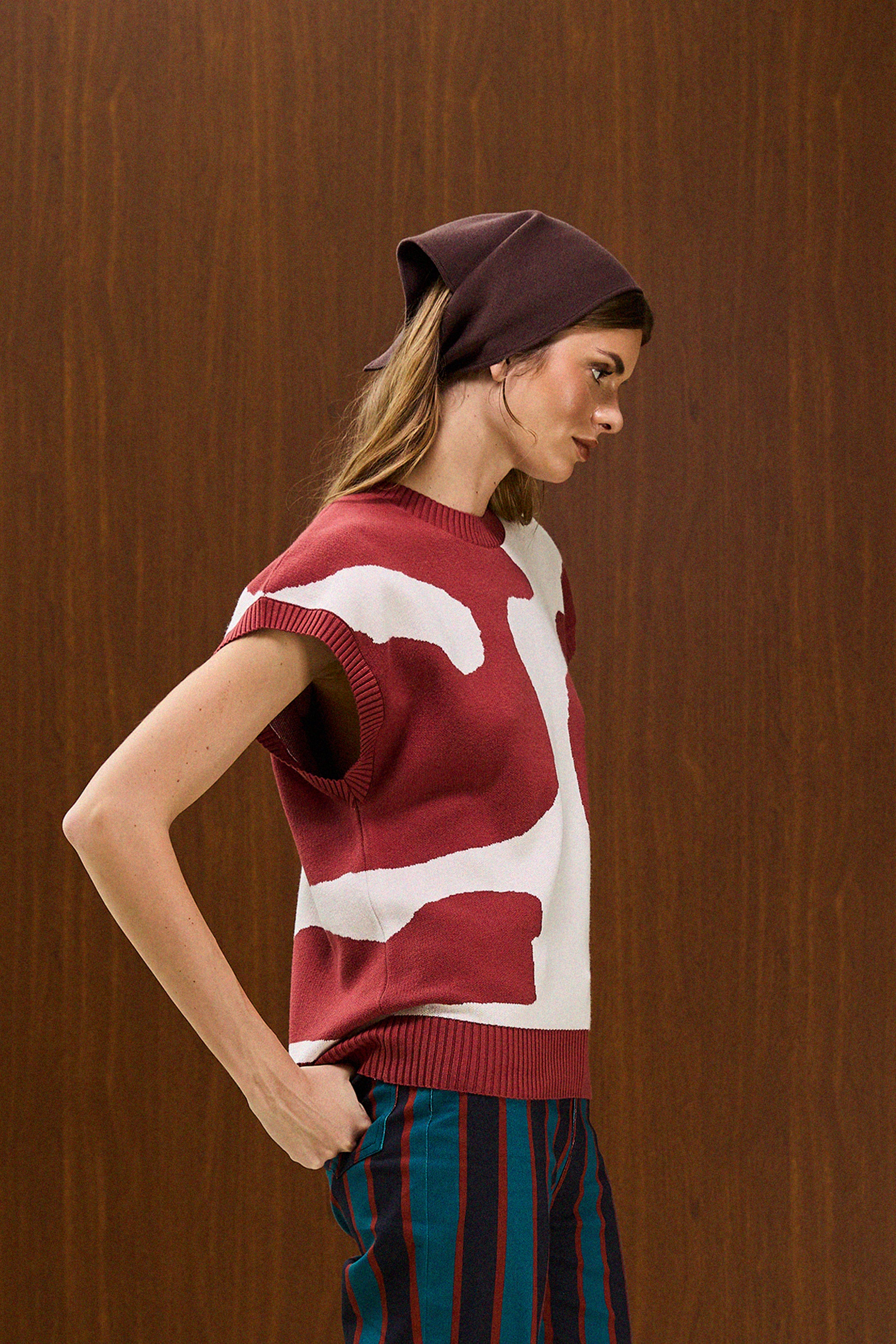 Sleeveless knitted vest with a crew neckline, dropped shoulders, and ribbed finishes at the neck, armholes, and hem