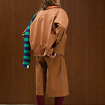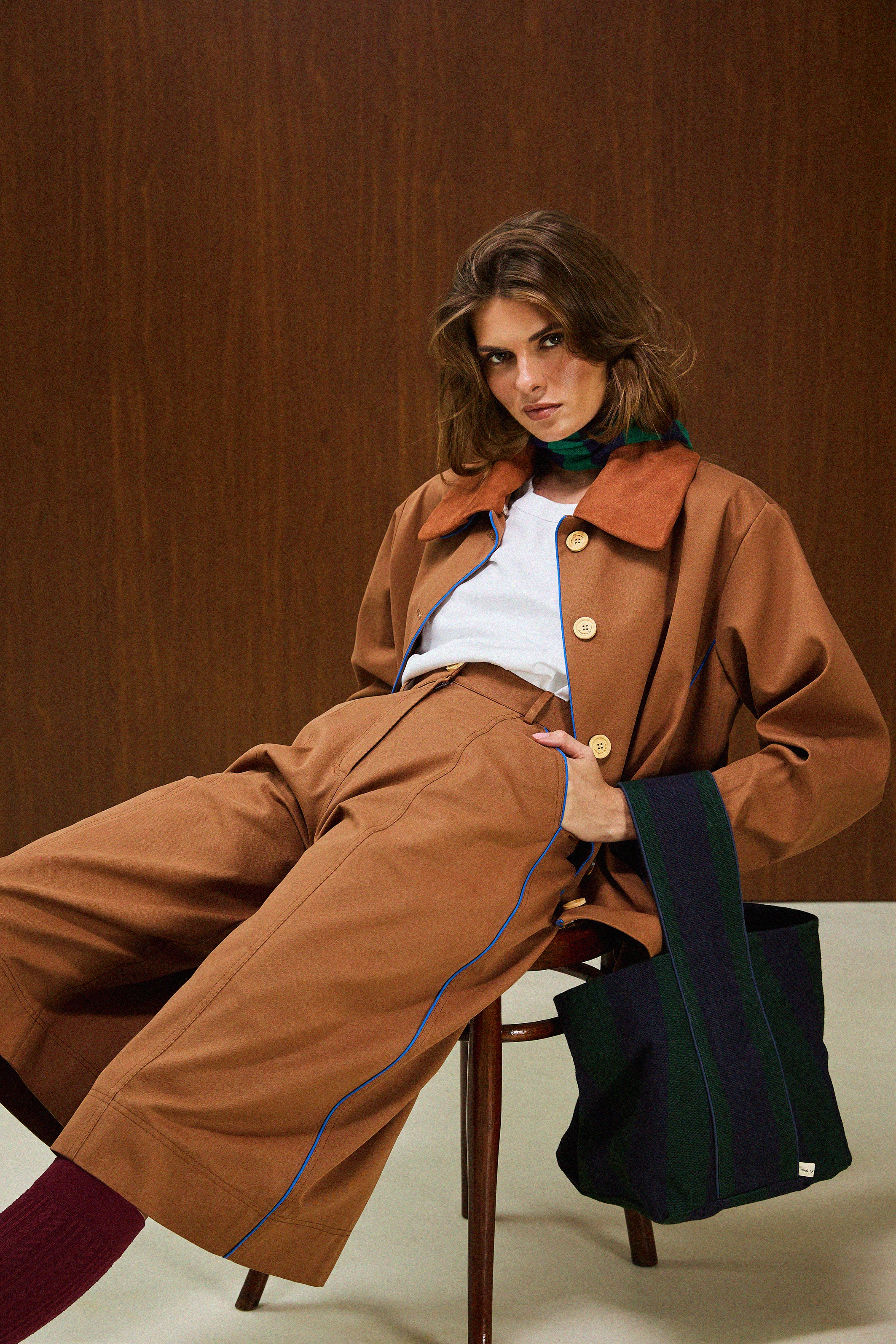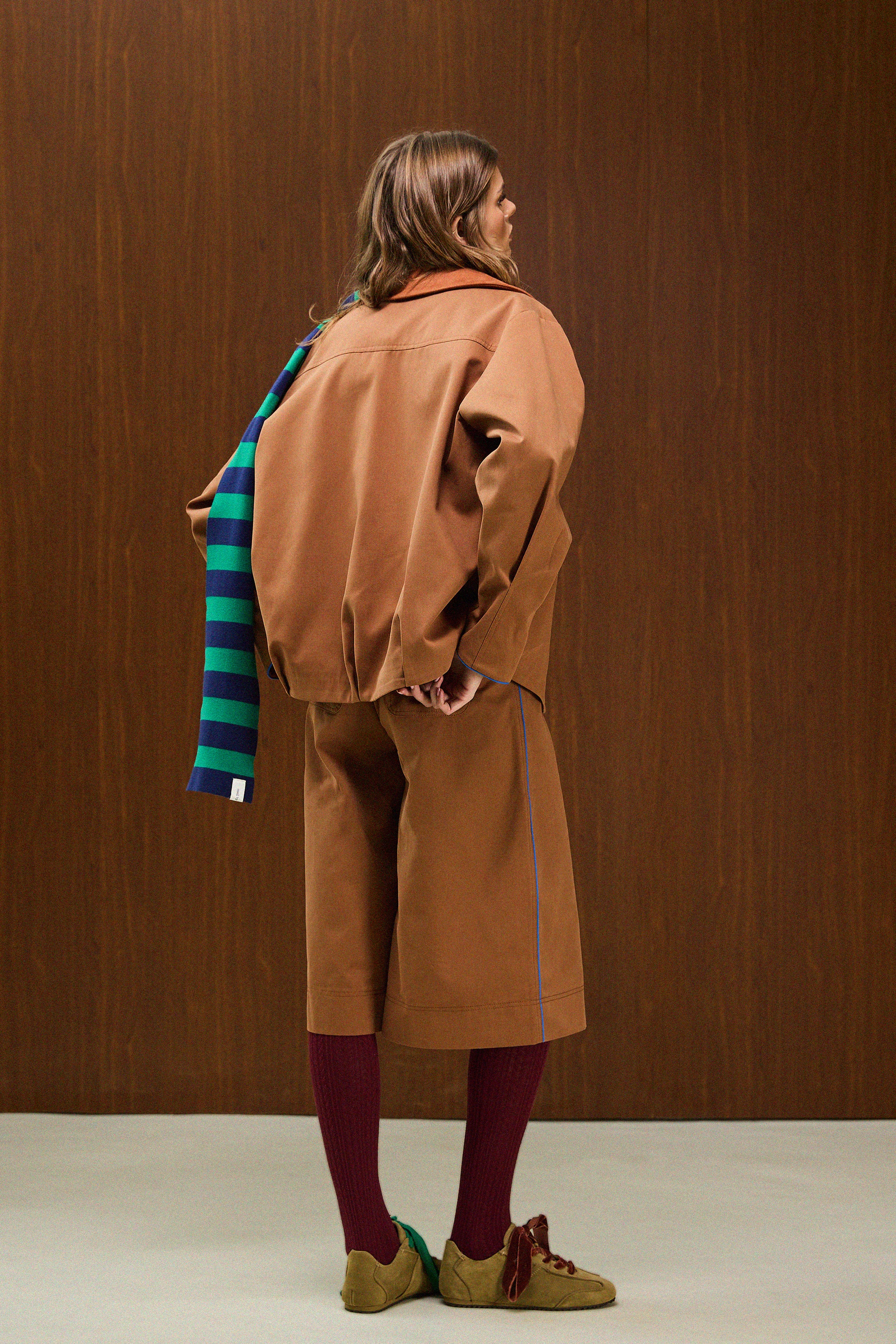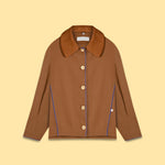 Button-up jacket in brick red with a contrasting suede collar in a matching tone. Designed with long sleeves, front button closure, and side seams highlighted with fine blue piping.