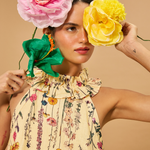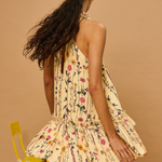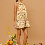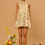 100% linen. Sleeveless, ruffled collar, ruffle details, wide skirt, short dress. The model is wearing a size XS.