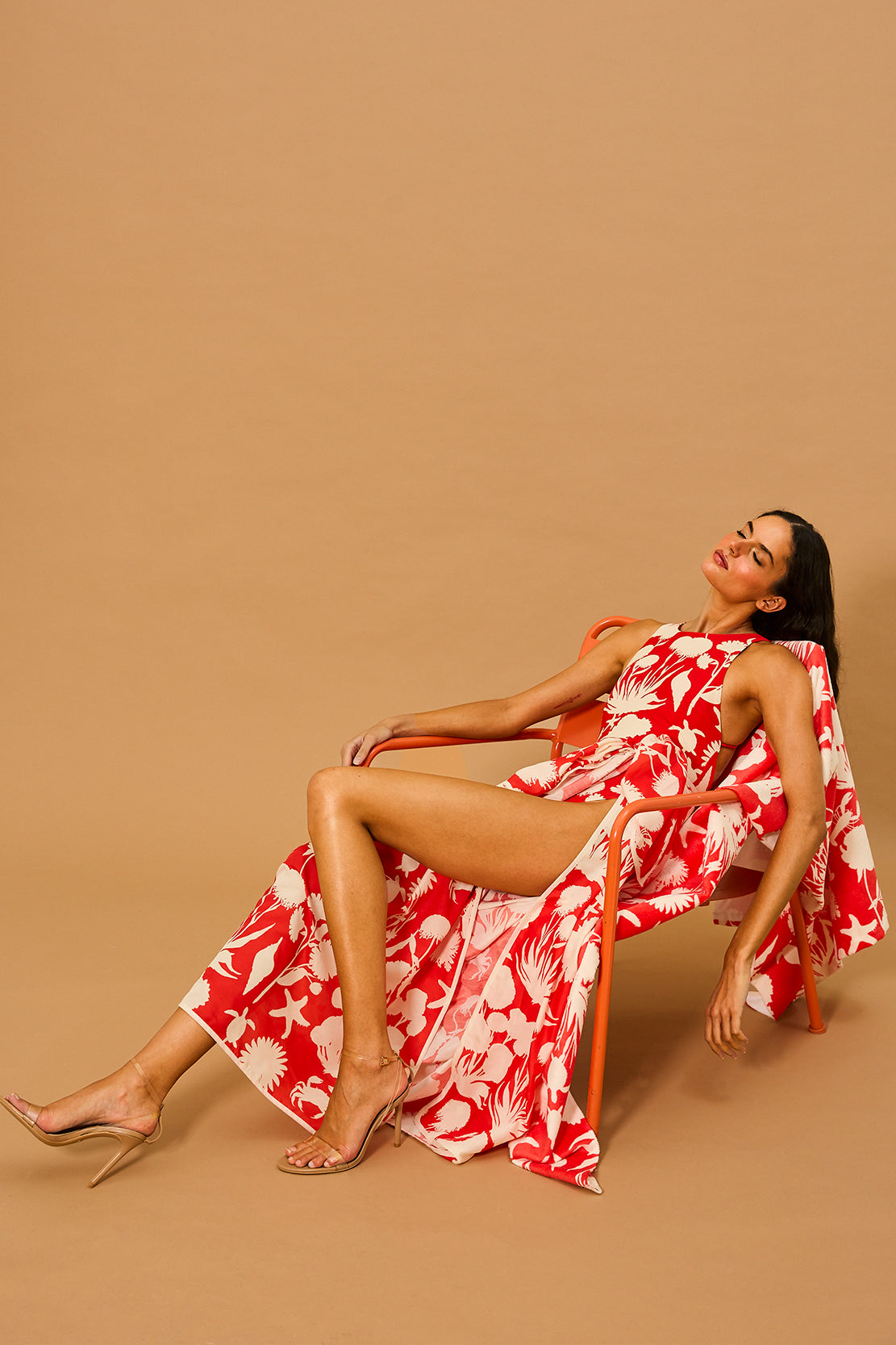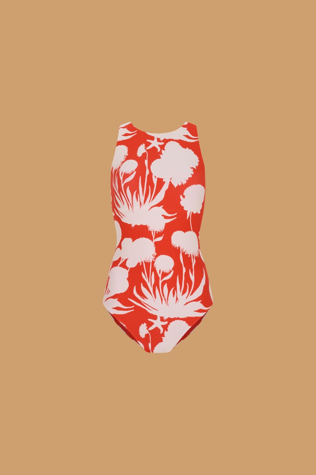 Backless halter swimsuit with crisscross straps. Removable cups, underwire, and medium coverage bottom.
