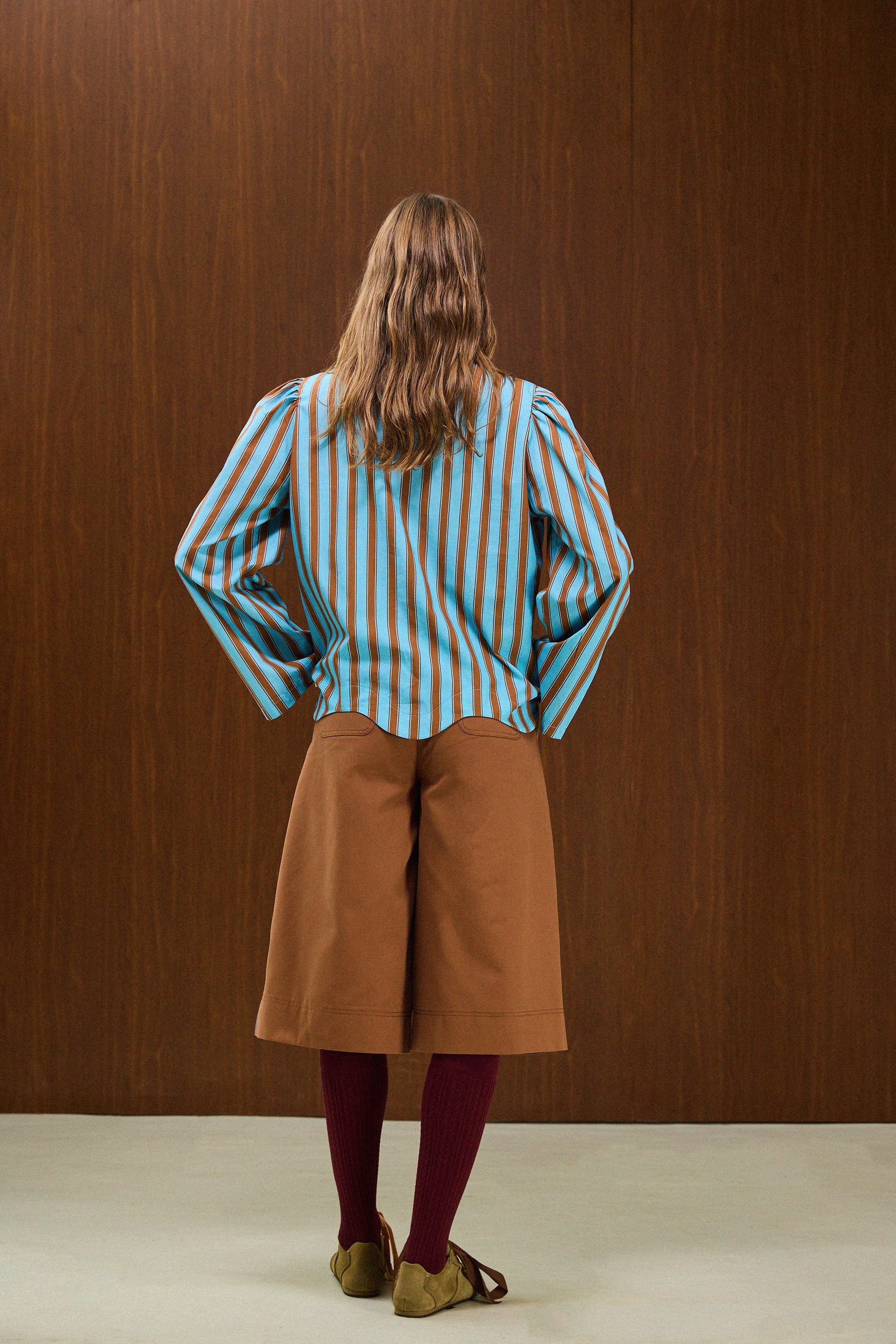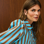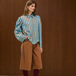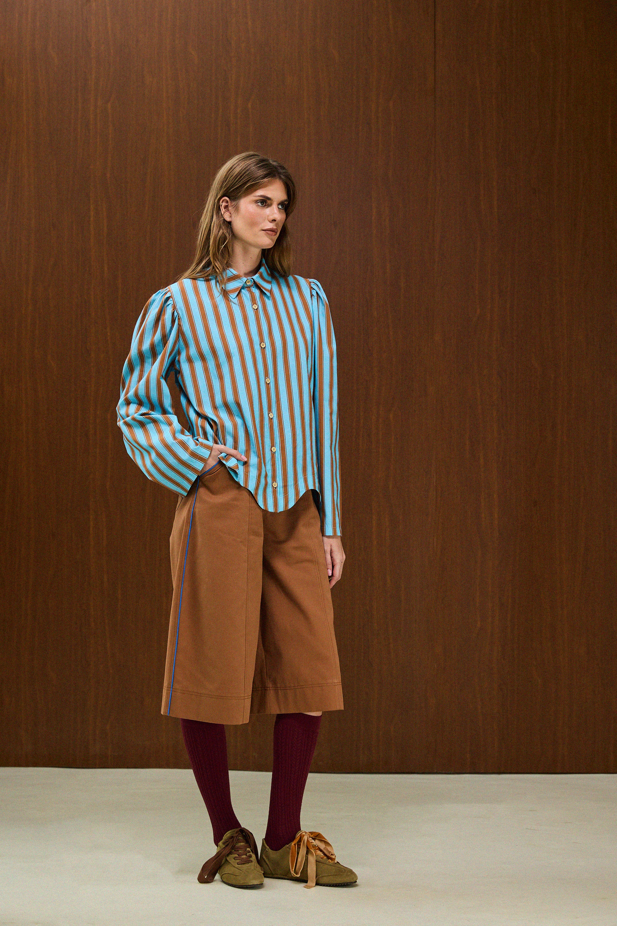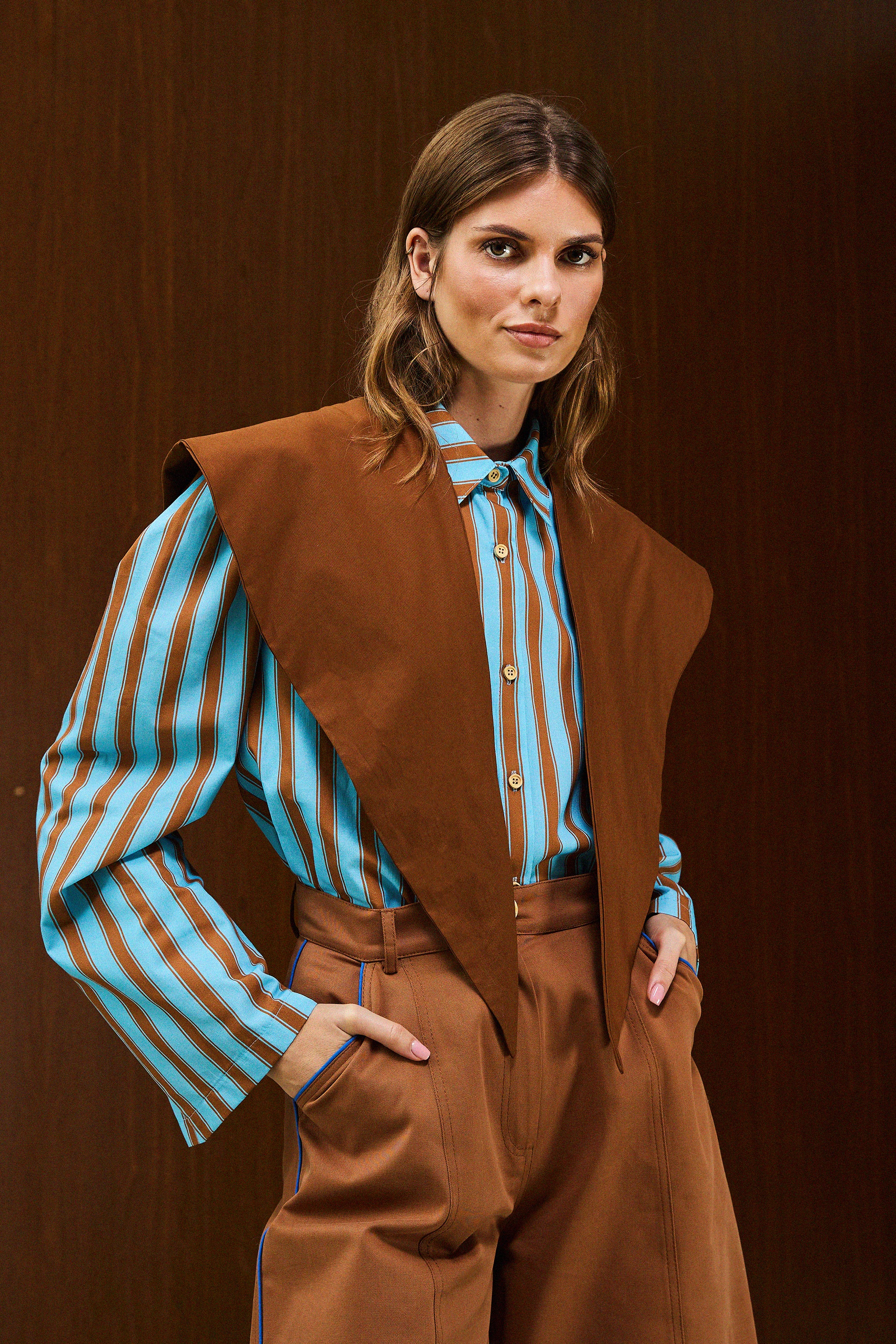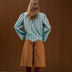 Long-sleeve shirt with brown diagonal stripes on a blue base. Classic shirt collar, with natural wood buttons with calloped hemline detail