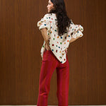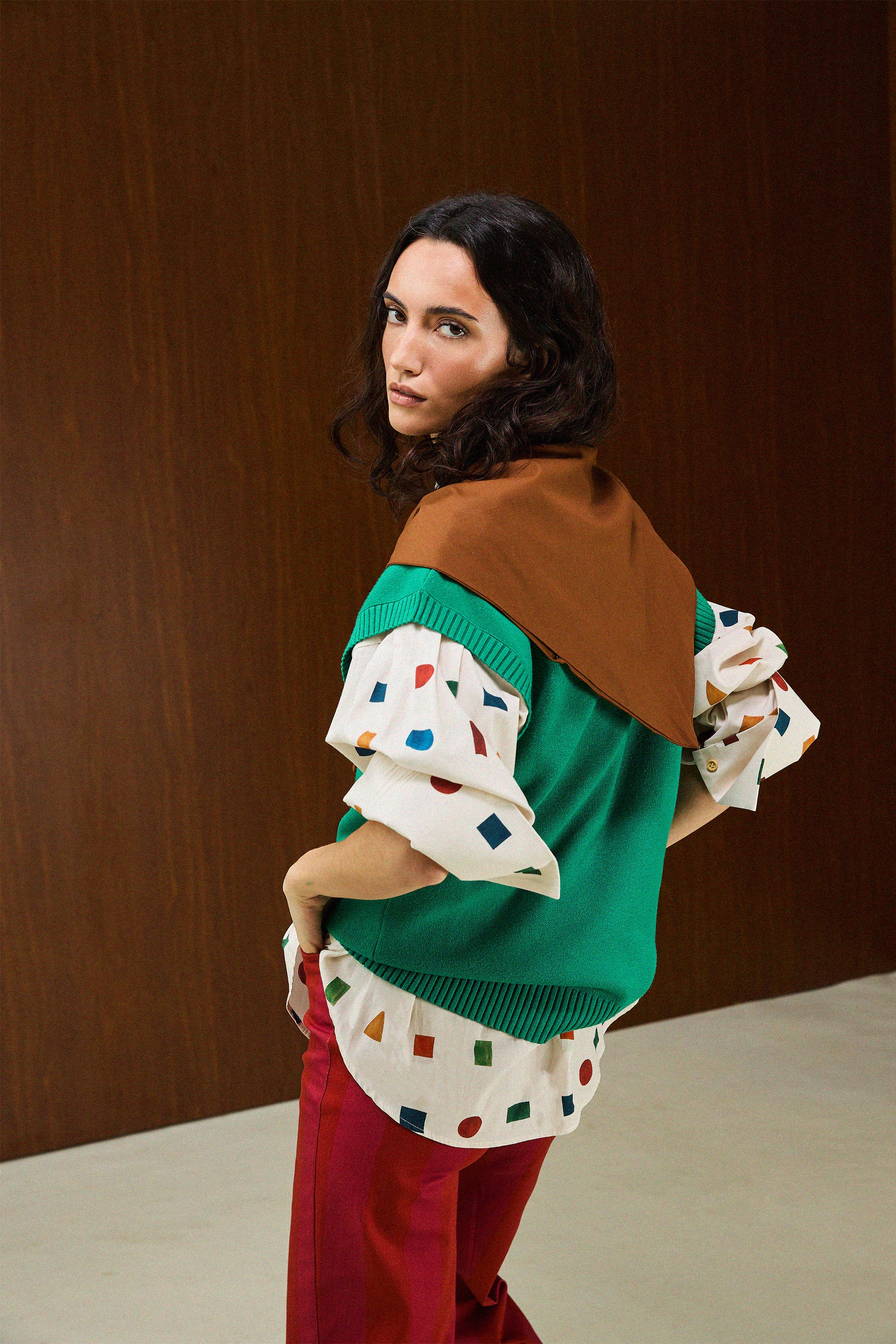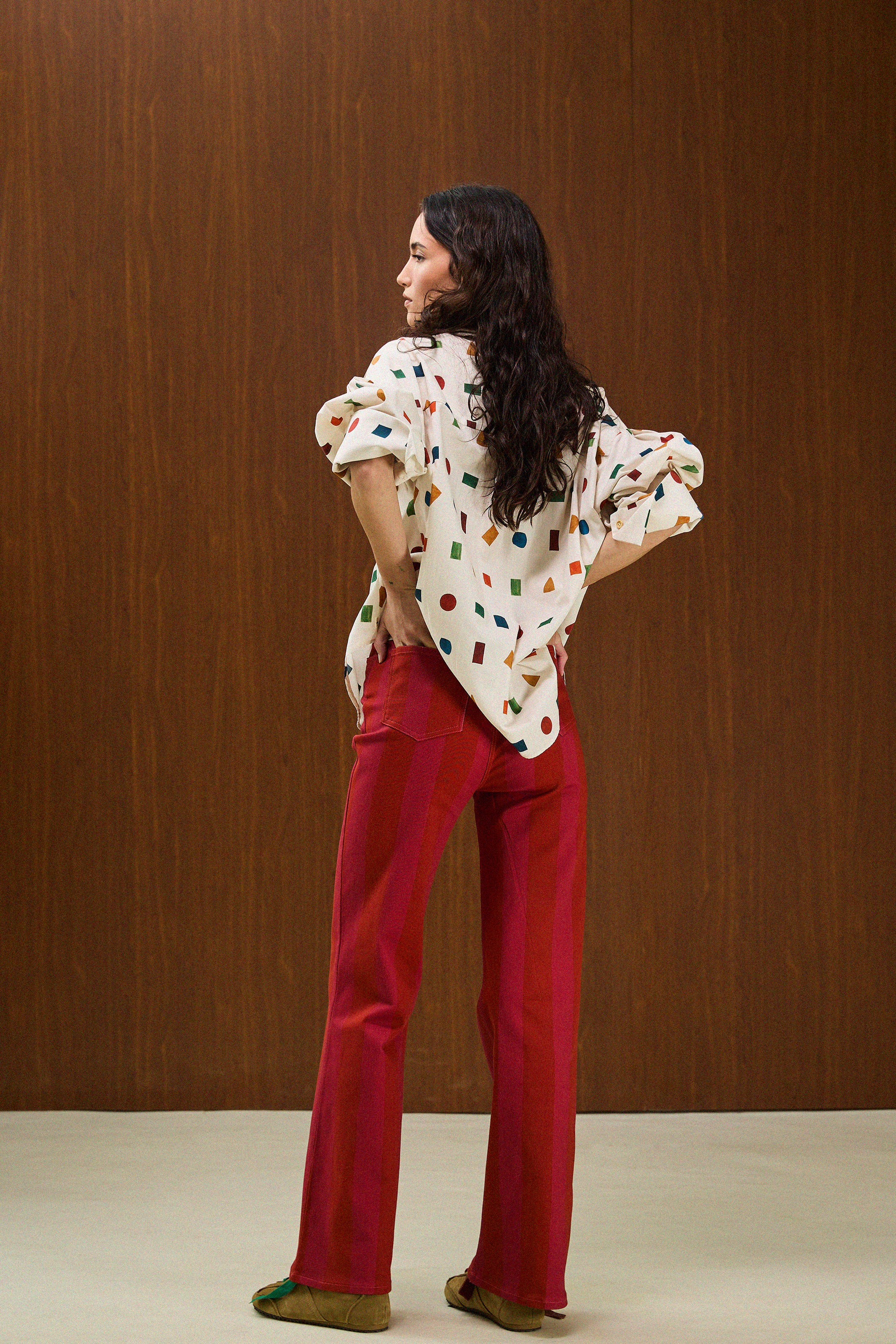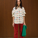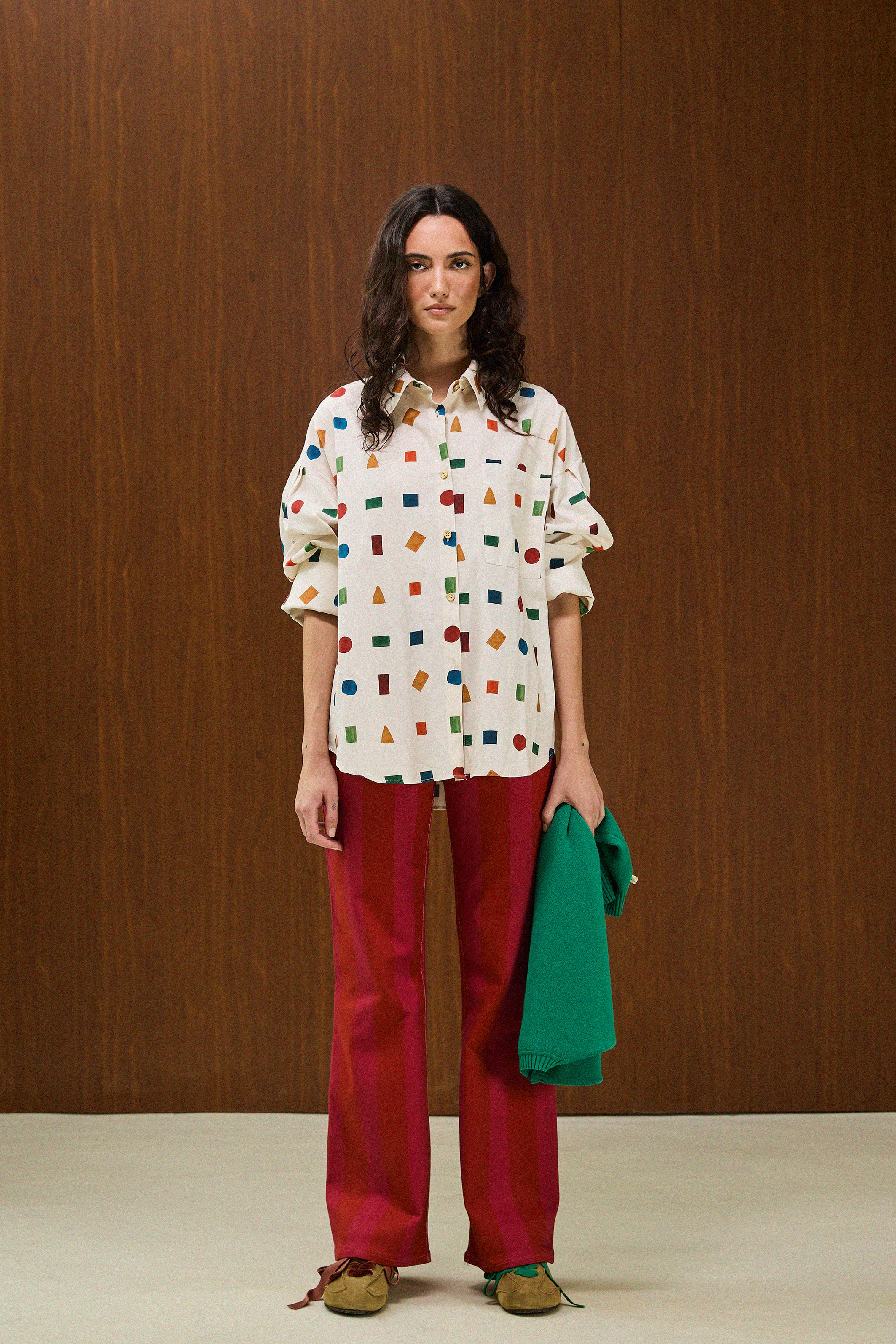 Shirt with wooden buttons down the front, wide cuffs, dropped shoulders, pleat detail, patch pocket on the chest.