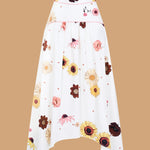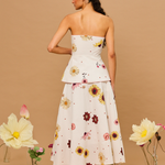 100% cotton skirt with piping details, long back, and midi length. The model is wearing a size XS.
