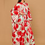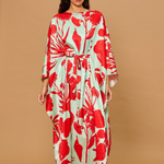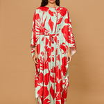 100% PES. Wide-cut, belted, straight-neck, long kaftan dress. The model is wearing a size STD.