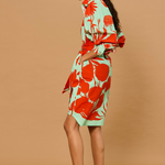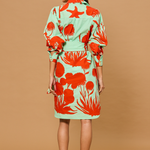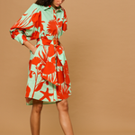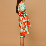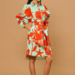100% cotton. Collared, wide sleeve cut, piping detail, front buttoned, above the knee length, belted, wide fit shirt dress. The model is wearing size XS.