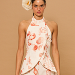 100% linen. Stand-up collar, tie at the back, adjustable with drawstrings on the sides, sleeveless top with asymmetrical hem and crossover front. The model is wearing size XS.