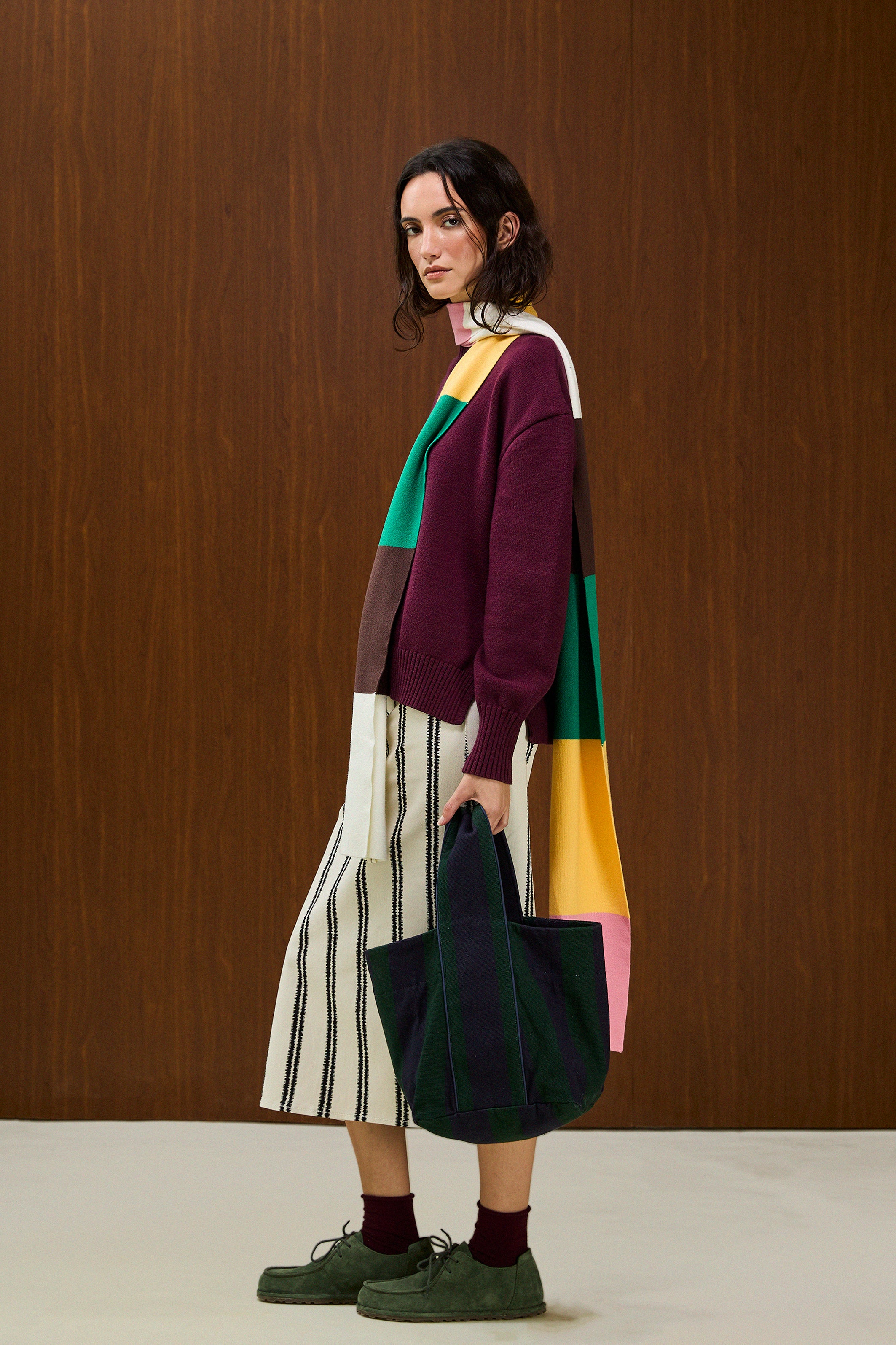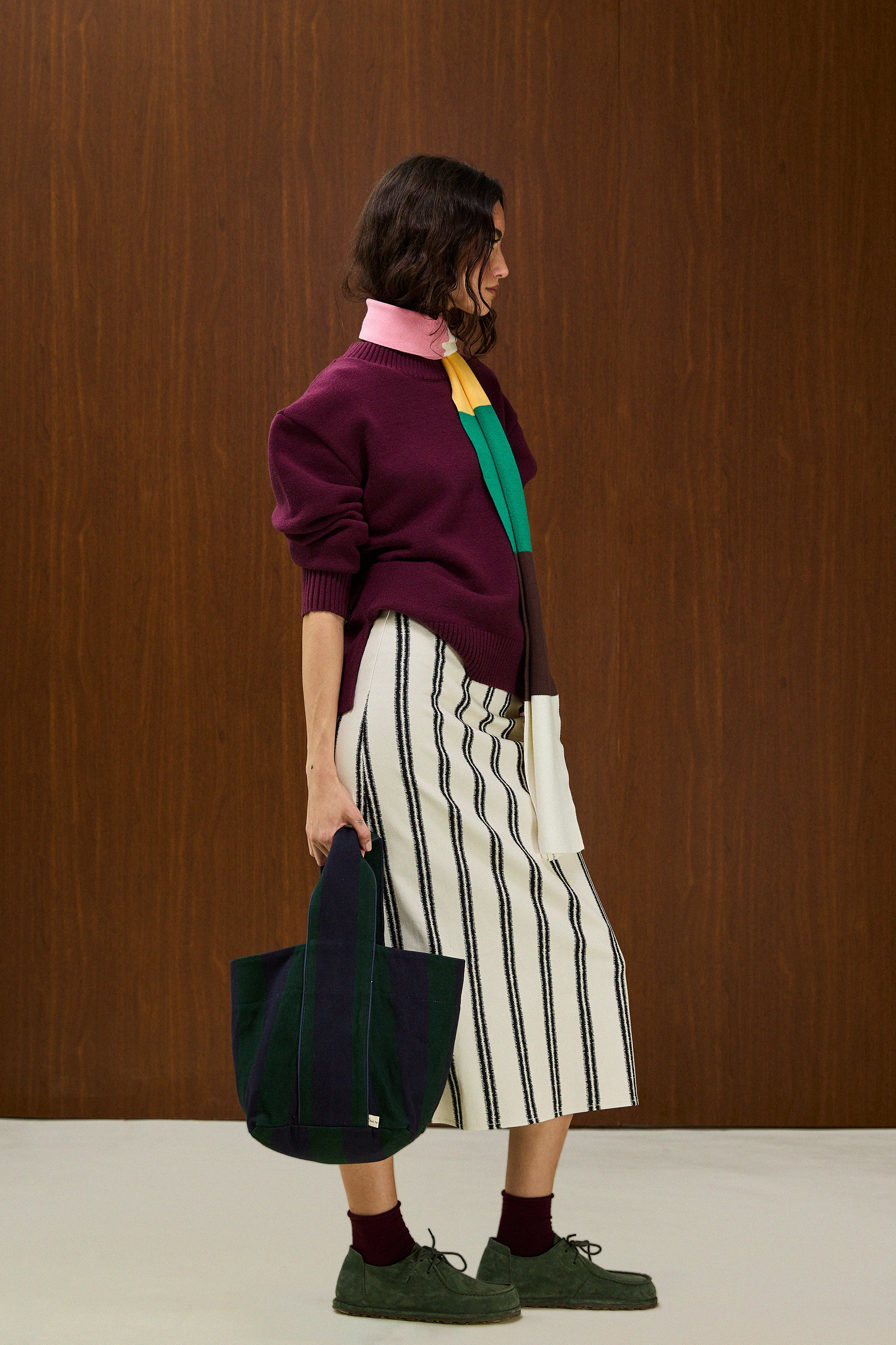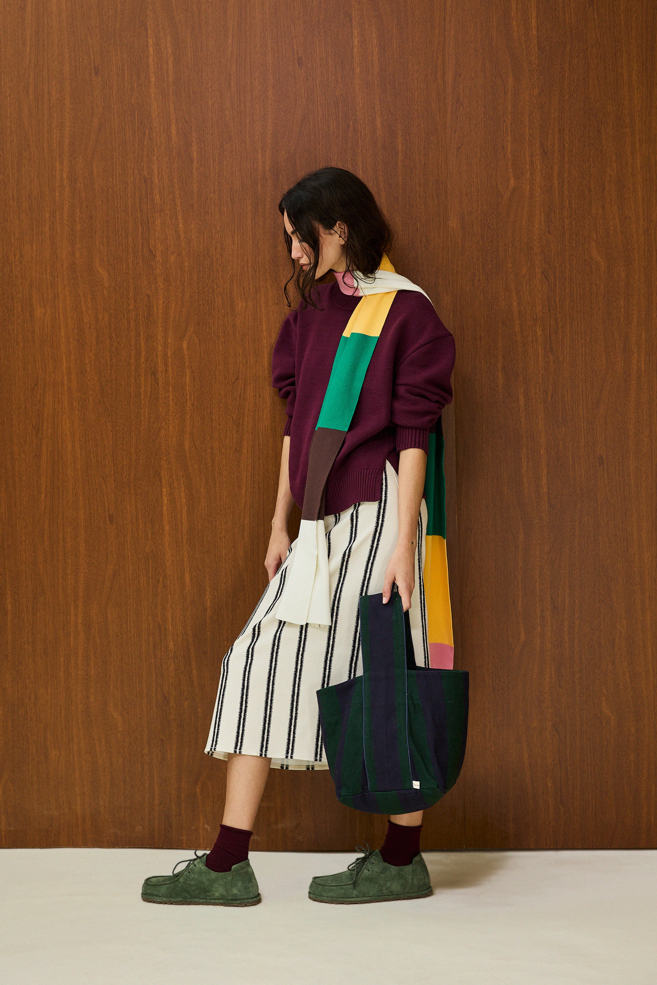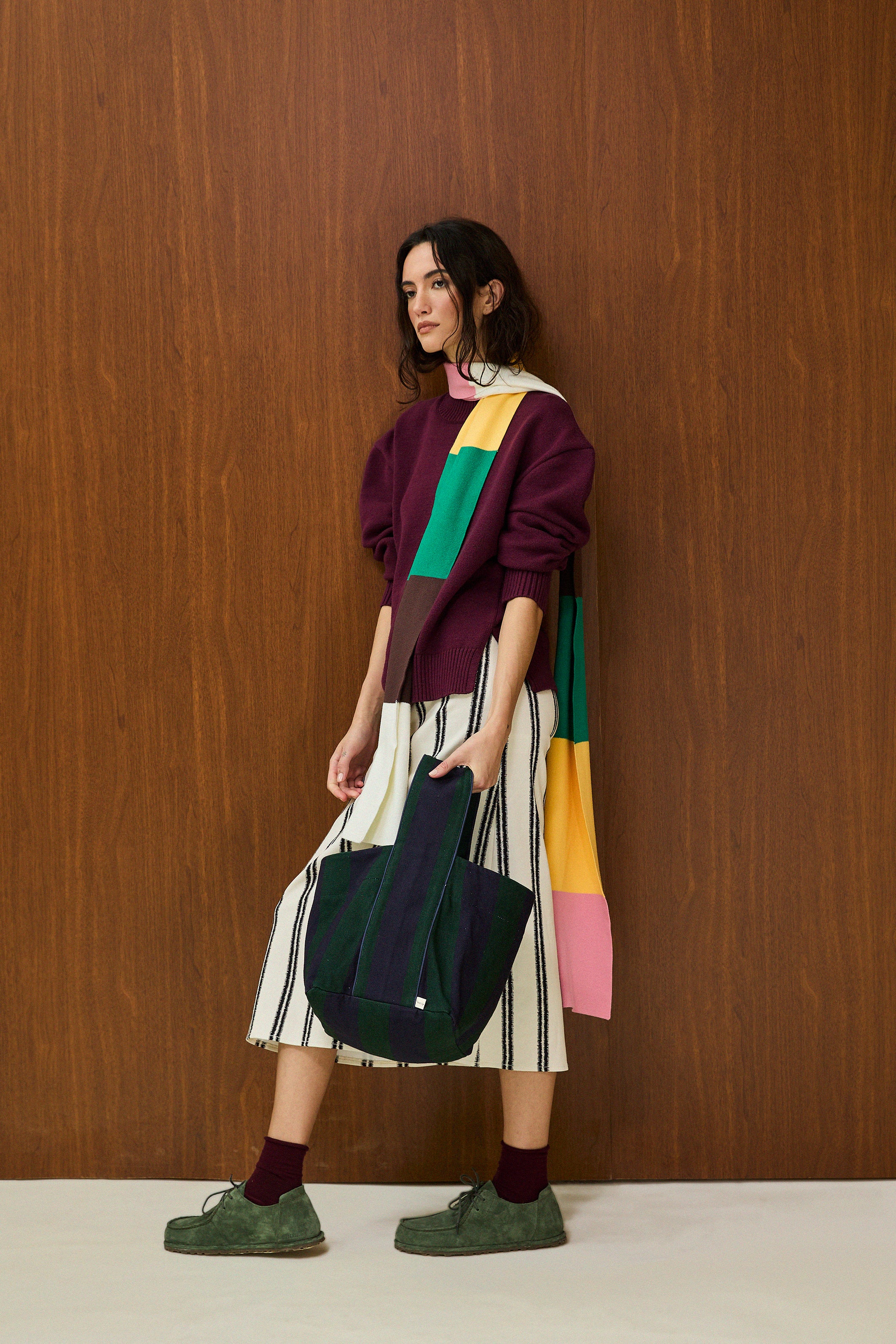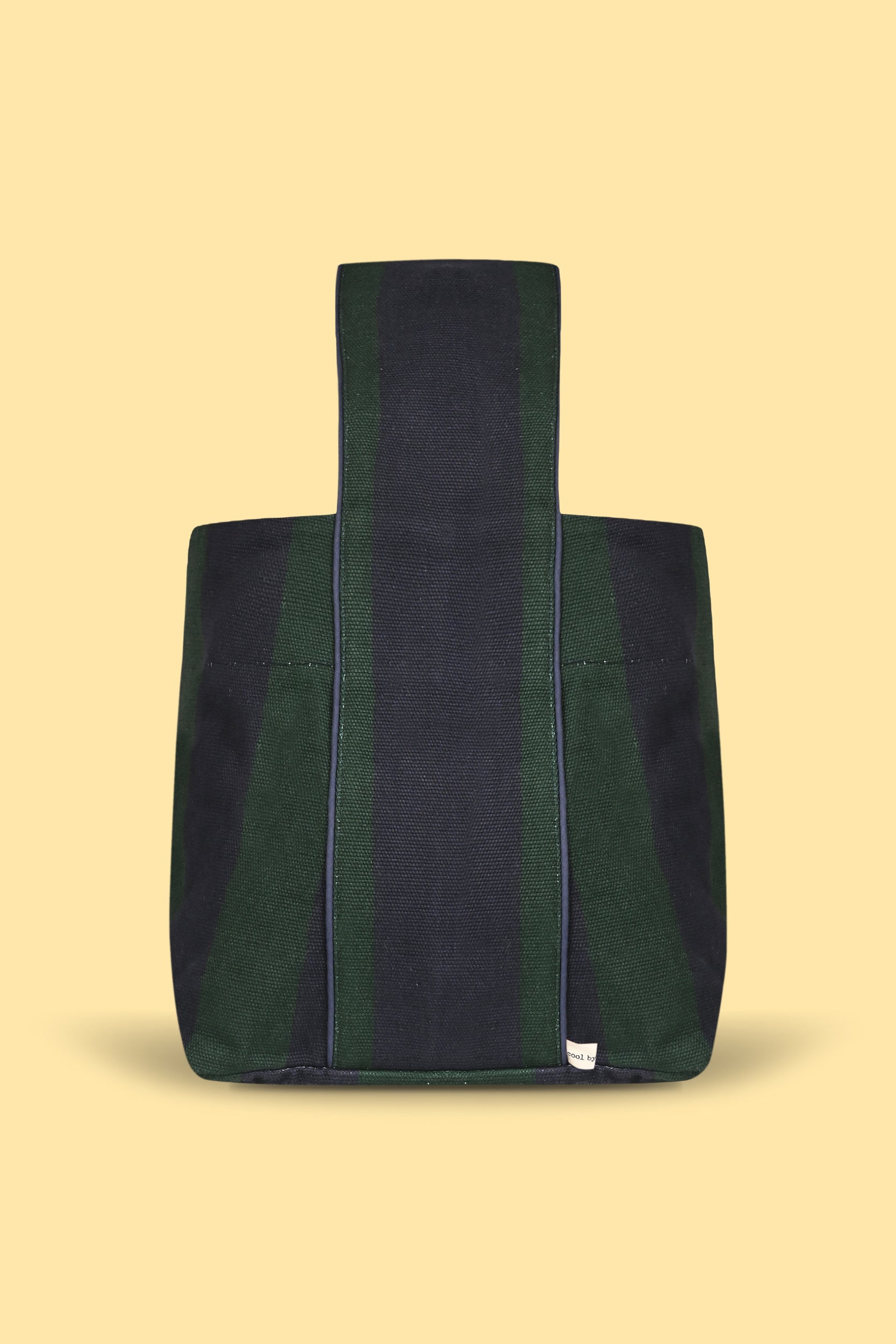 A canvas fabric tote bag with vertical green stripes on a navy blue base. The bag features a wide, continuous handle integrated into the body, designed for carrying by hand or on the wrist.