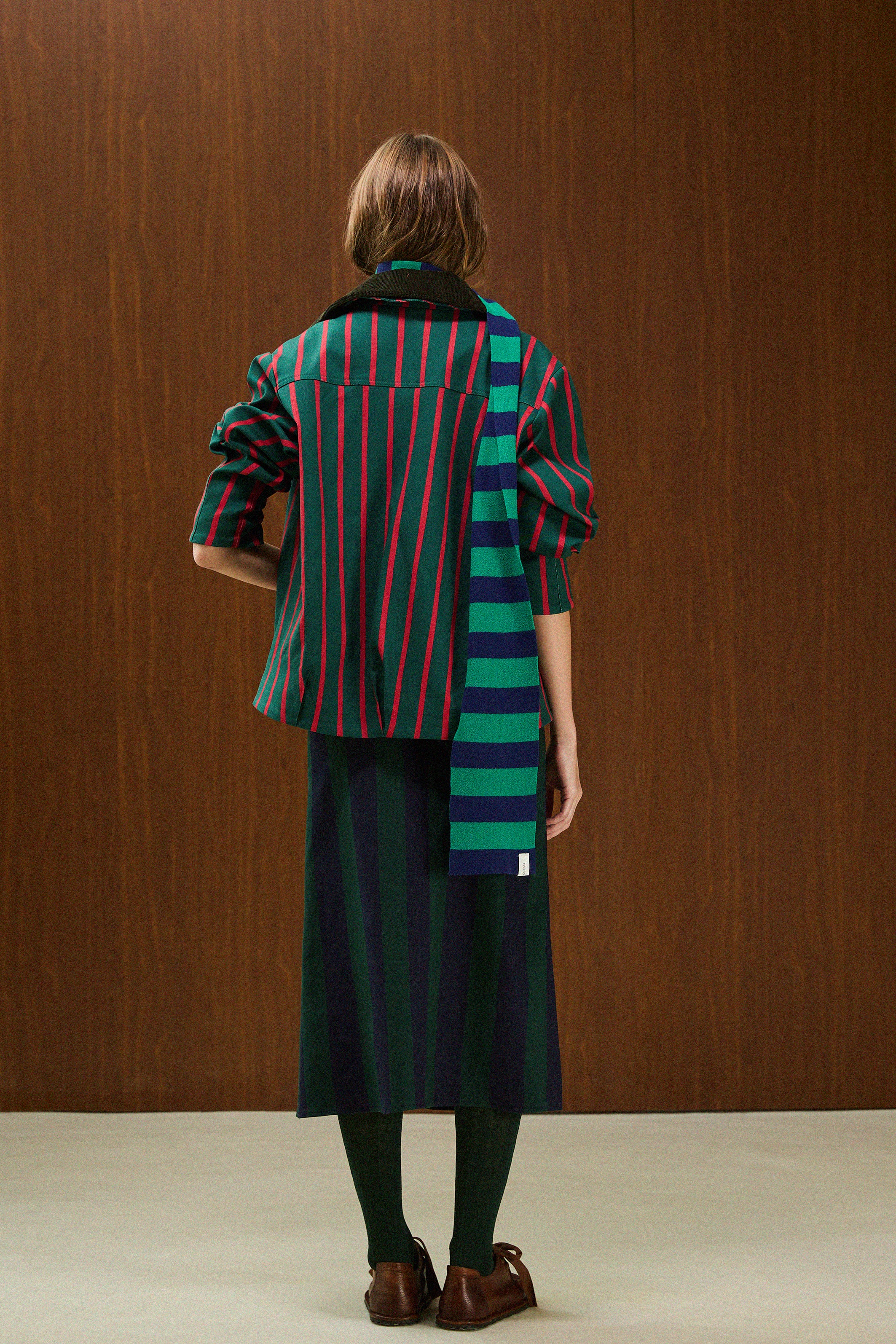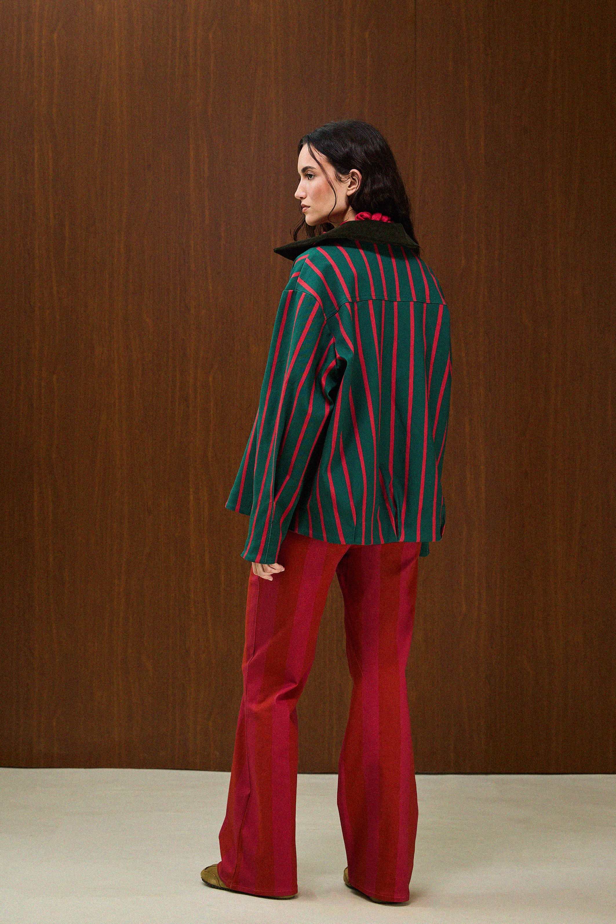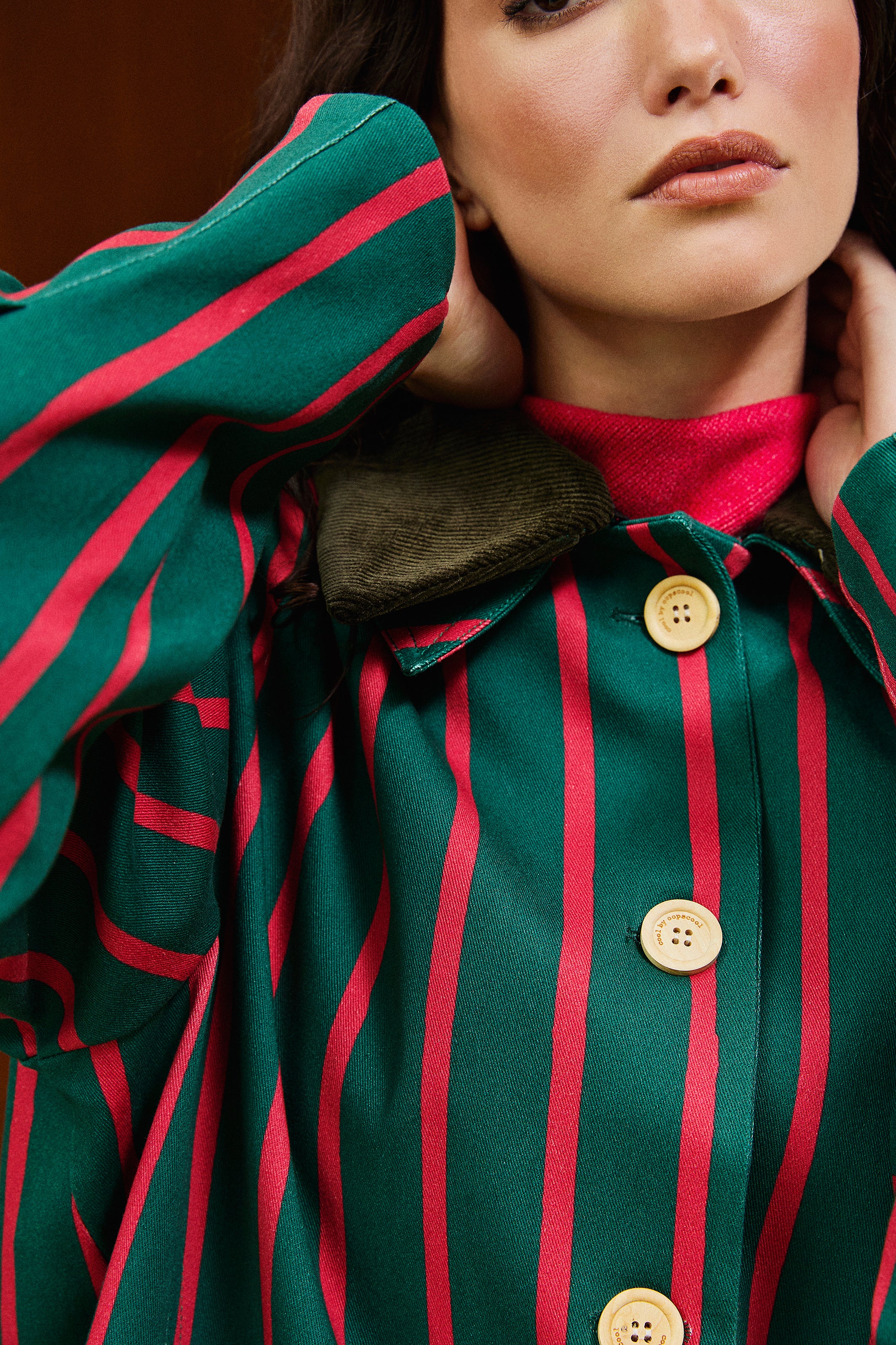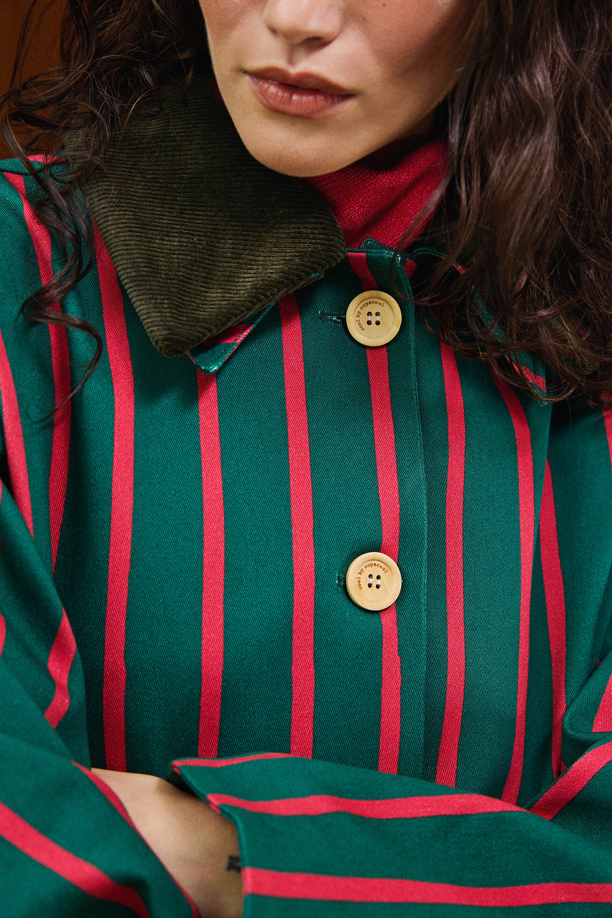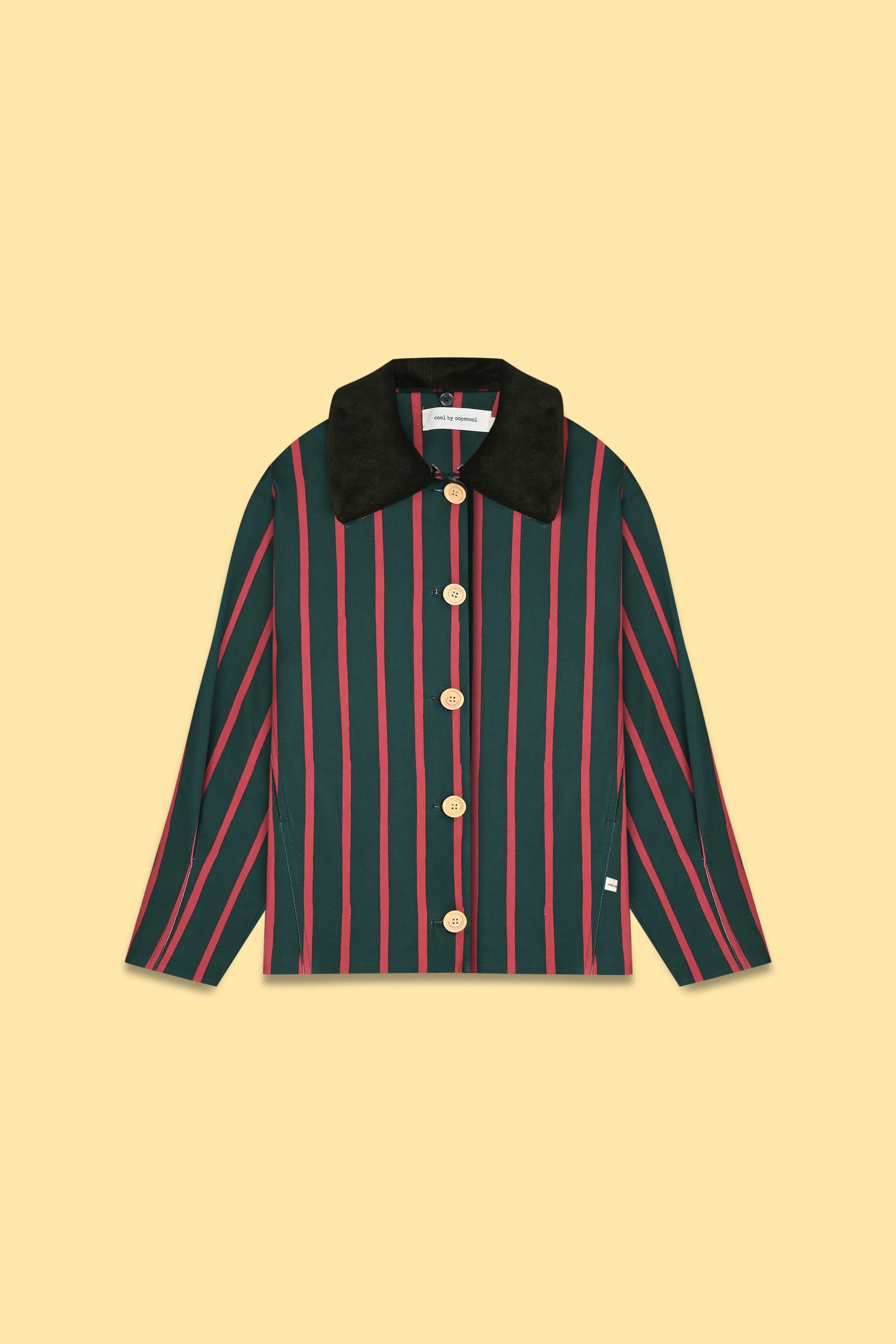 Wide-cut short jacket with a detachable velvet collar and buttoned pleat detail on the front.