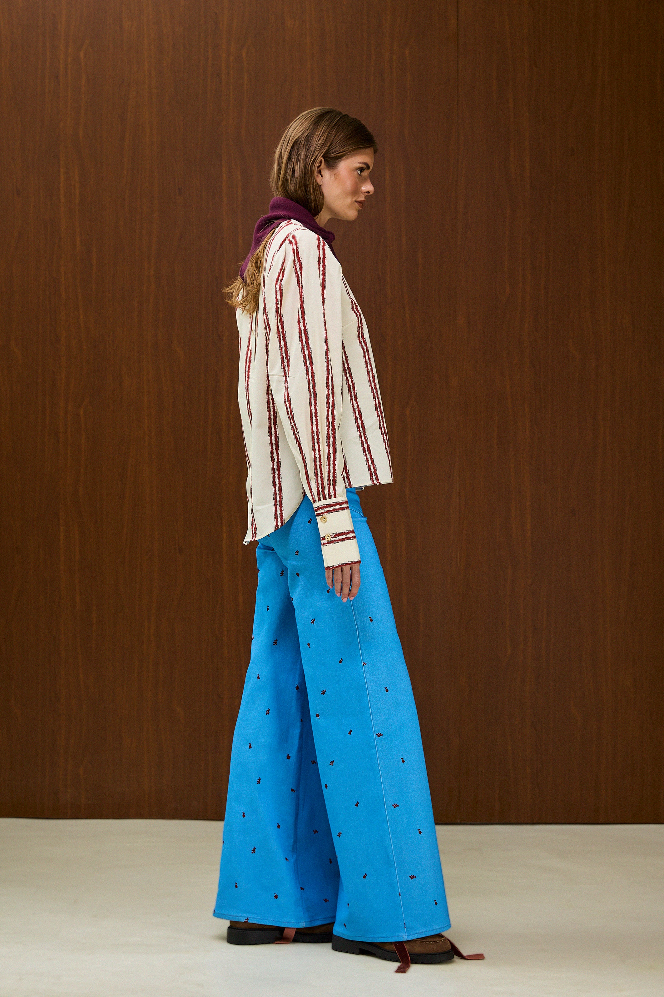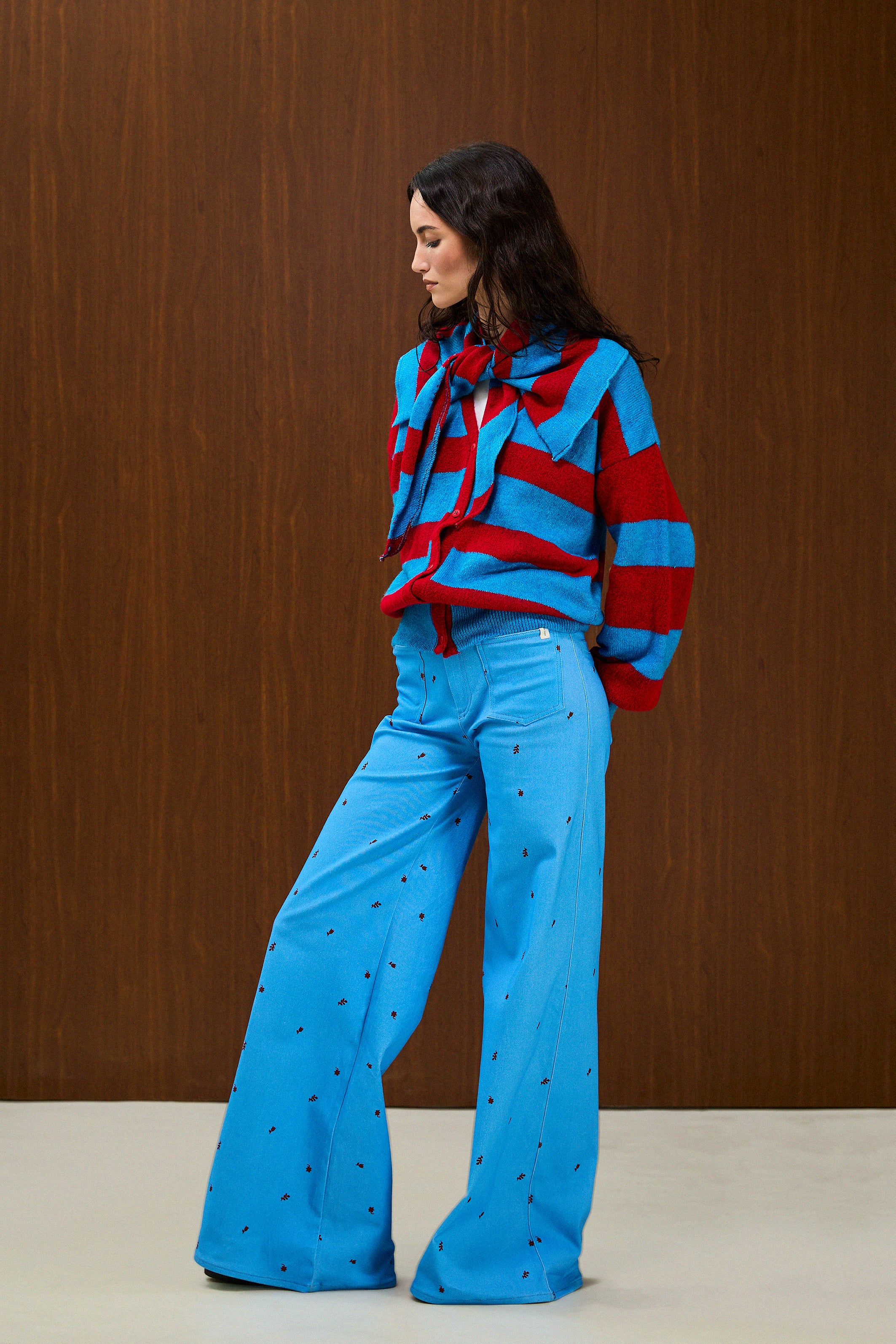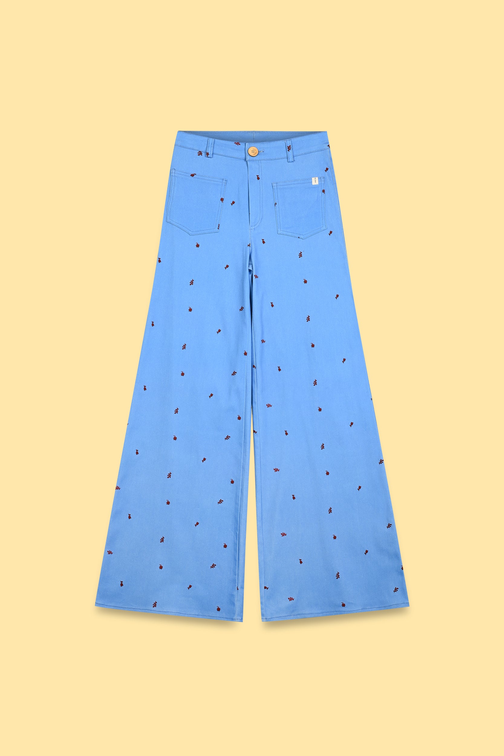 High-waist wide-leg trousers in sky blue with tiny leaf pattern. Designed with front patch pockets, a front wooden button and zip closure. Relaxed, full-length fit with straight cut.