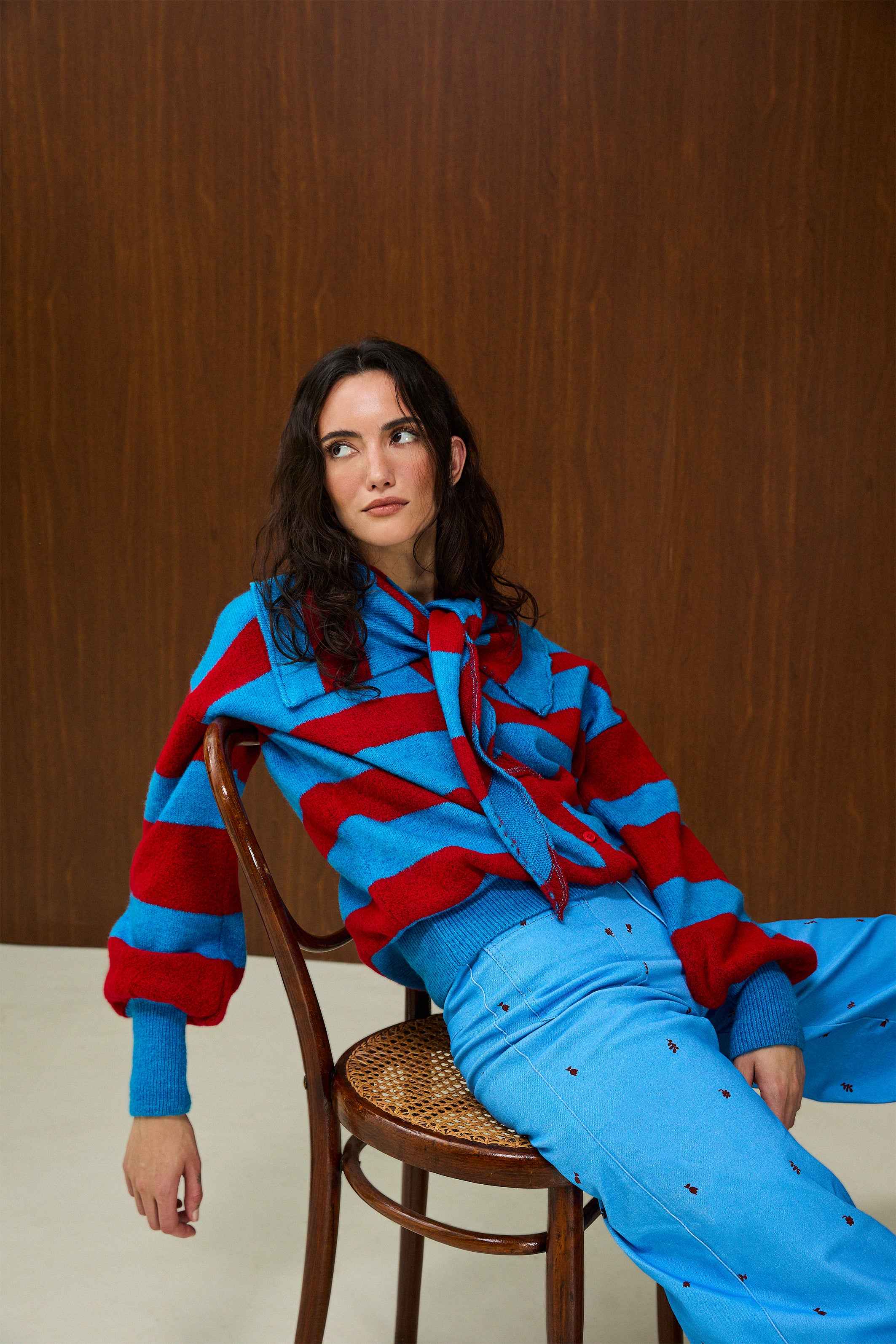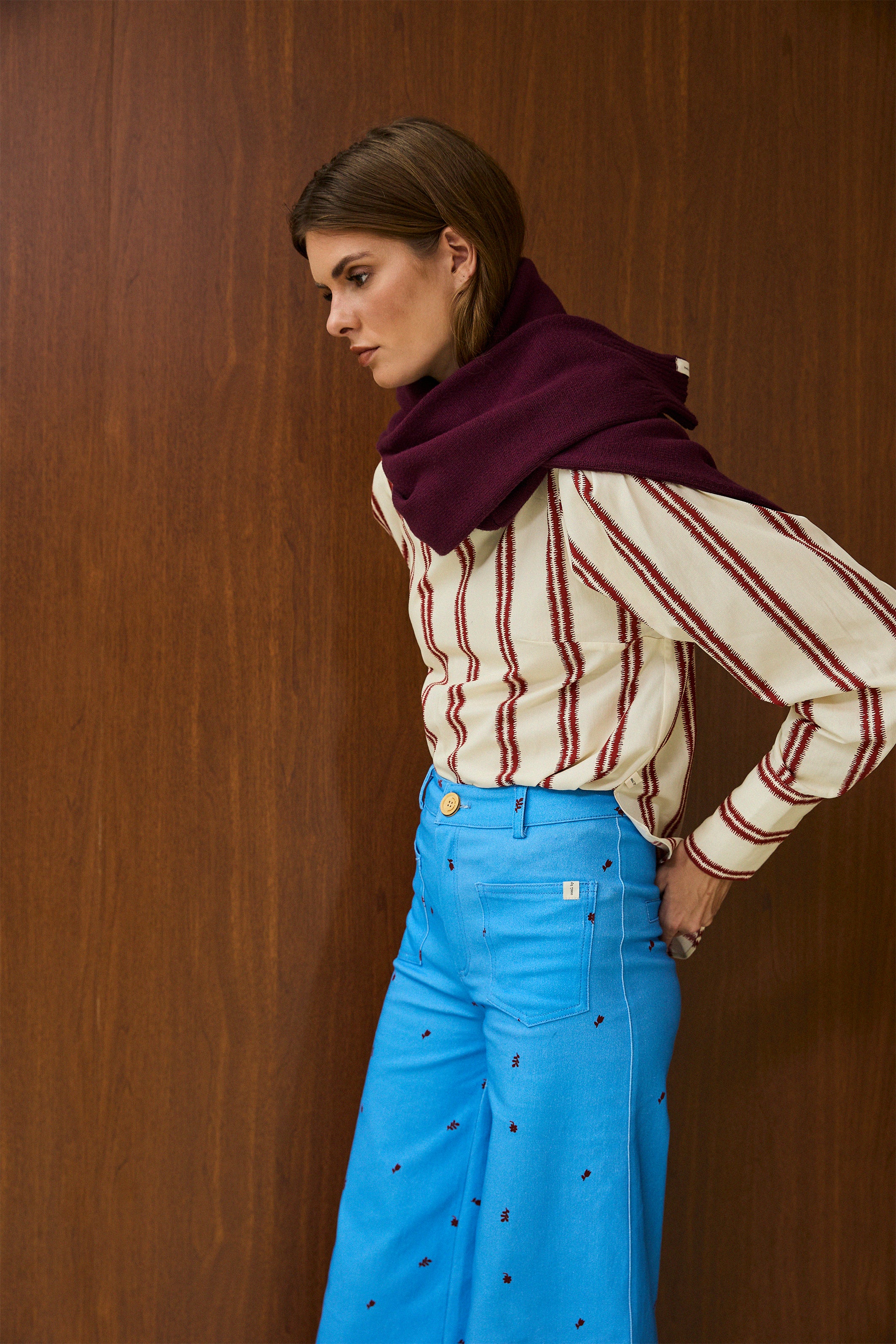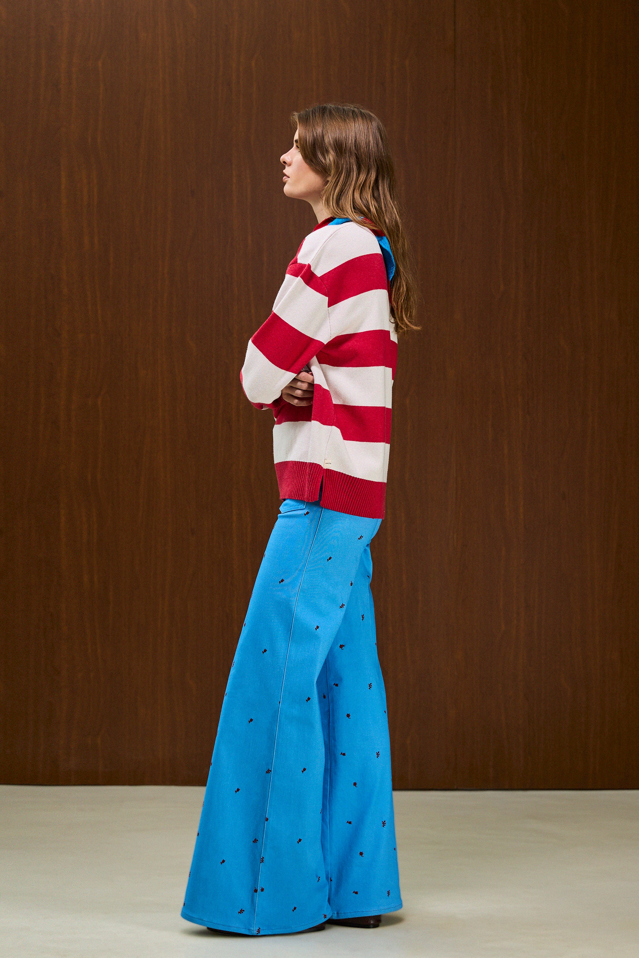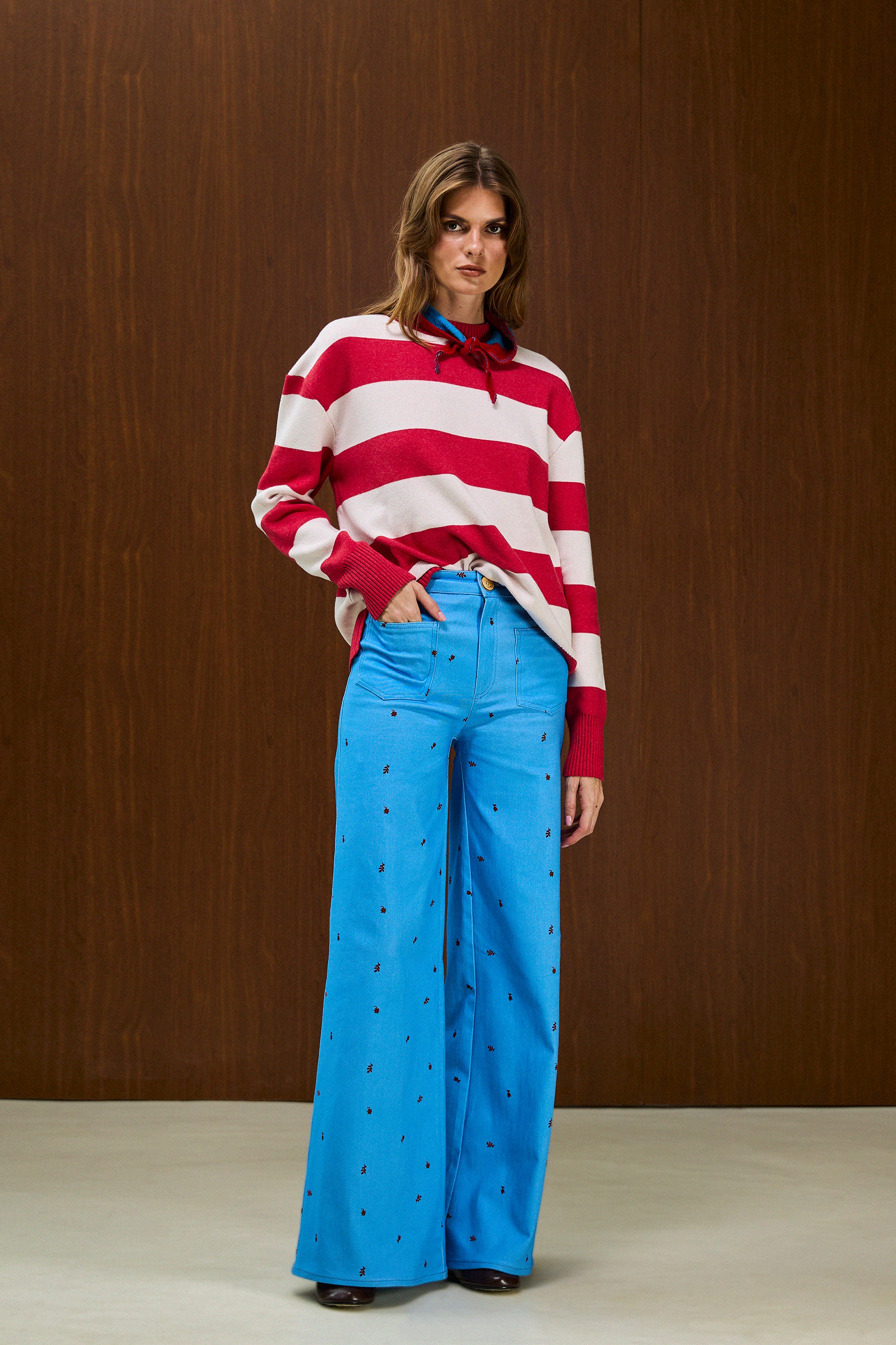 High-waist wide-leg trousers in sky blue with tiny leaf pattern. Designed with front patch pockets, a front wooden button and zip closure. Relaxed, full-length fit with straight cut.