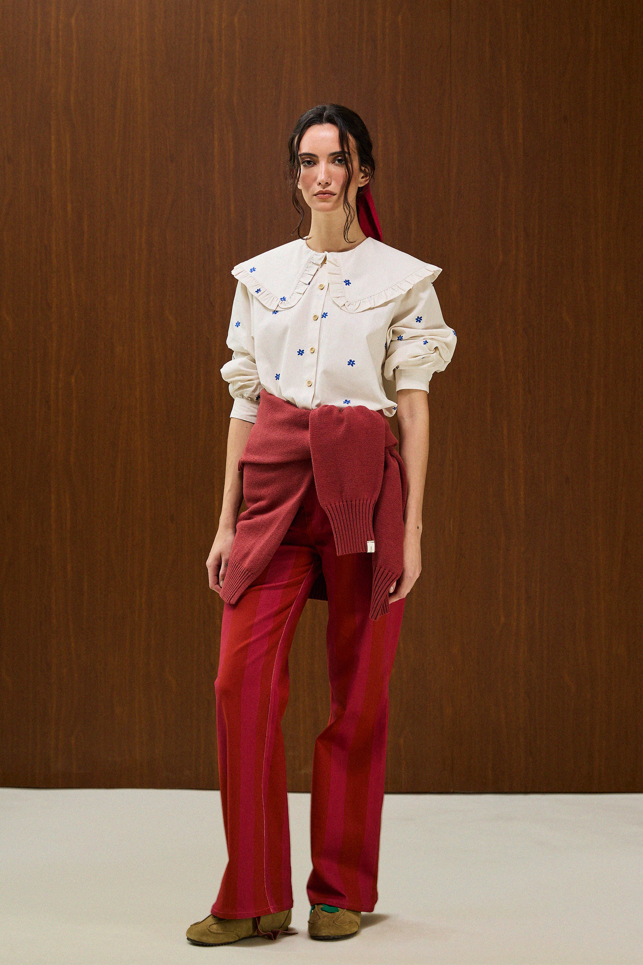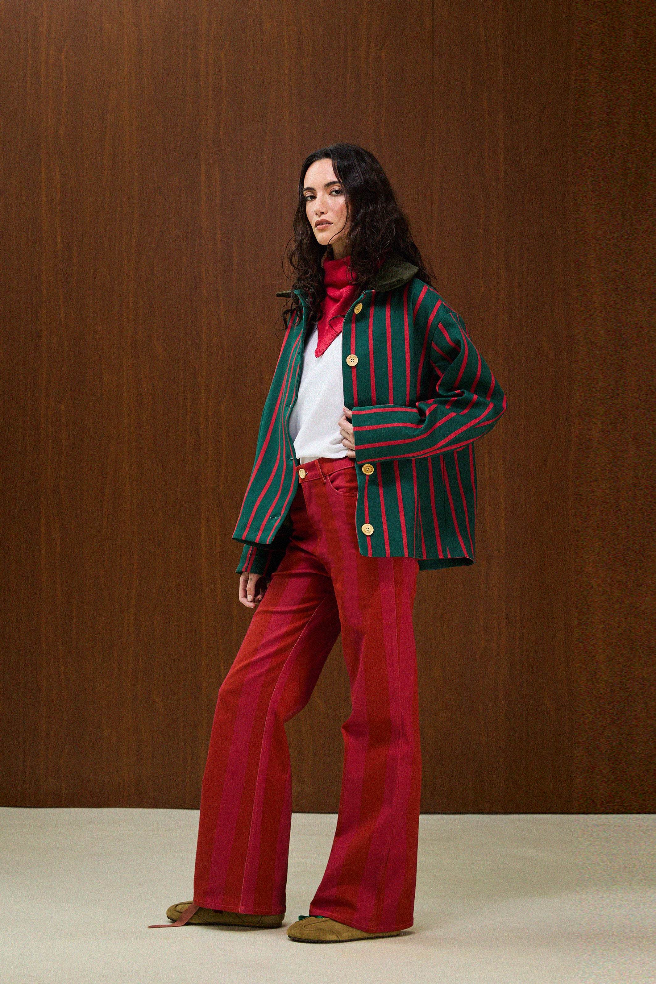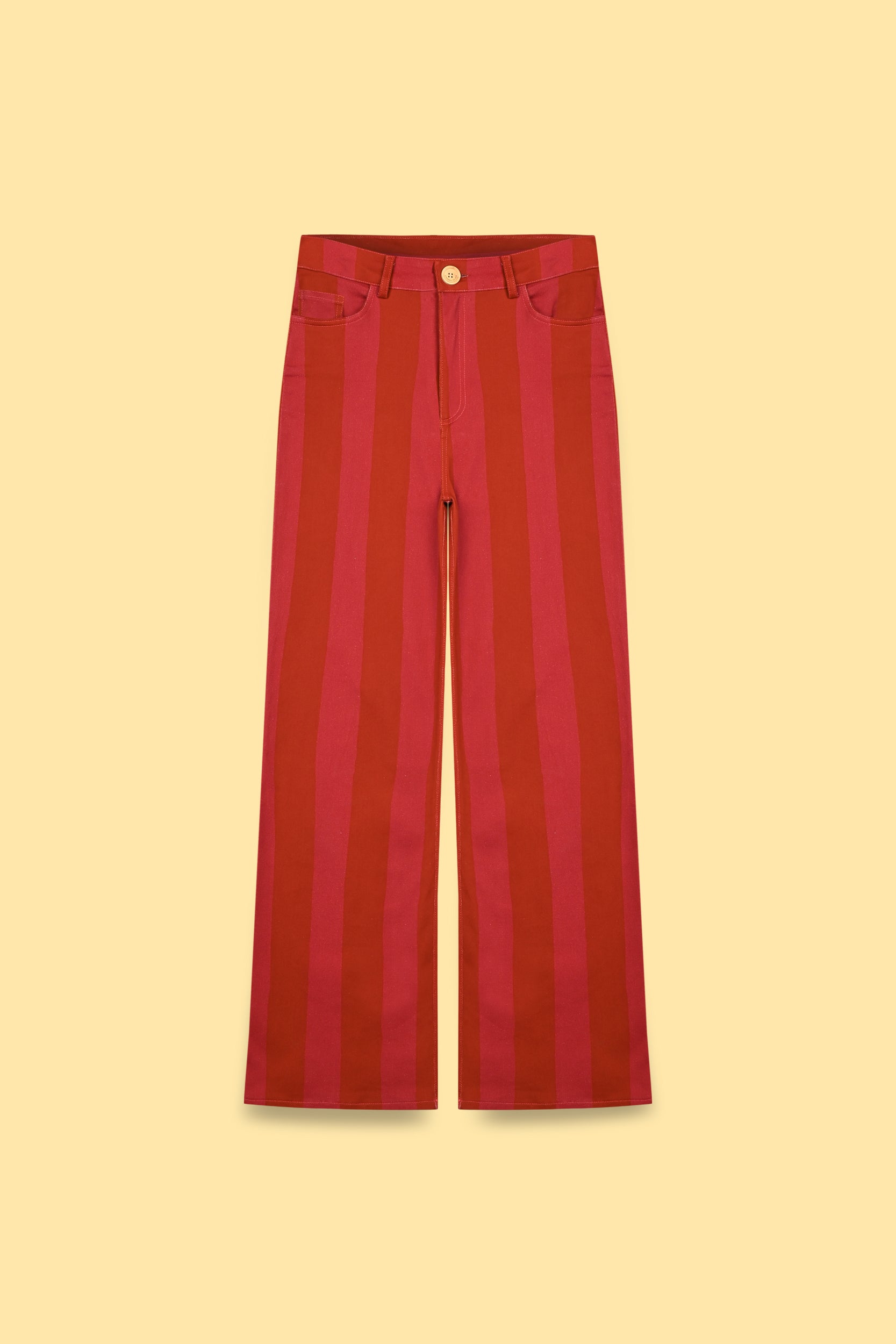 High-waist trousers in bold red and pink vertical stripes. Wide-leg cut with a straight silhouette. Features  a front wooden button and zip closure, and classic five-pocket design.