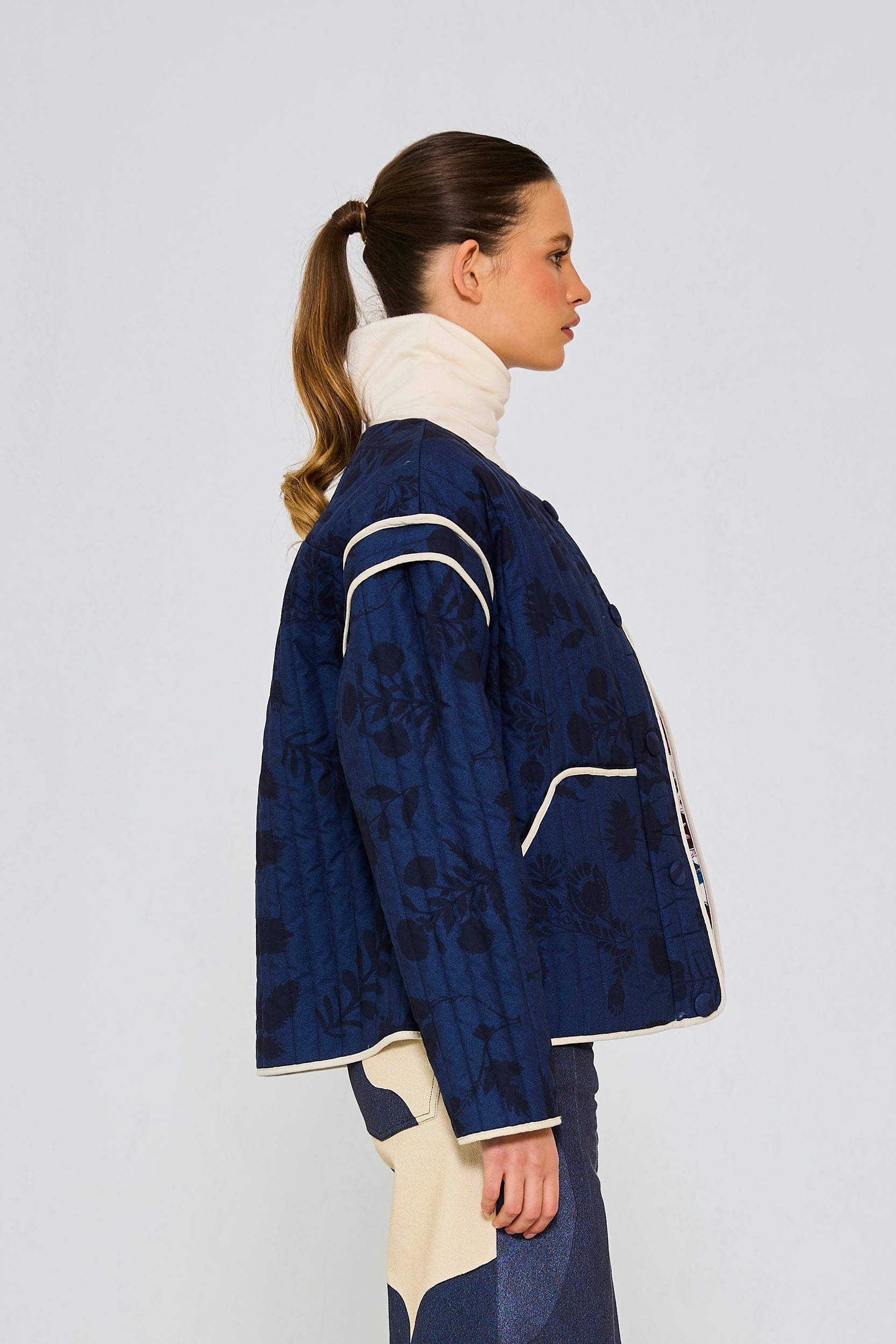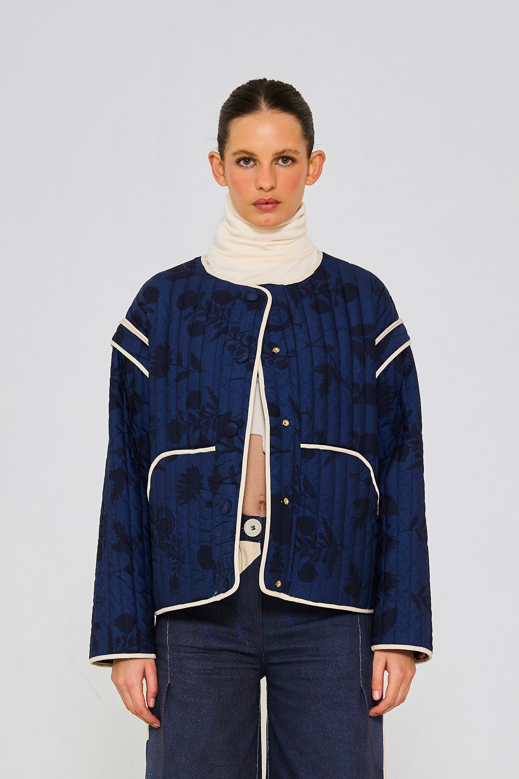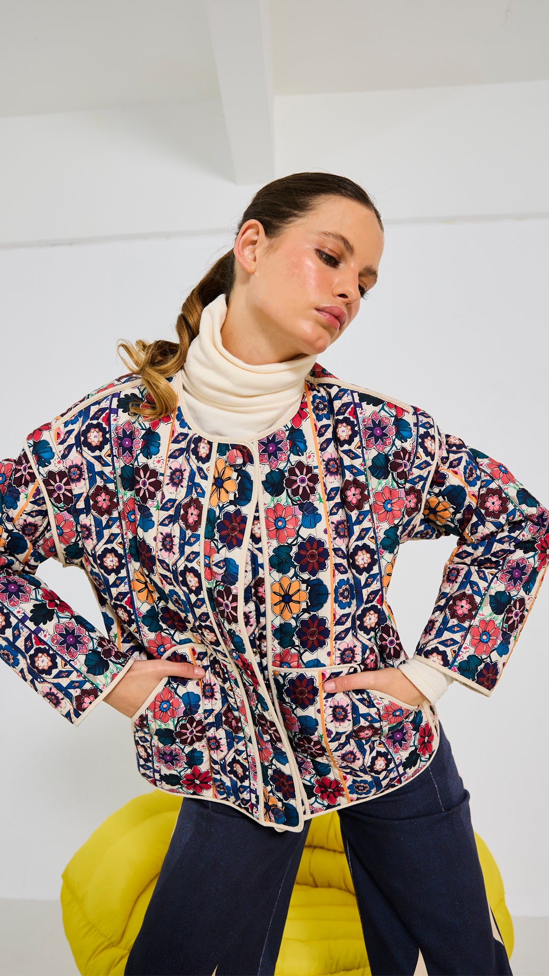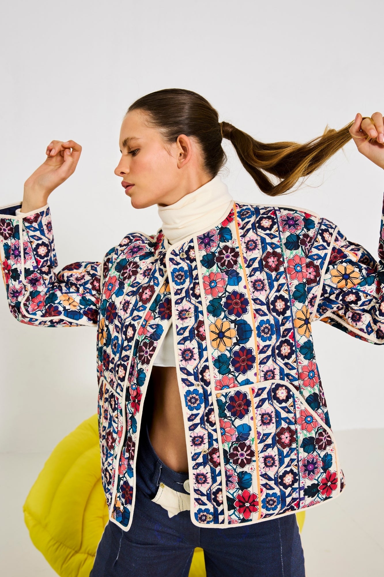 Çift taraflı, kolları fermuarlı, iki tarafı da cep detaylı, su itici kumaş özellikli, biye detaylı puffer ceket. Modelin üzerindeki 1 bedendir.