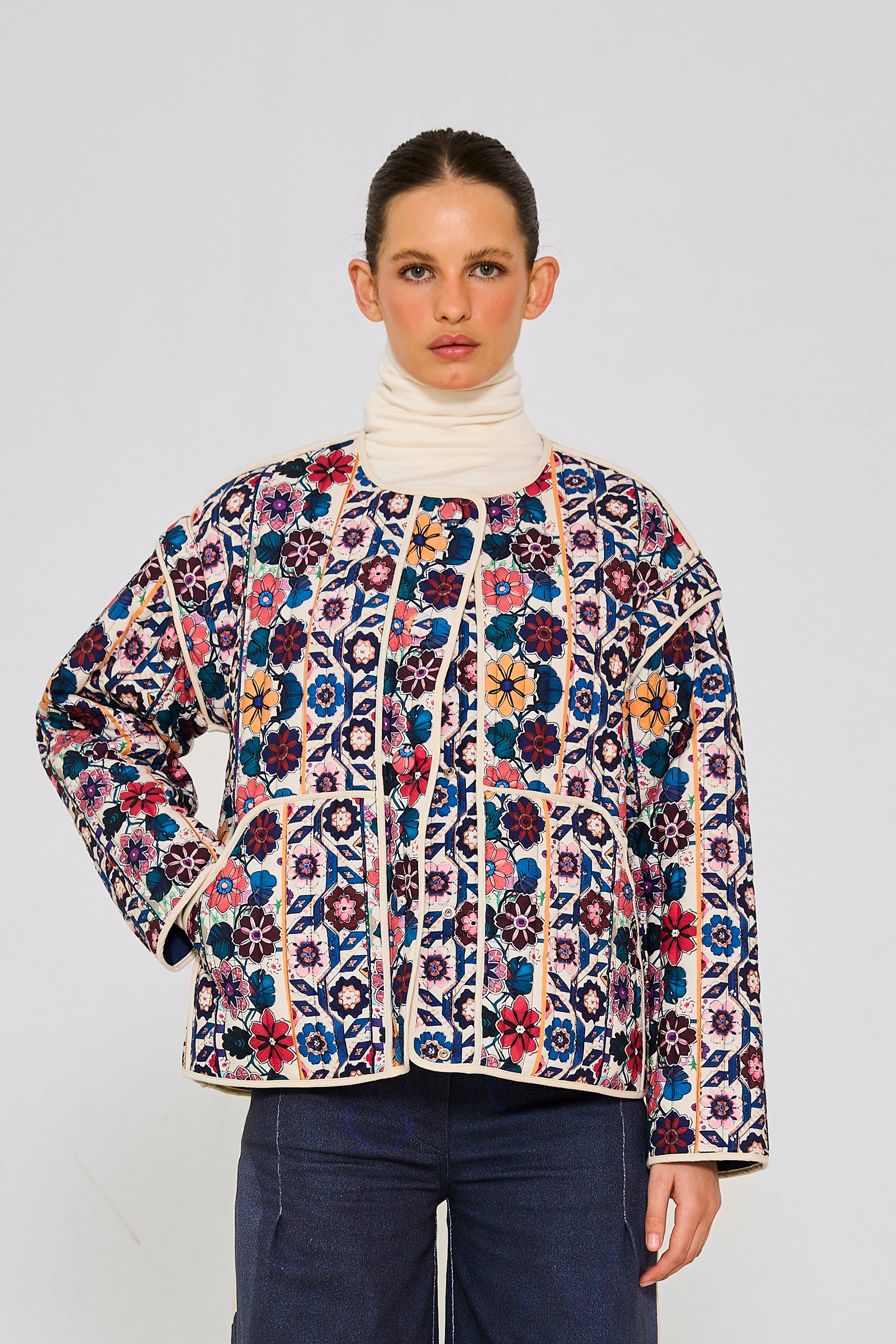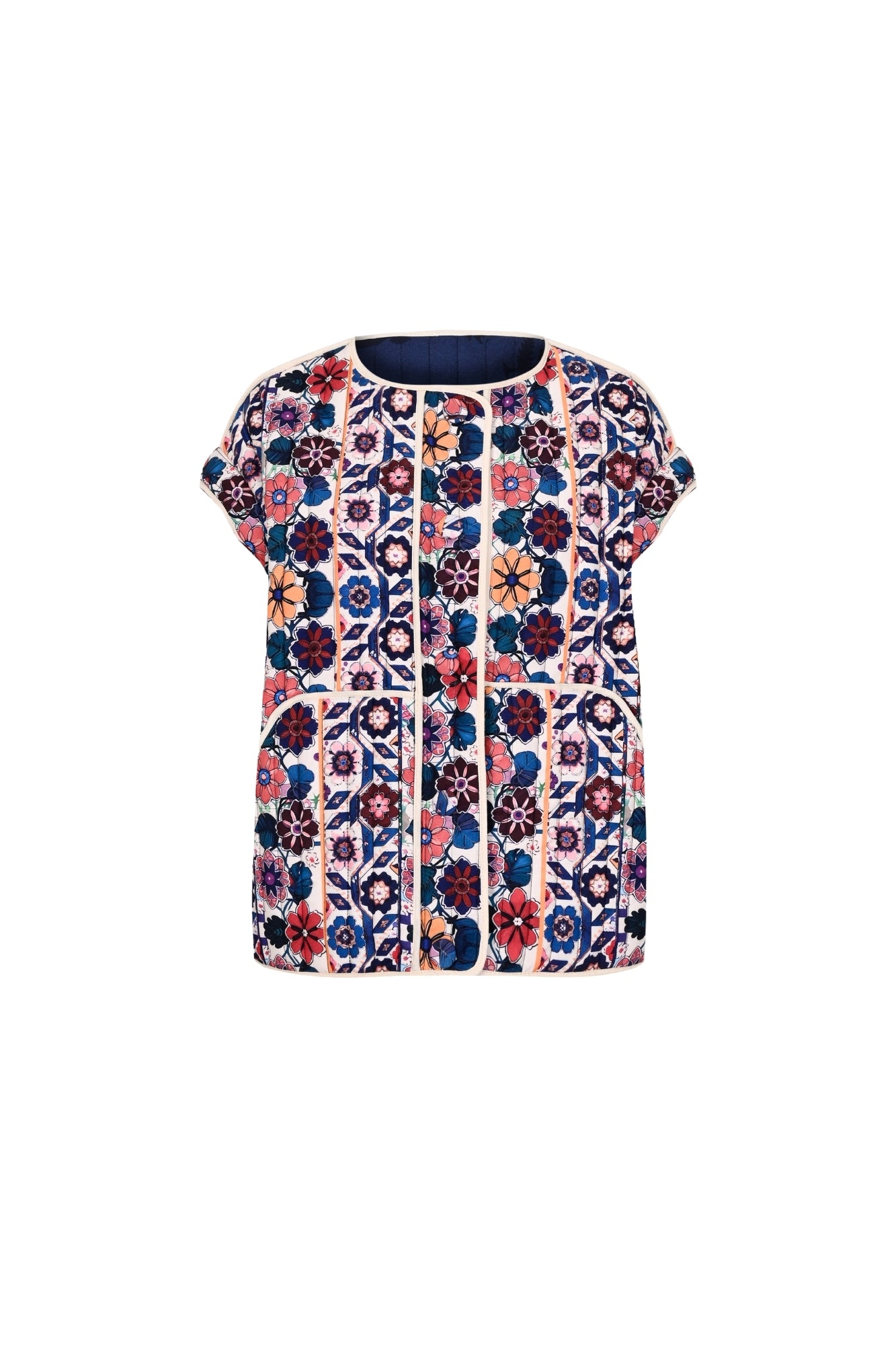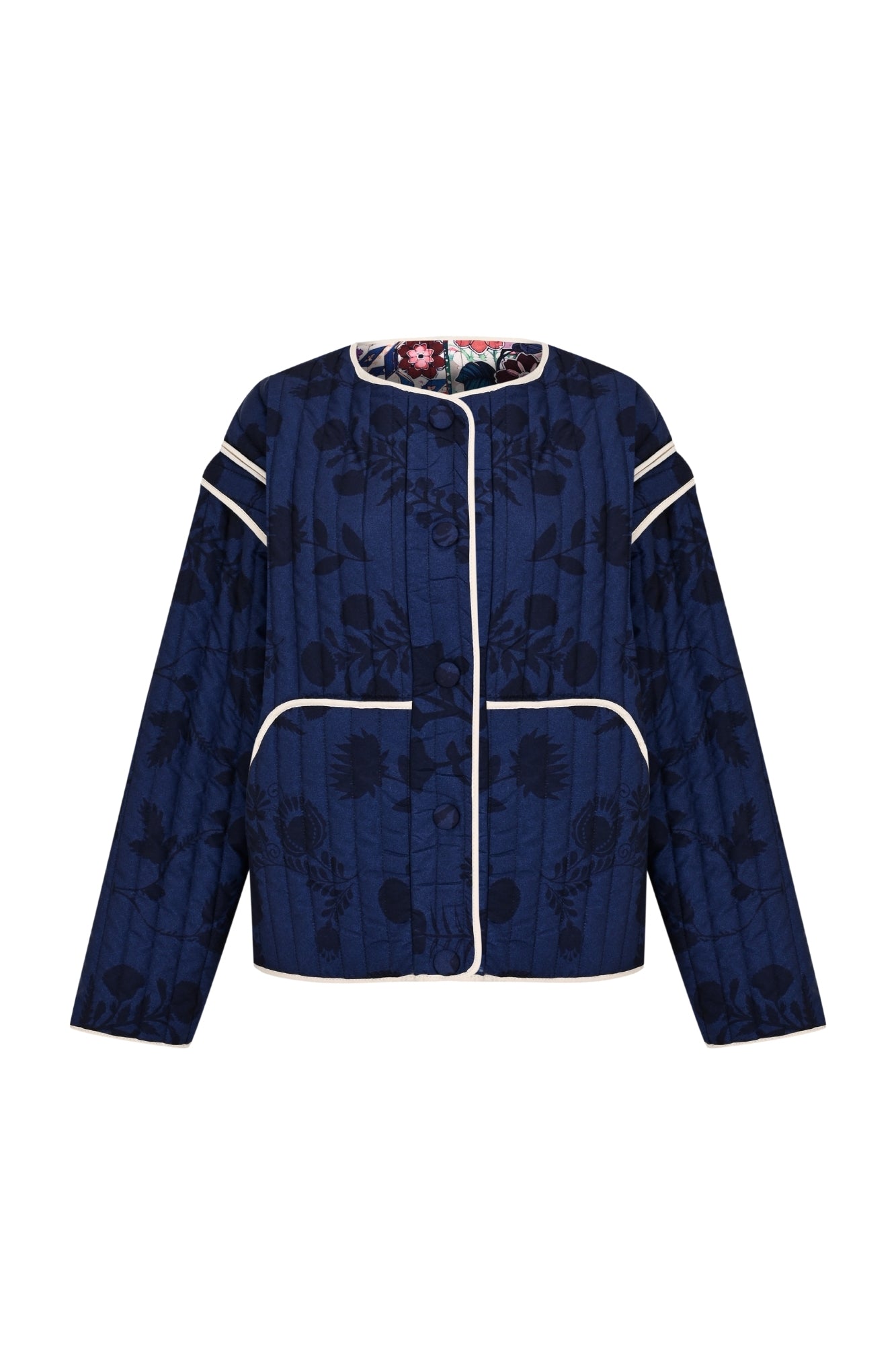 Çift taraflı, kolları fermuarlı, iki tarafı da cep detaylı, su itici kumaş özellikli, biye detaylı puffer ceket. Modelin üzerindeki 1 bedendir.