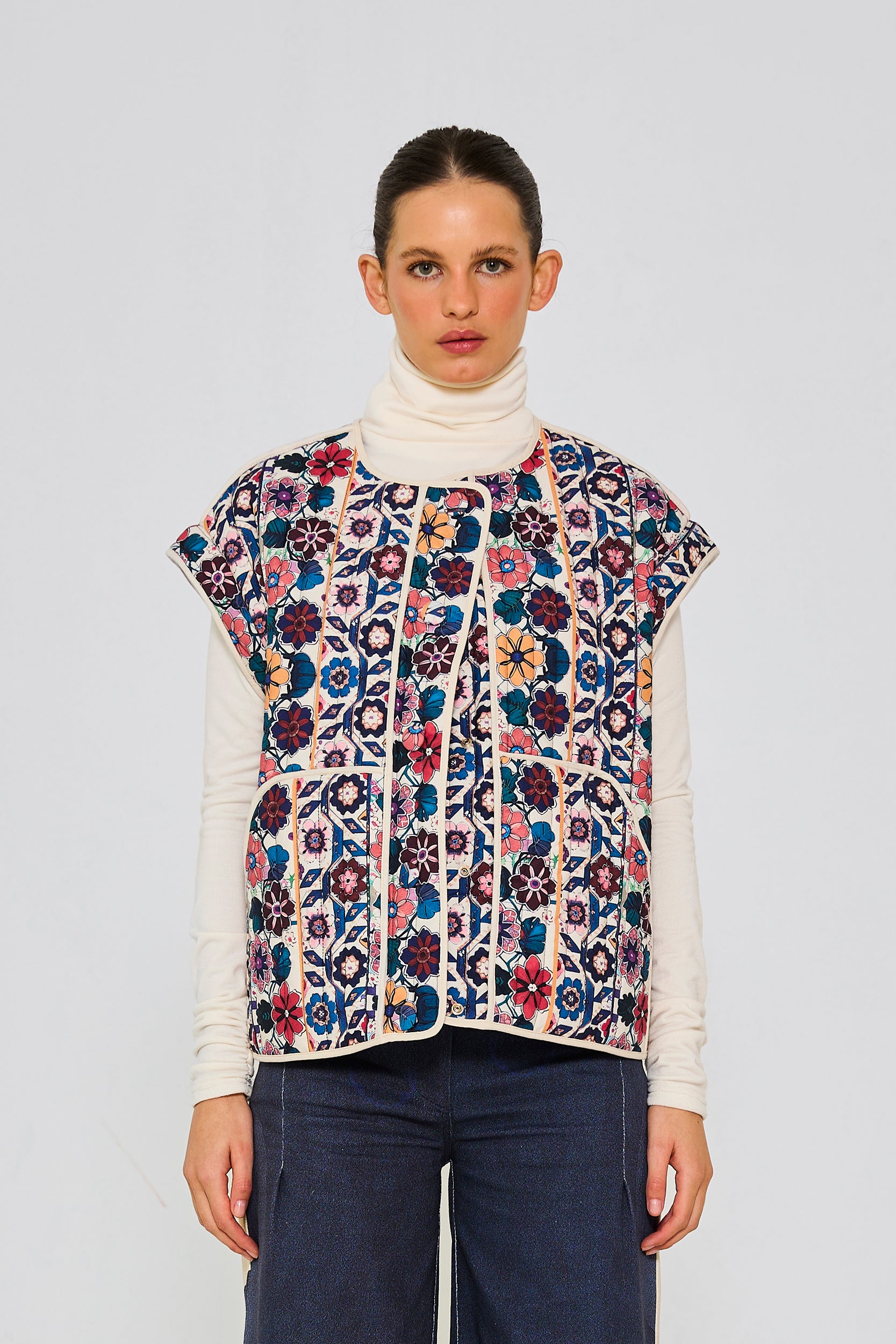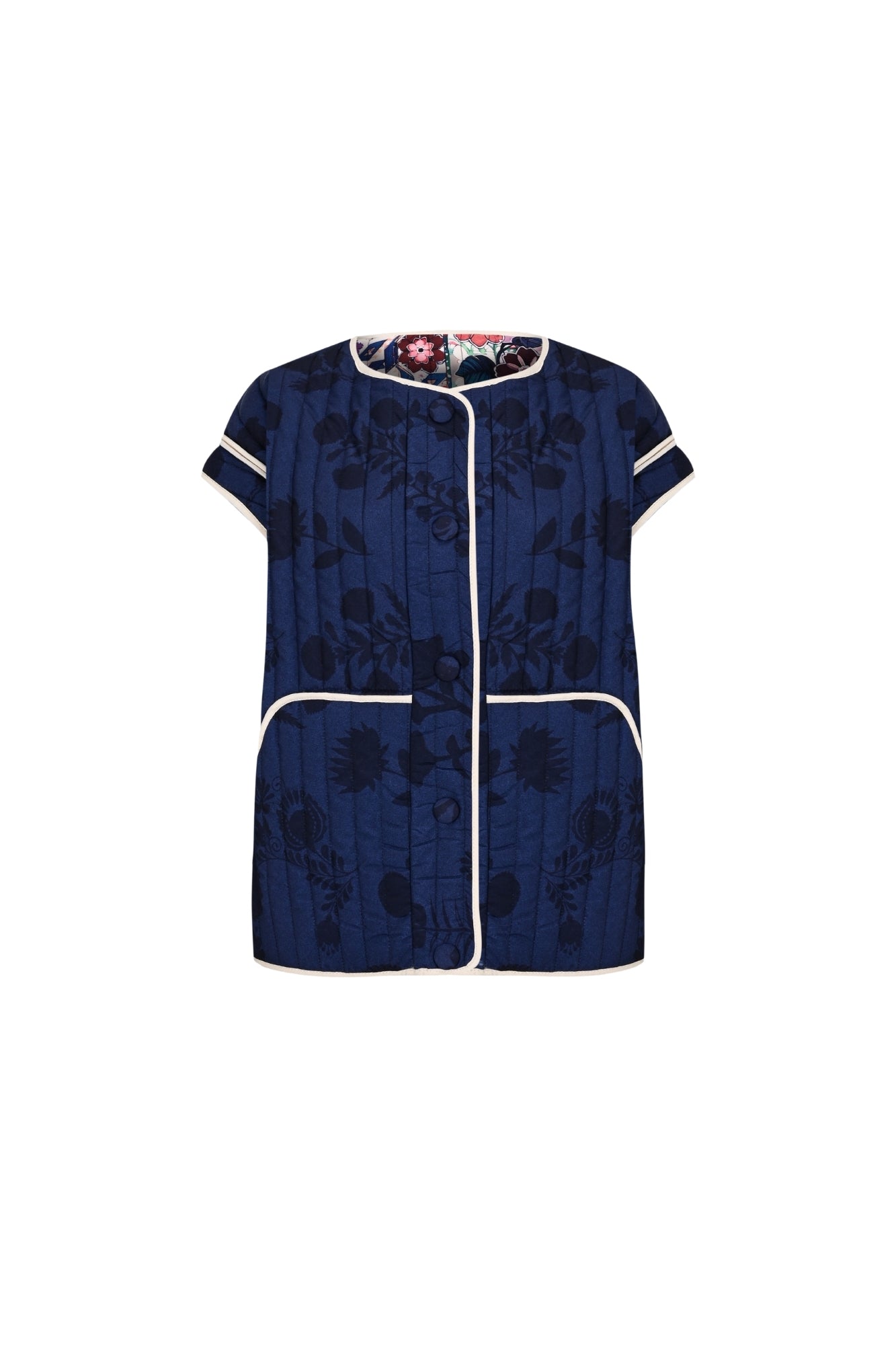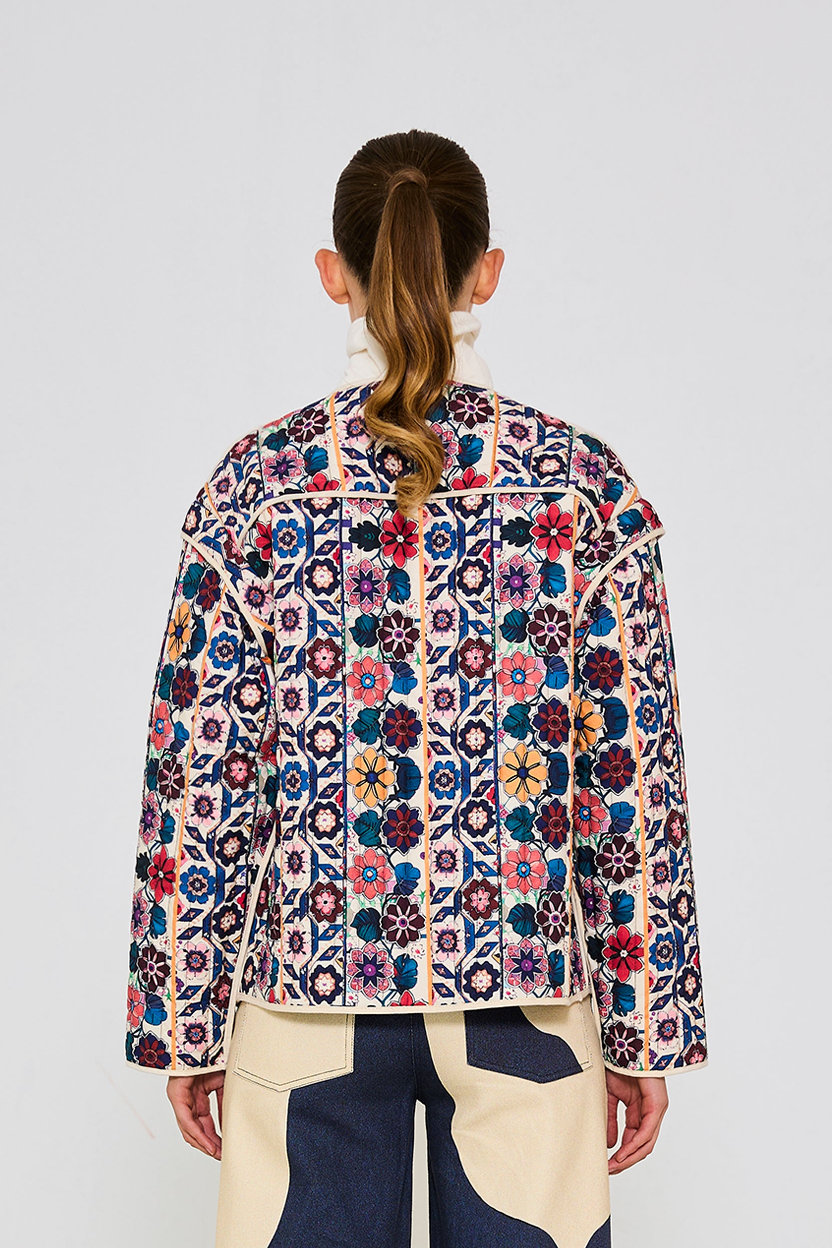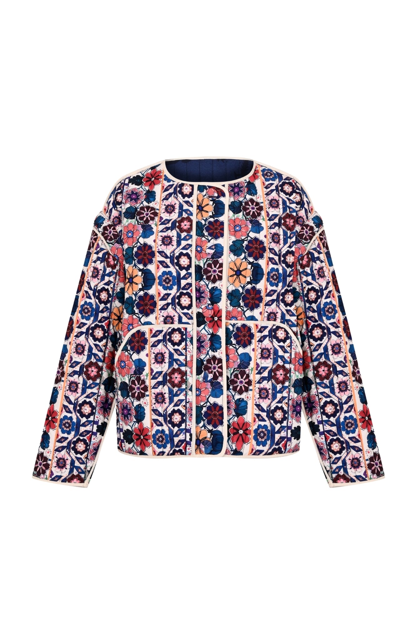 Çift taraflı, kolları fermuarlı, iki tarafı da cep detaylı, su itici kumaş özellikli, biye detaylı puffer ceket. Modelin üzerindeki 1 bedendir.