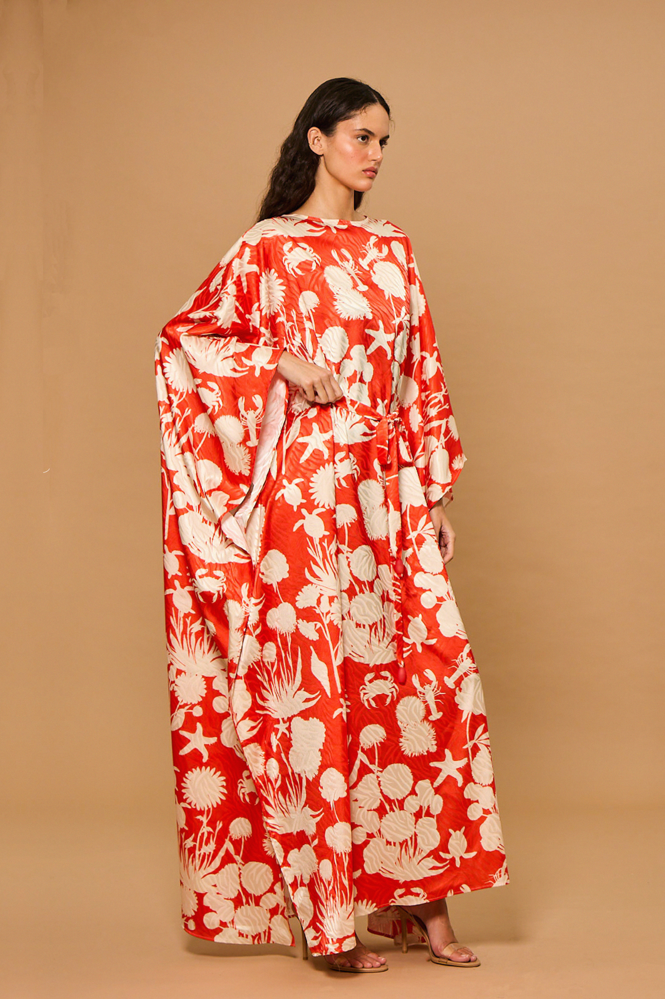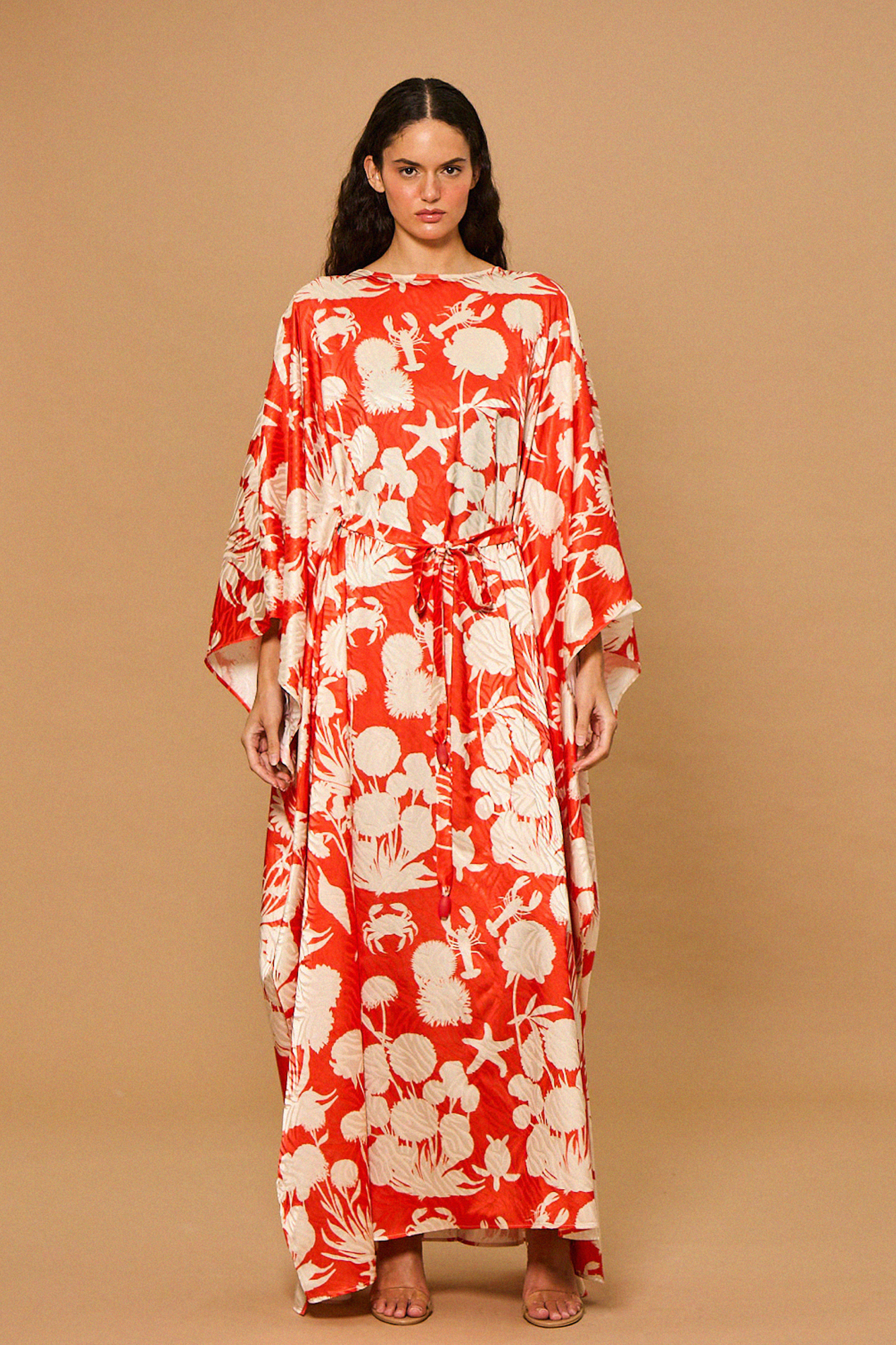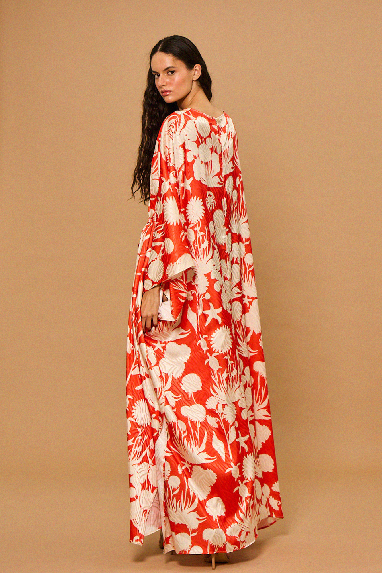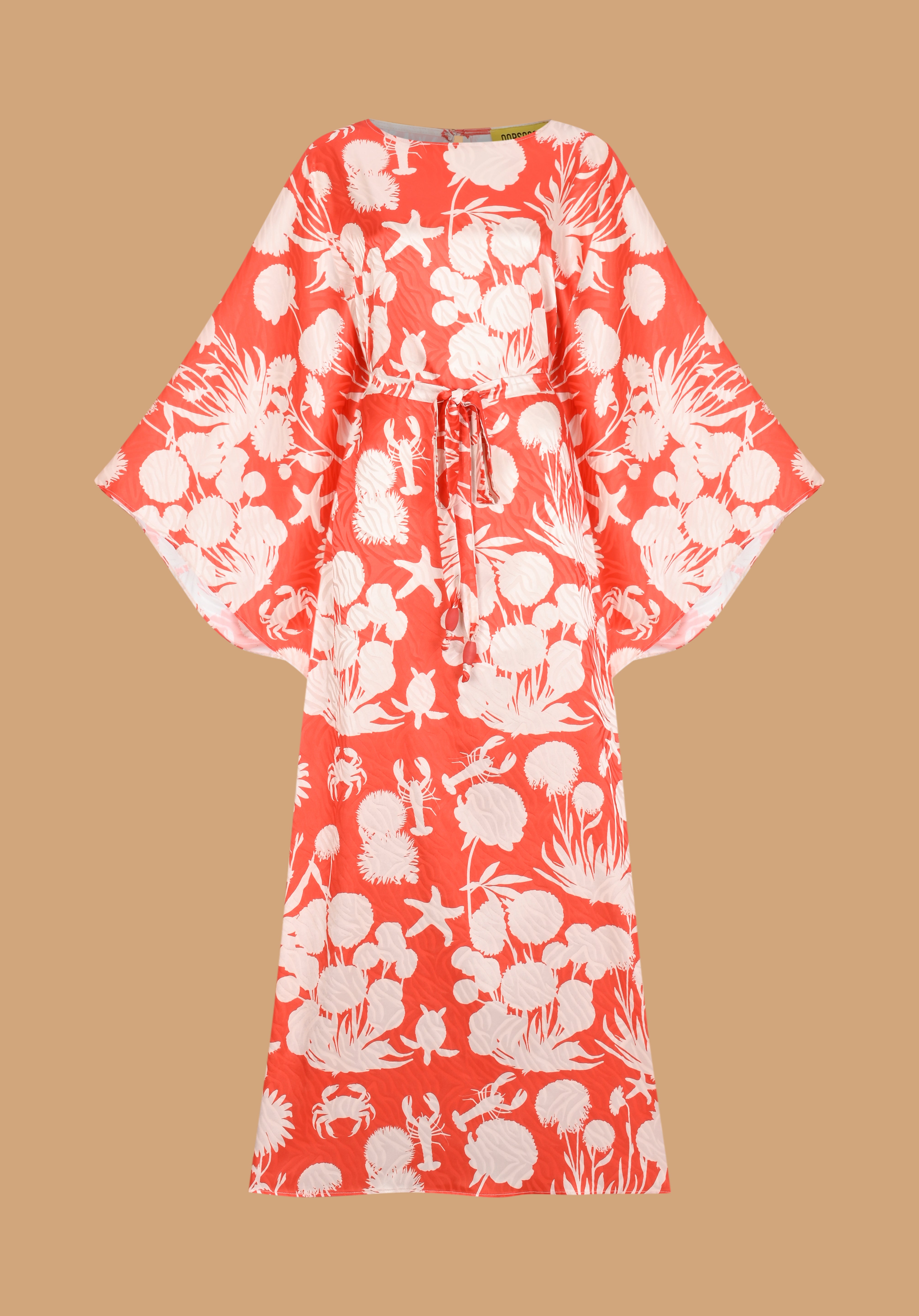 100% PES. Wide-cut, belted, straight-neck, long kaftan dress. The model is wearing a size STD.