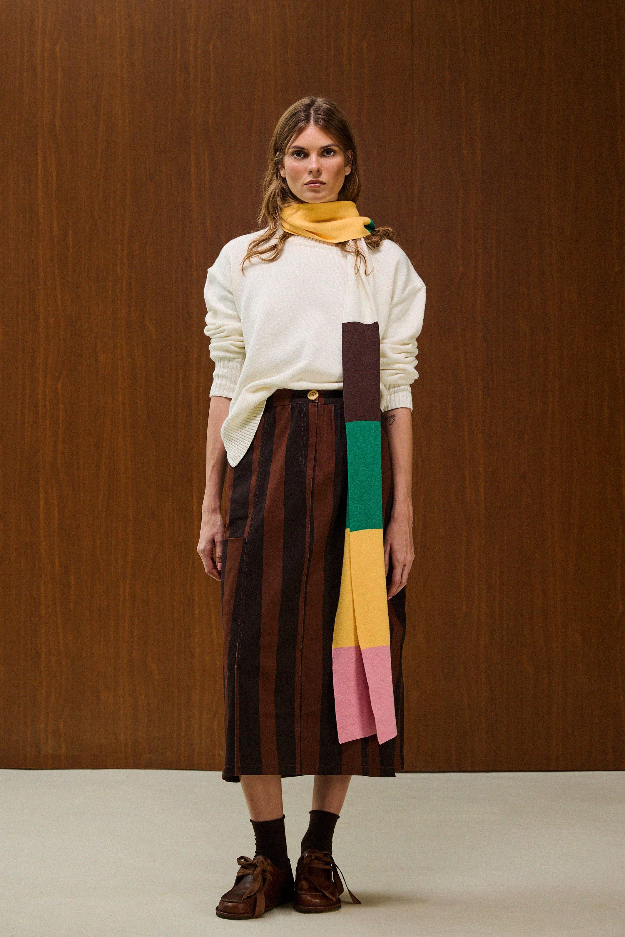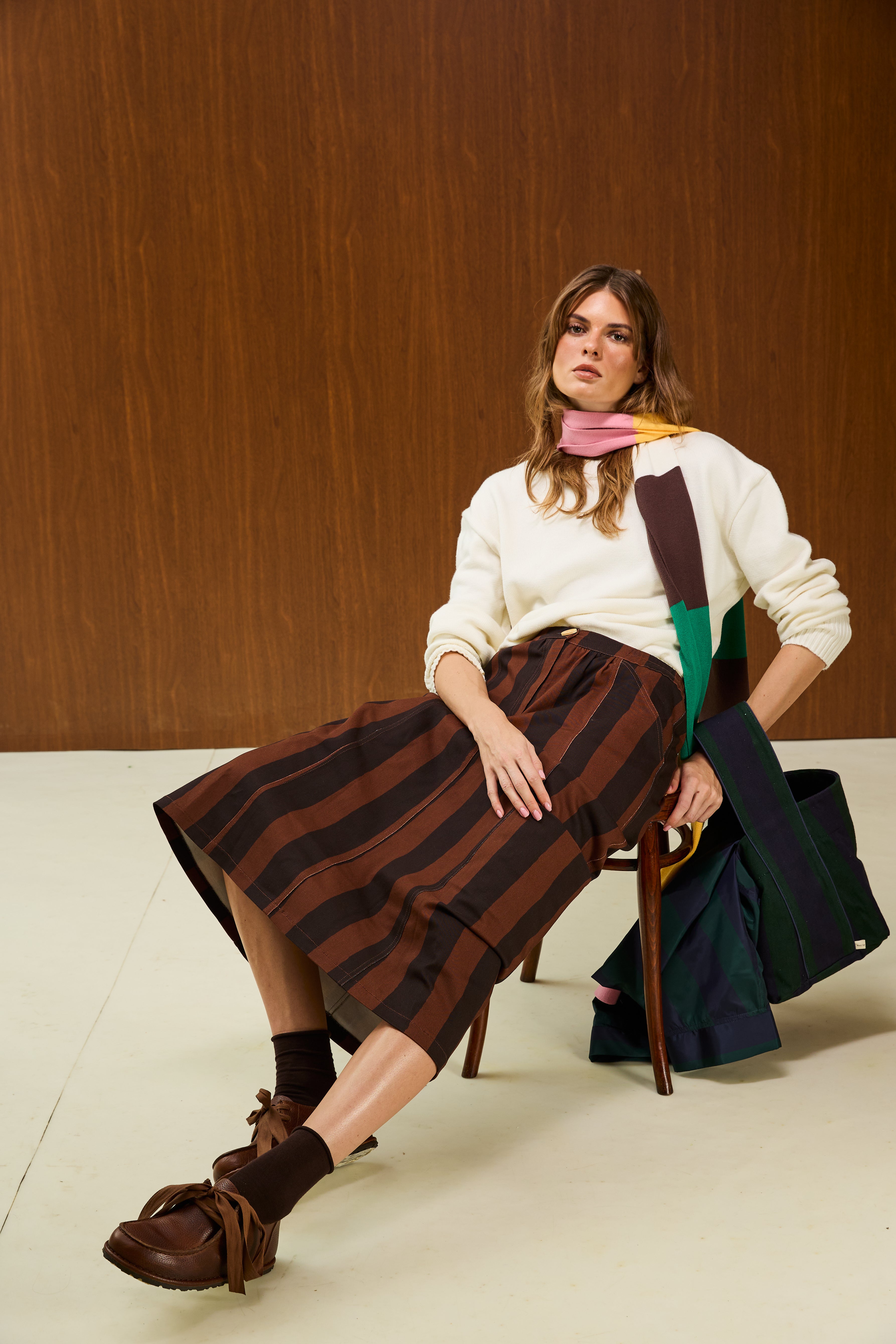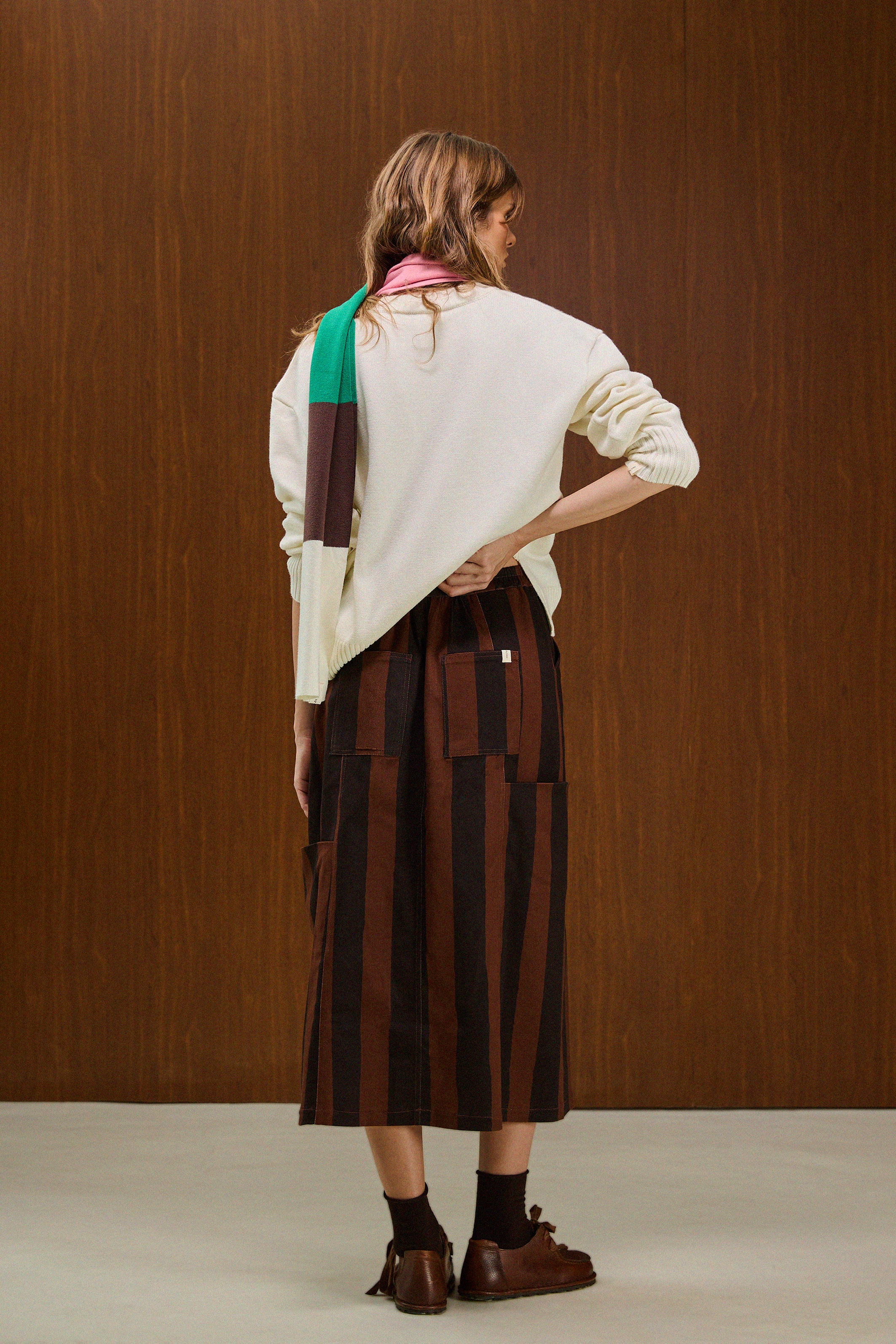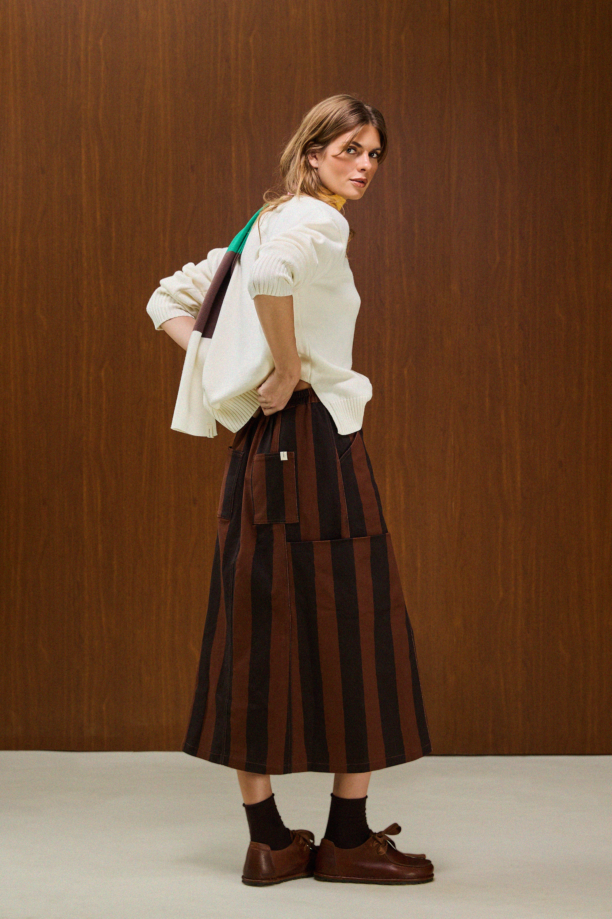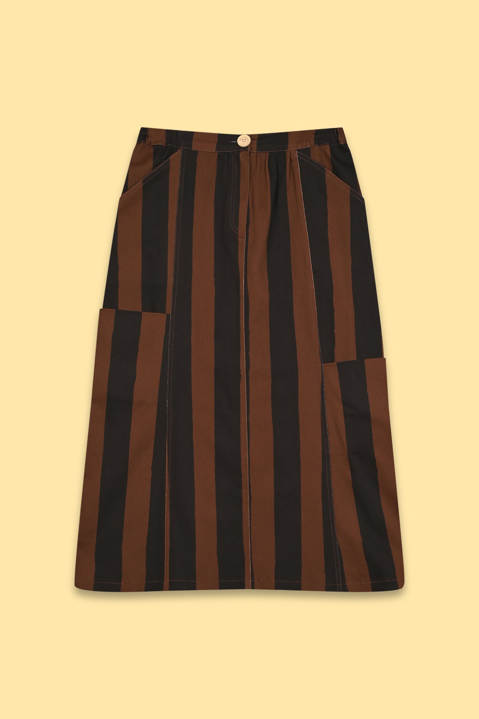 Cotton midi skirt with vertical stripes in brown and dark brown. Features a front button and zip closure, side pockets, and patch pockets on both sides.