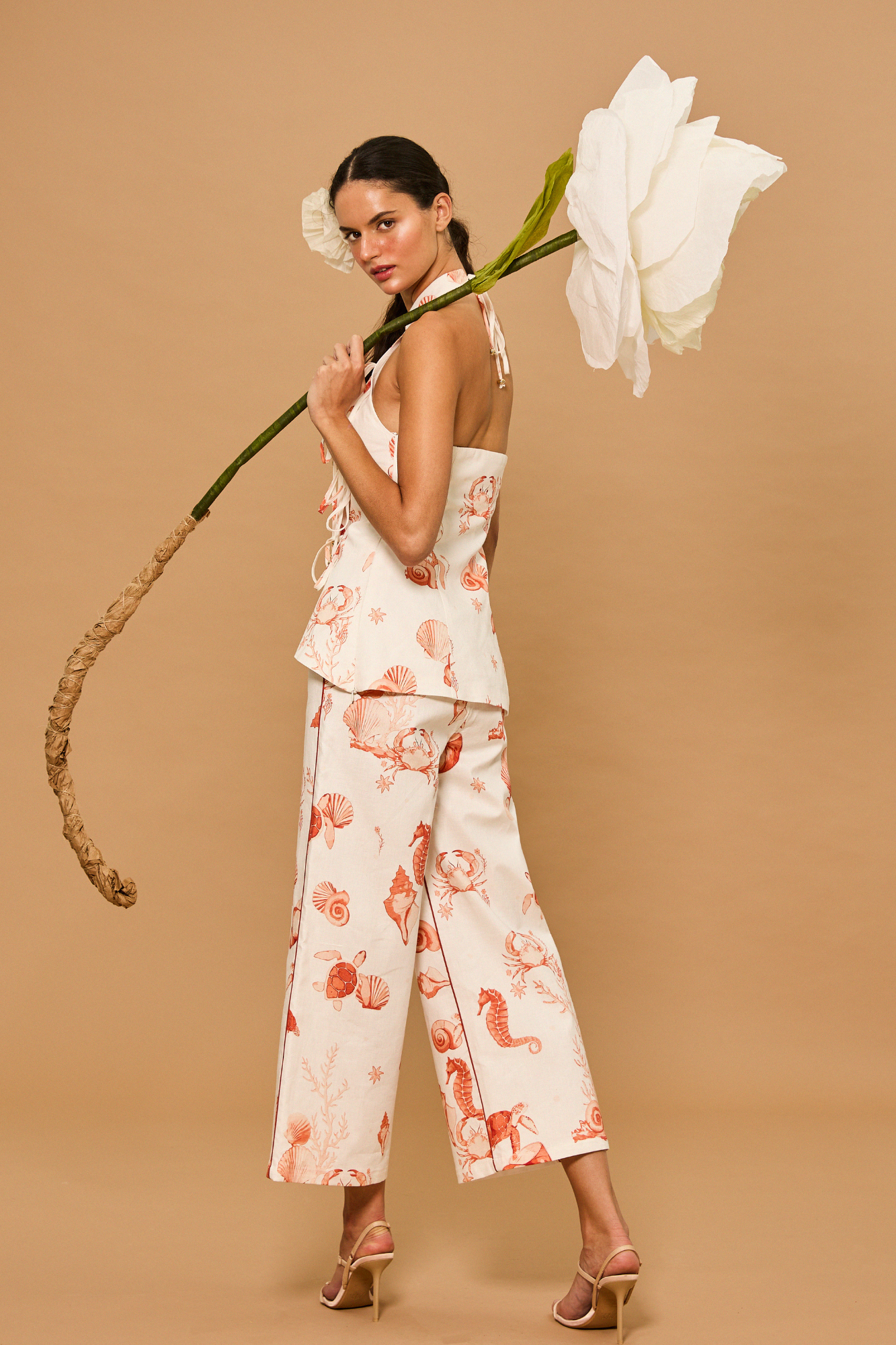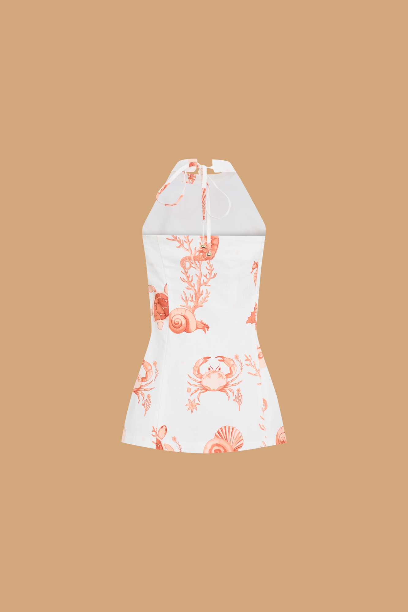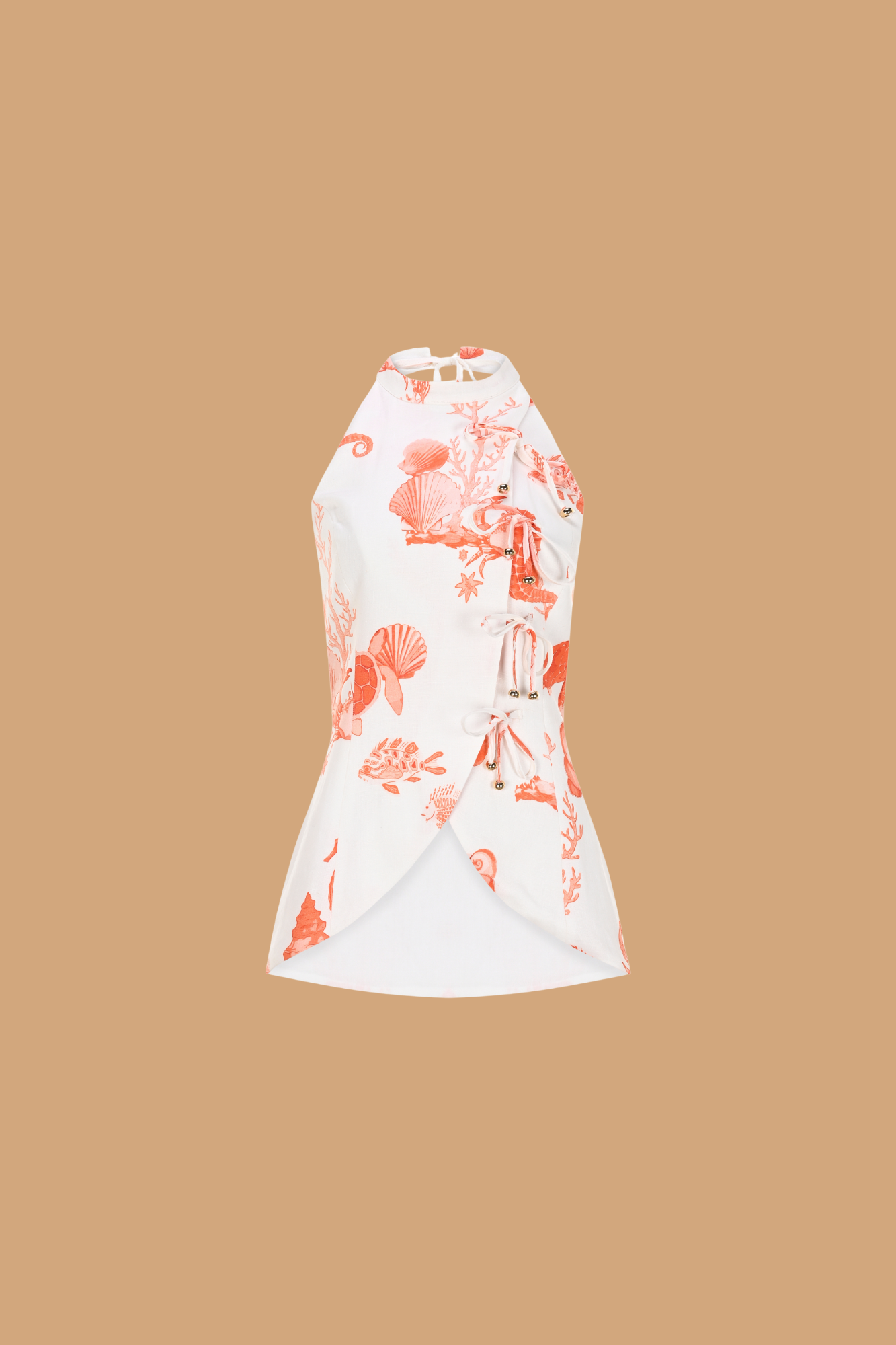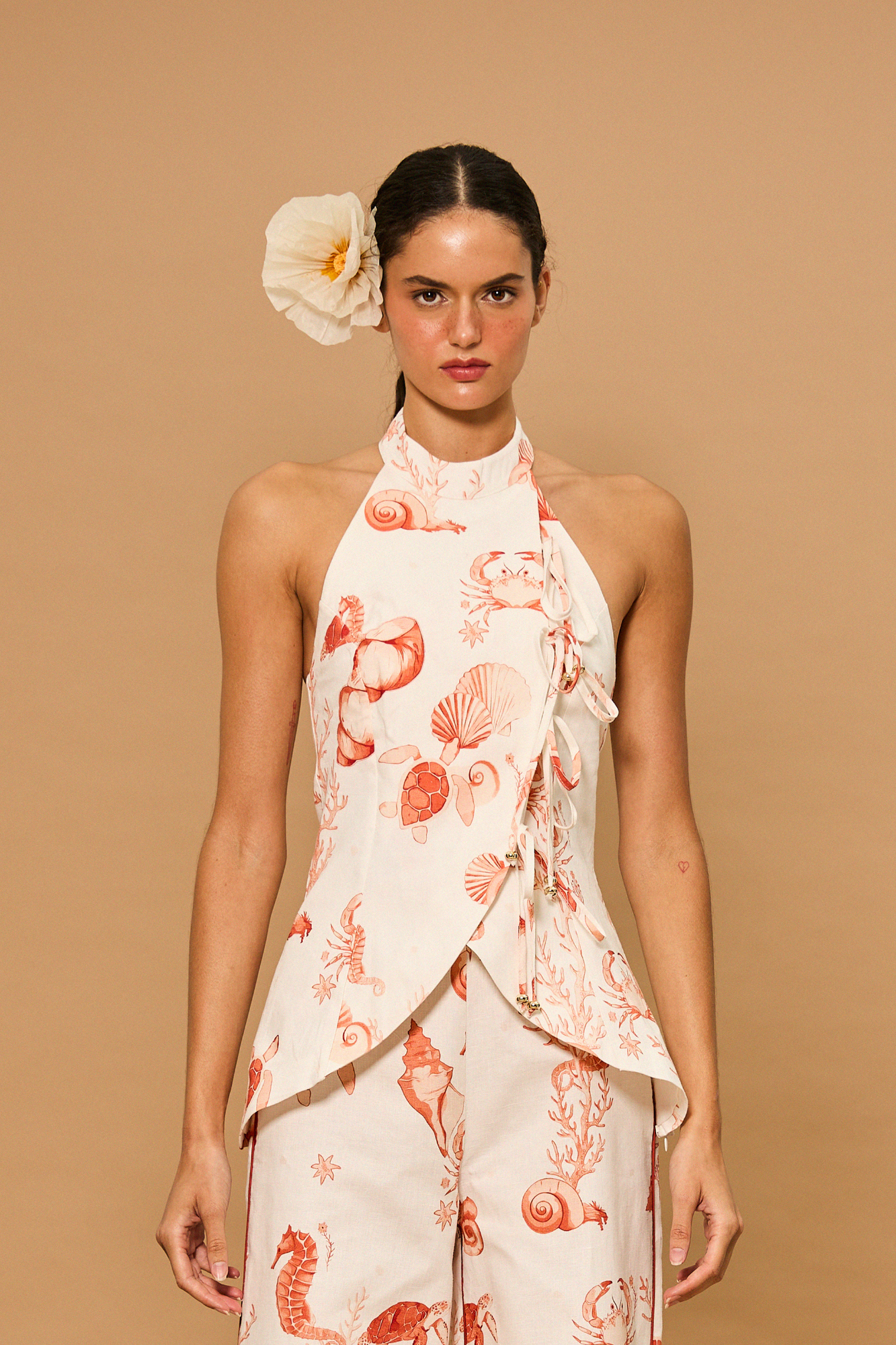100% linen. Stand-up collar, tie at the back, adjustable with drawstrings on the sides, sleeveless top with asymmetrical hem and crossover front. The model is wearing size XS.