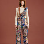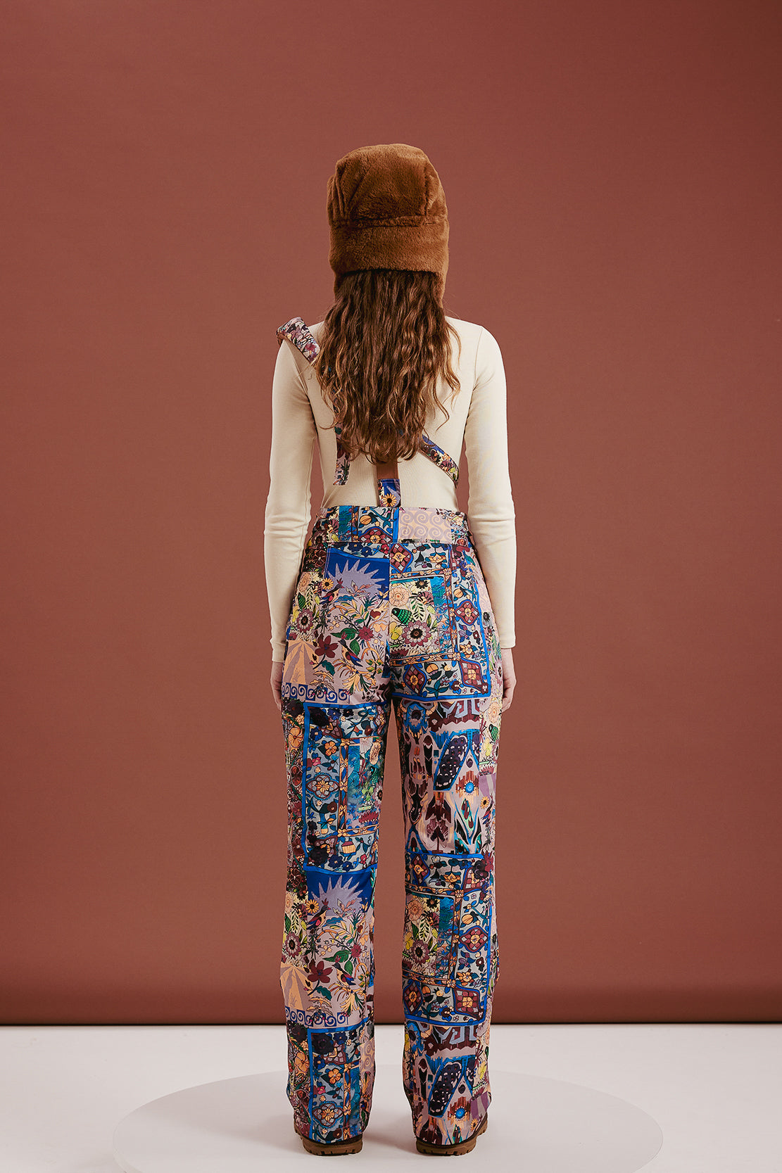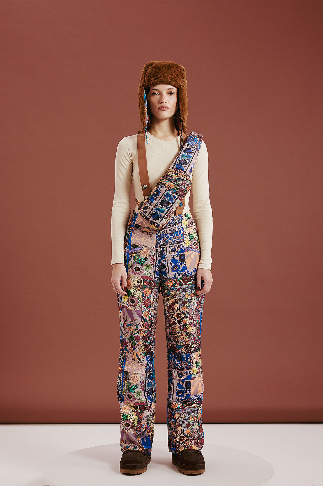 High-waisted ski pants with adjustable waist and hem, featuring suspenders and crafted from windproof, water-repellent fabric.