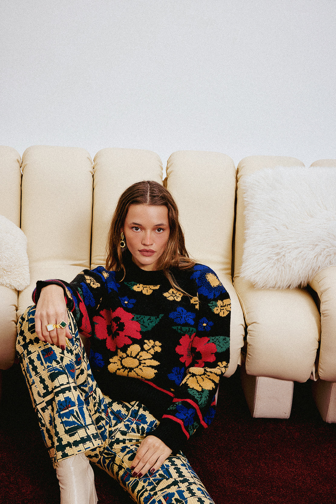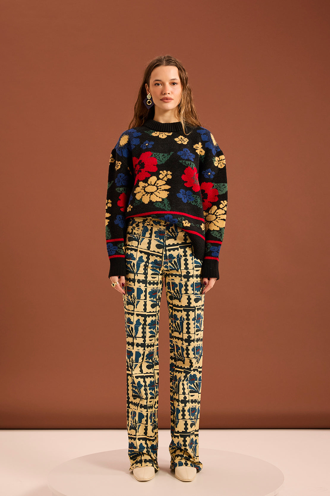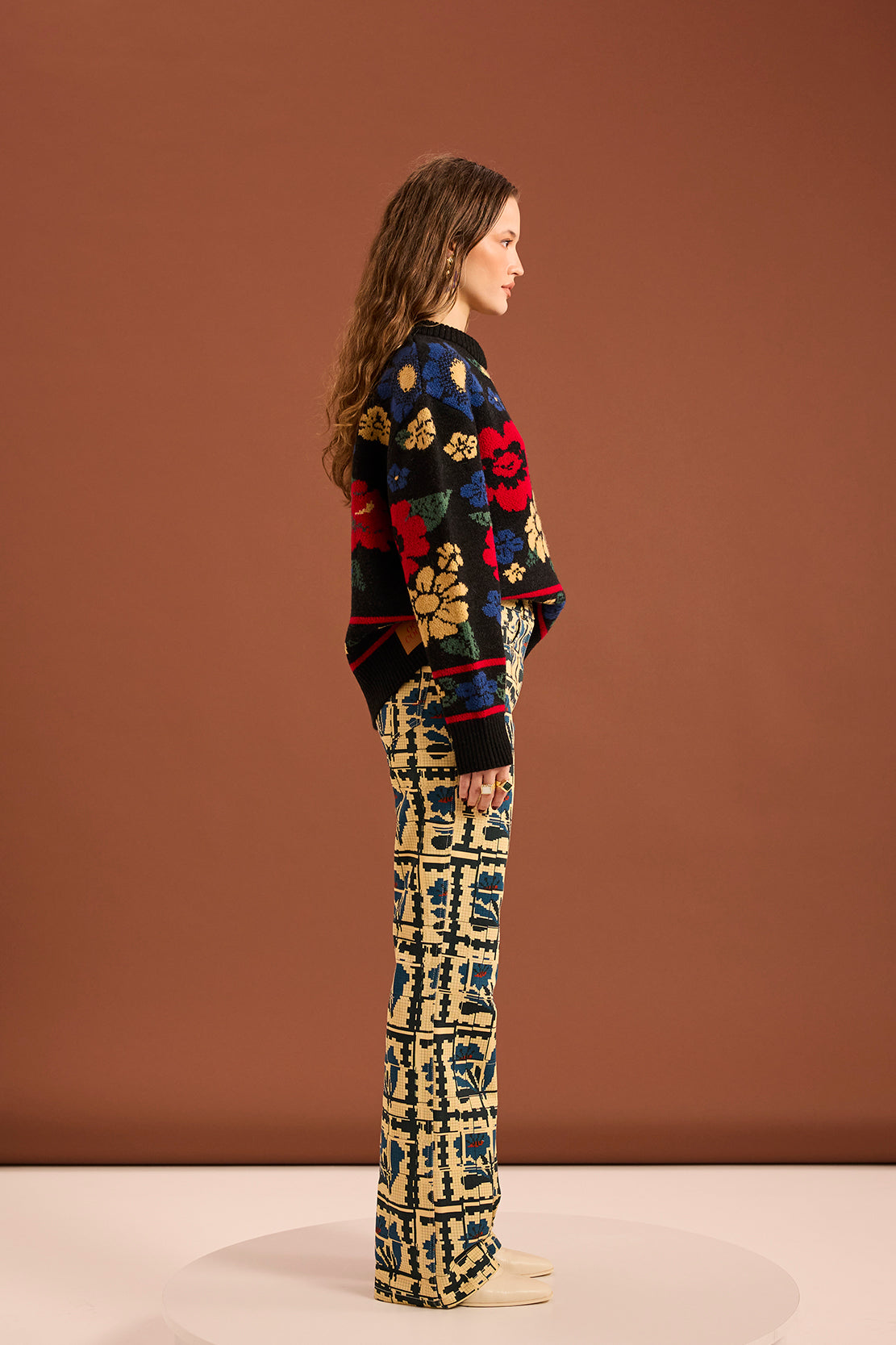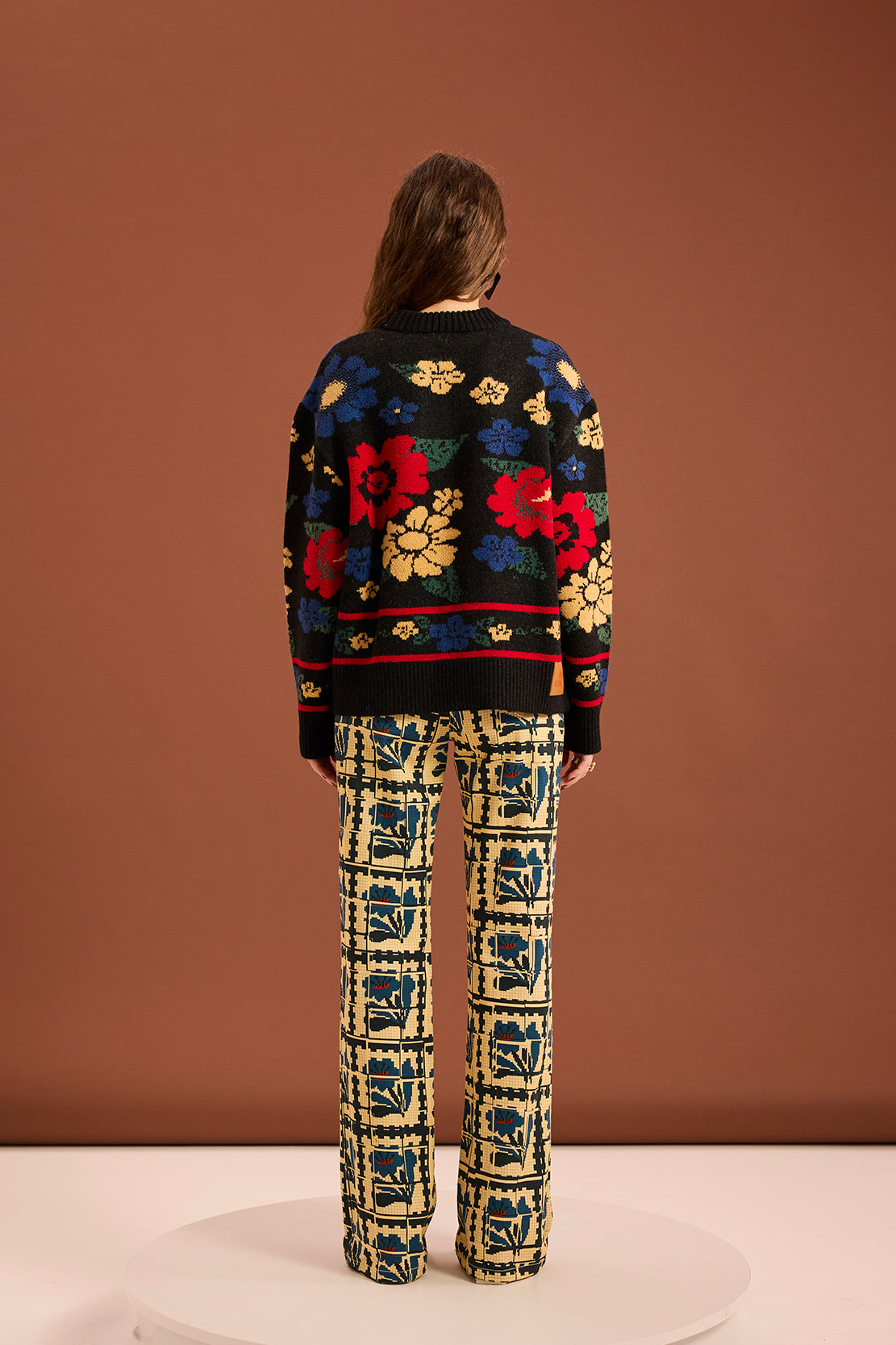 A knit sweater featuring an all-over multicolor floral jacquard pattern. Designed with a relaxed fit and finished with ribbed cuffs, hem and neckline for added comfort and durability.