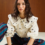Shırt wıth a wıde, ruffled collar, button-down front, and cuffs.