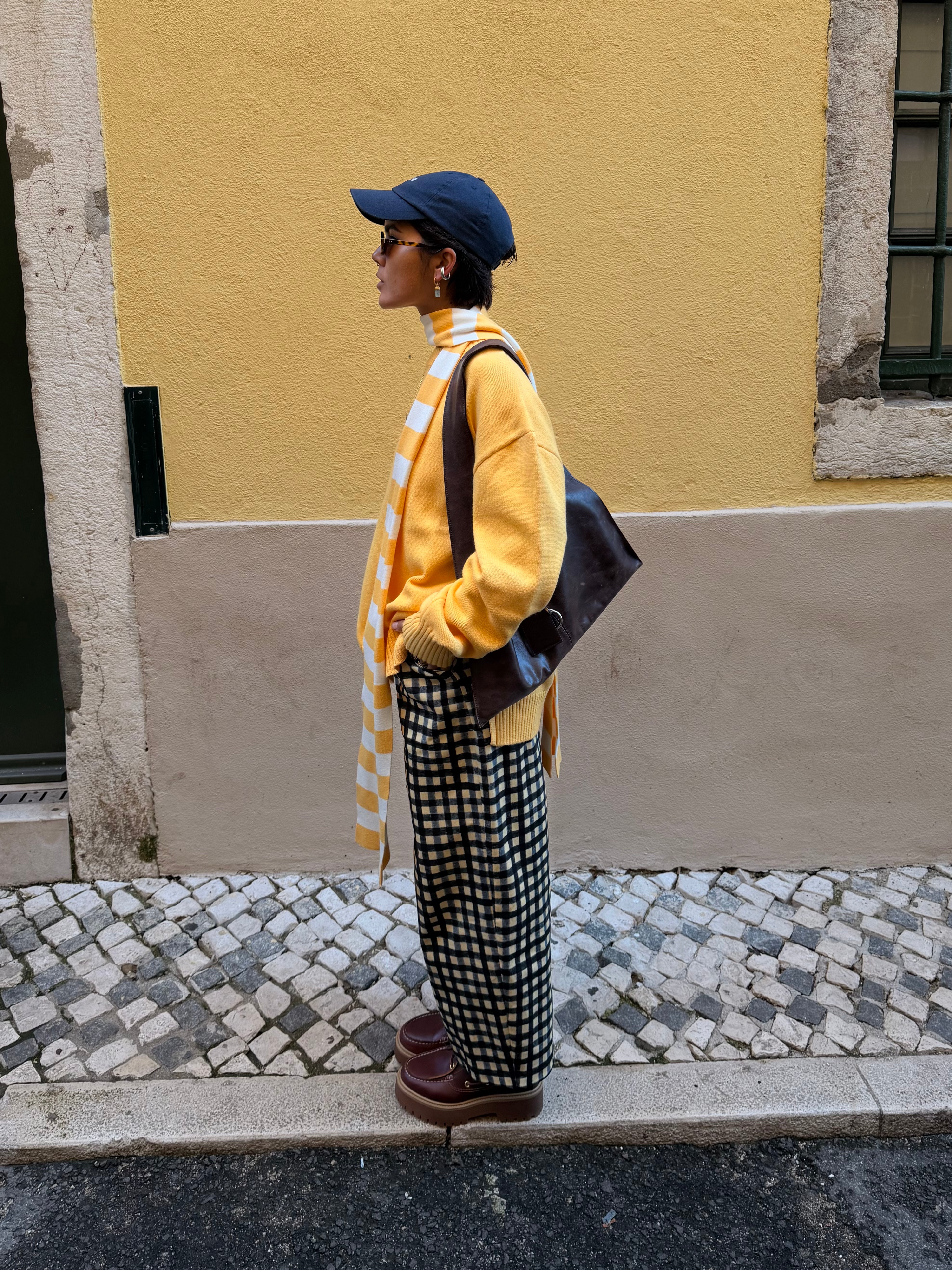 Francisca Bavio styled our favourite yellow knit with our incredibly comfortable trousers and one of this season’s favourite scarves.