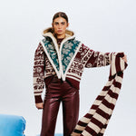 A striped knit  scarf featuring a flexible, close-fit structure designed for insulation and cold-weather protection.