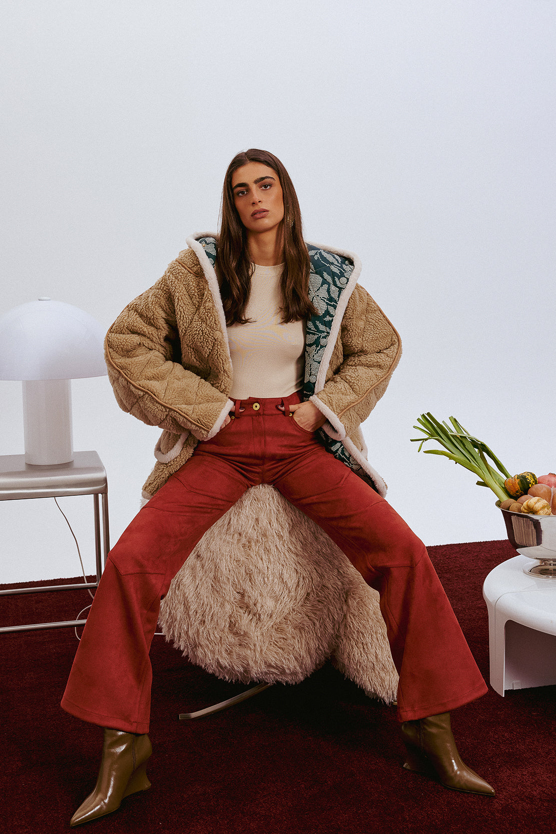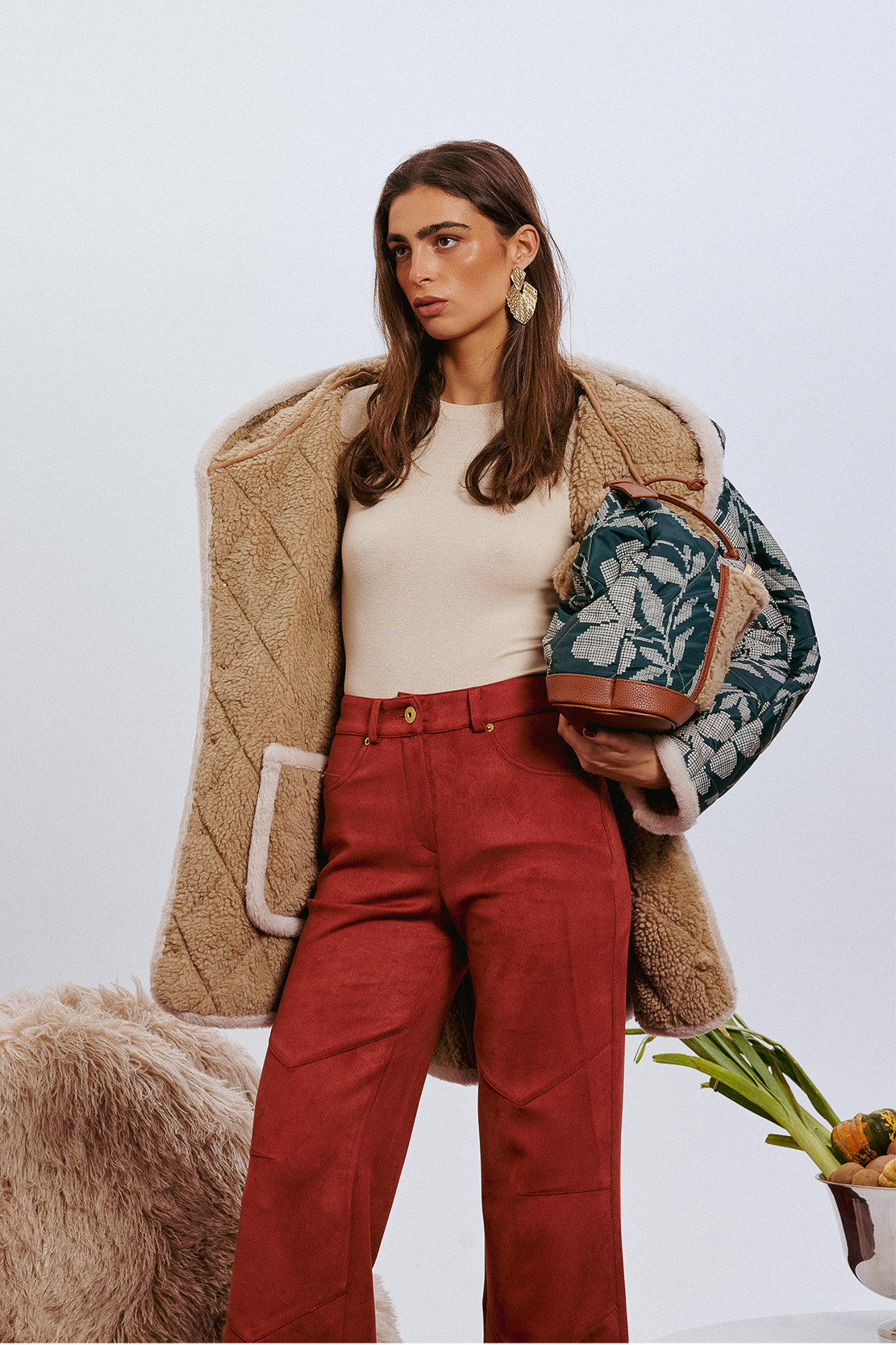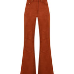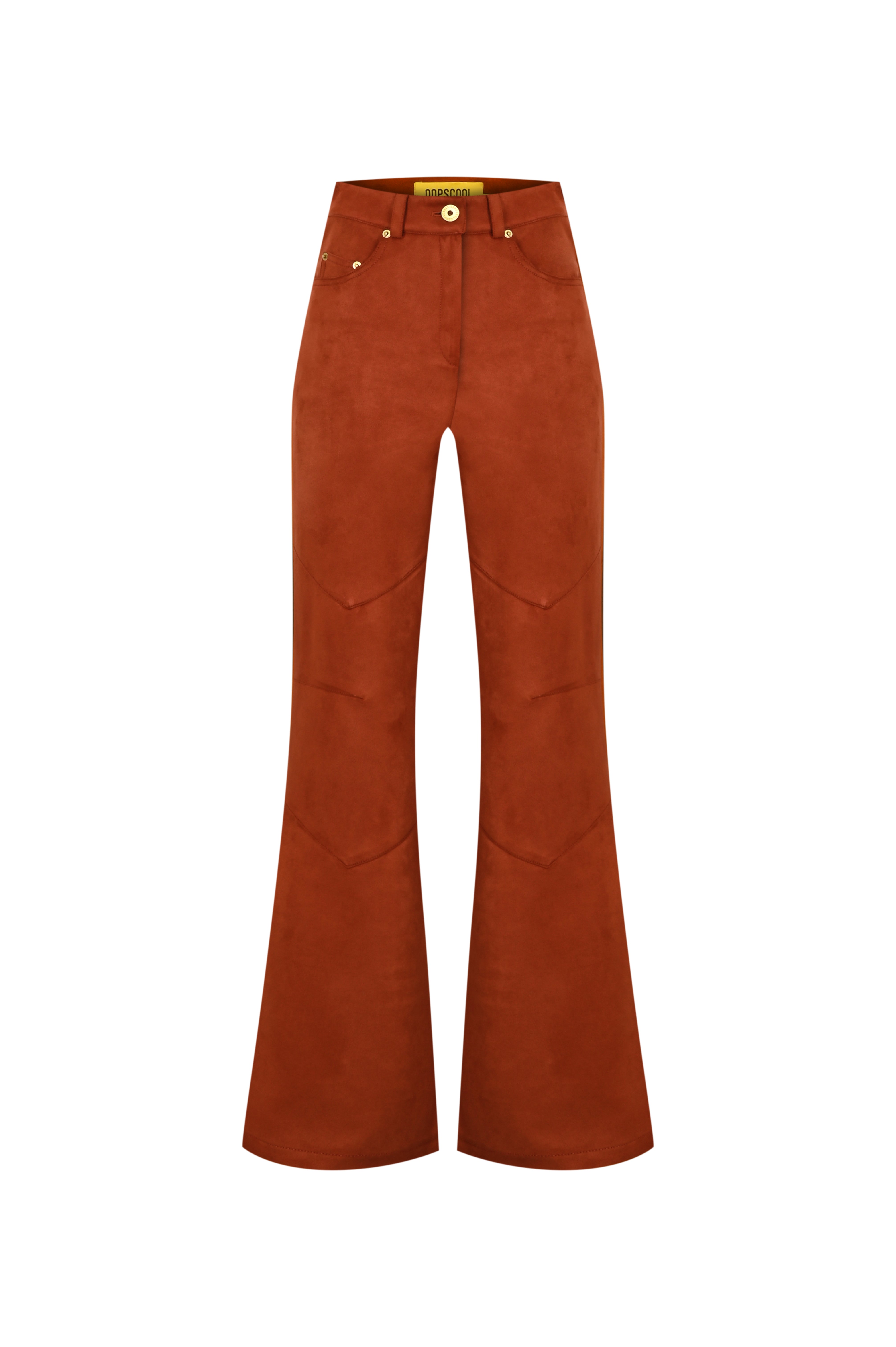 Pantalón acampanado de tiro alto confeccionado en suave tejido efecto ante, ofreciendo un tacto suave y una silueta estructurada y elegante.