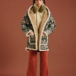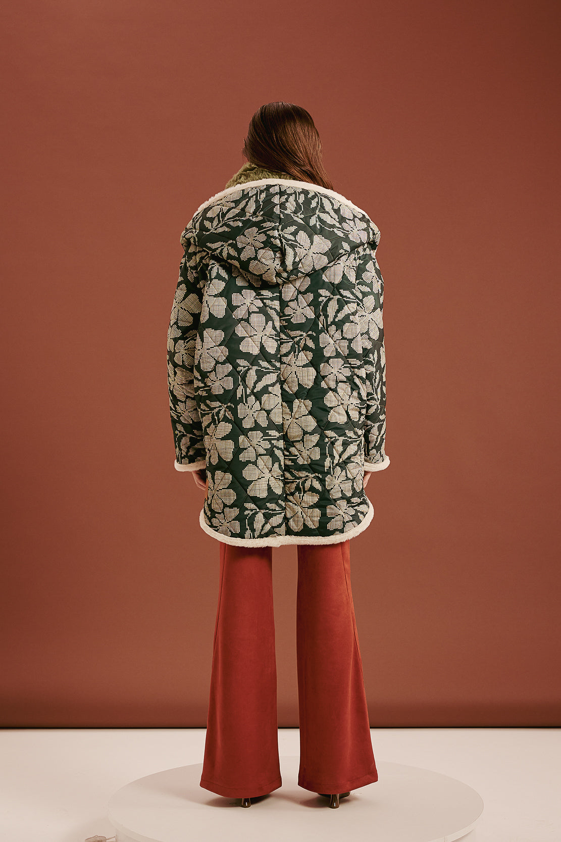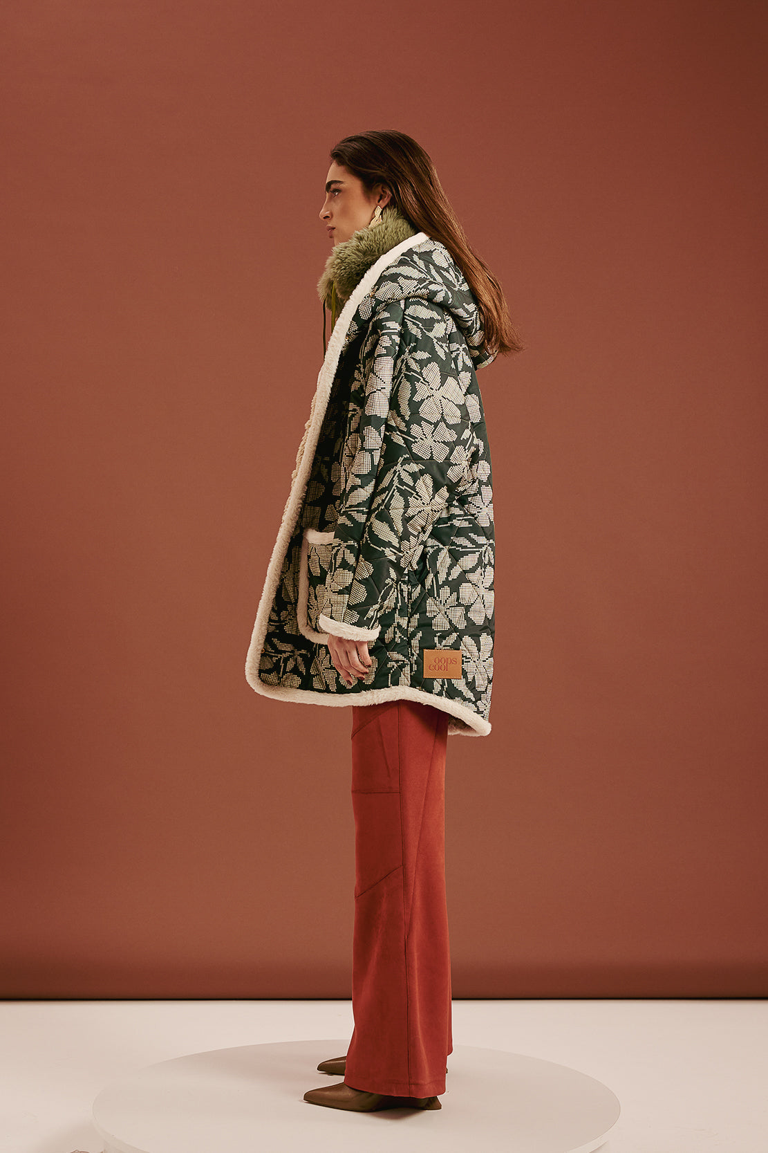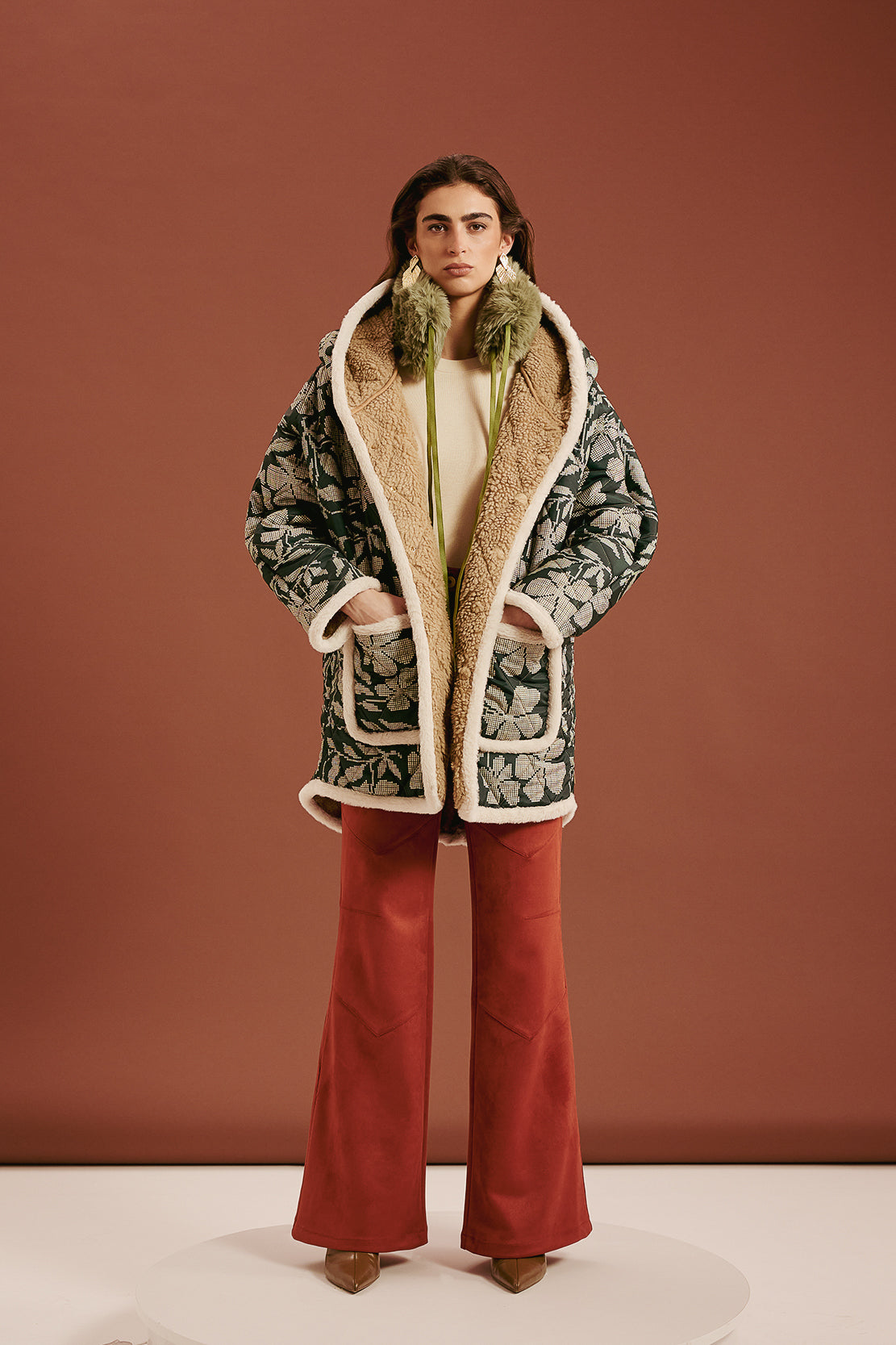 Pantalón acampanado de tiro alto confeccionado en suave tejido efecto ante, ofreciendo un tacto suave y una silueta estructurada y elegante.