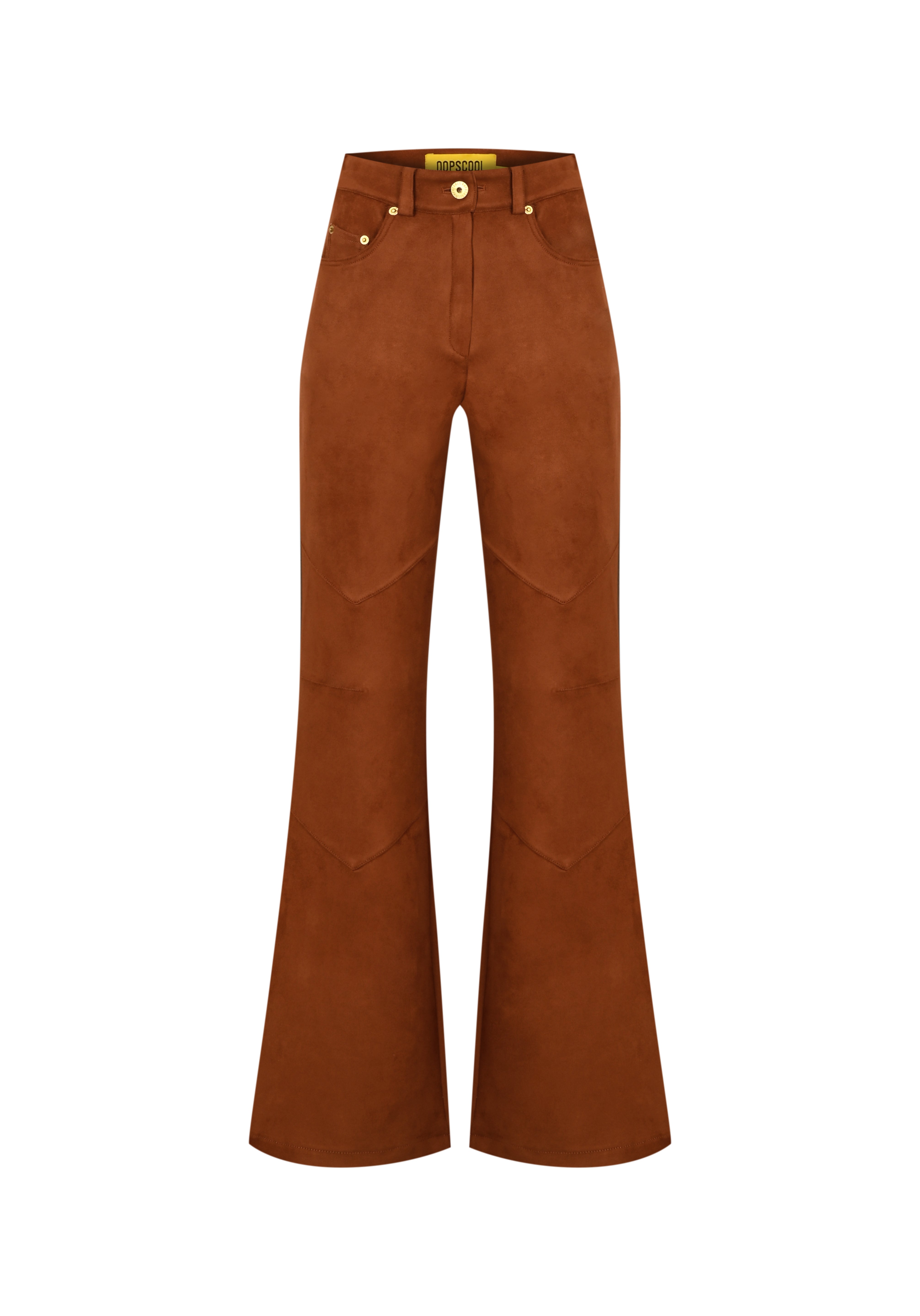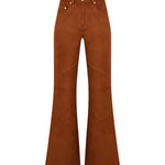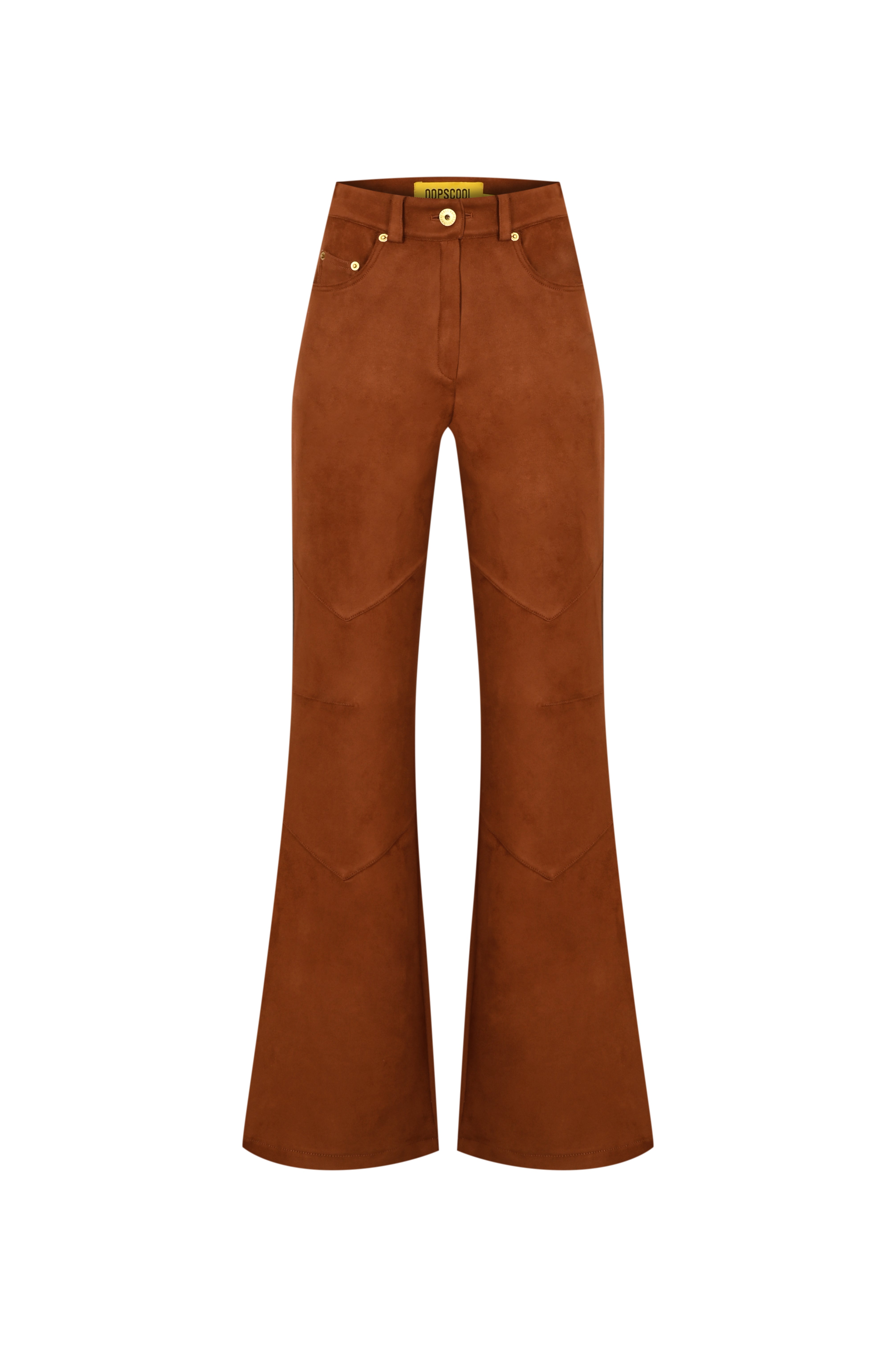 Pantalón acampanado de tiro alto confeccionado en suave tejido efecto ante, ofreciendo un tacto suave y una silueta estructurada y elegante.
