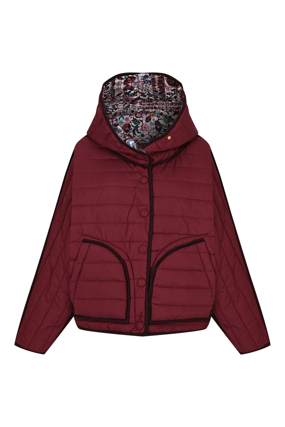 Chaqueta acolchada oversize reversible con capucha, detalles de ribetes, cierre con botones a presión y bolsillos interiores y exteriores, confeccionada en tejido impermeable.