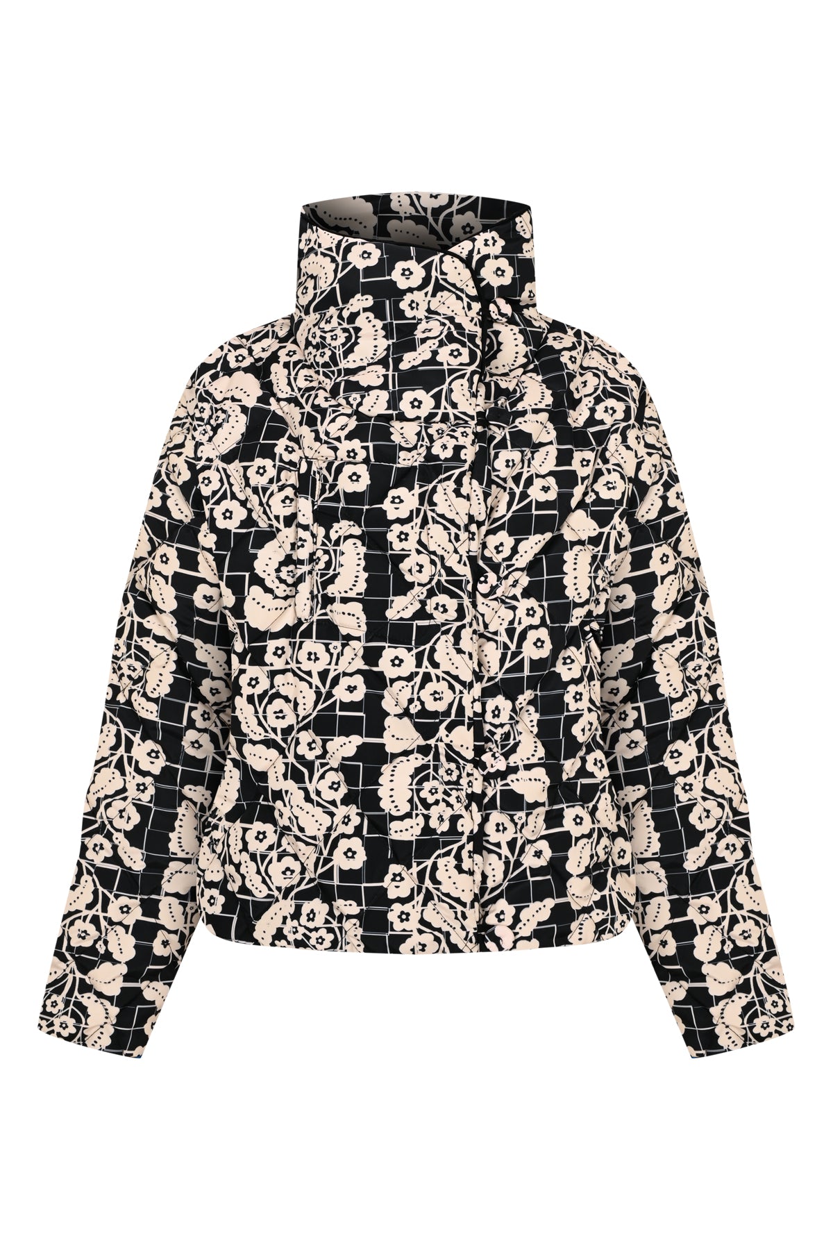 Chaqueta acolchada de cuello alto con cremallera y botones en la parte delantera y detalles de ribetes, confeccionada en tejido impermeable.